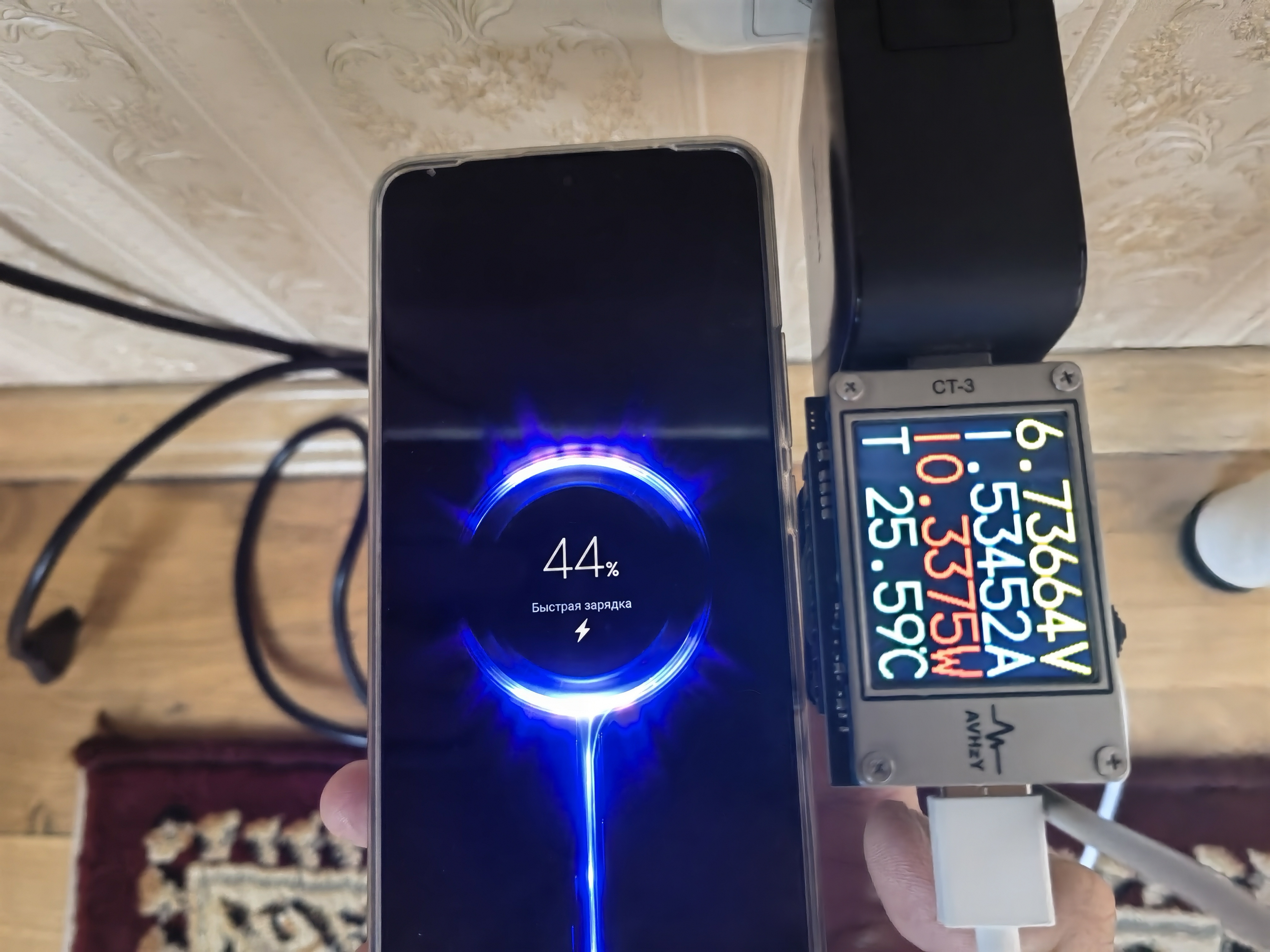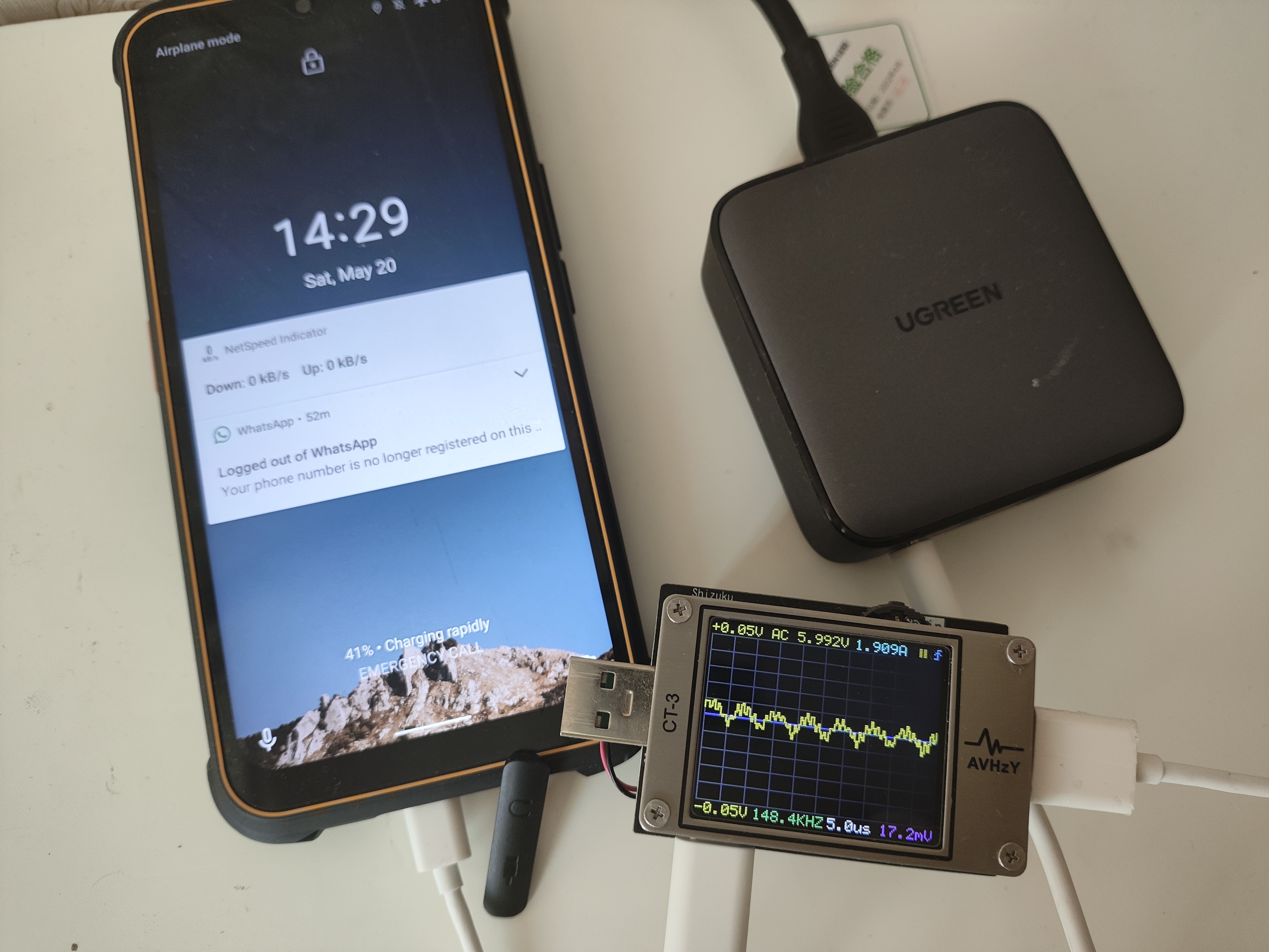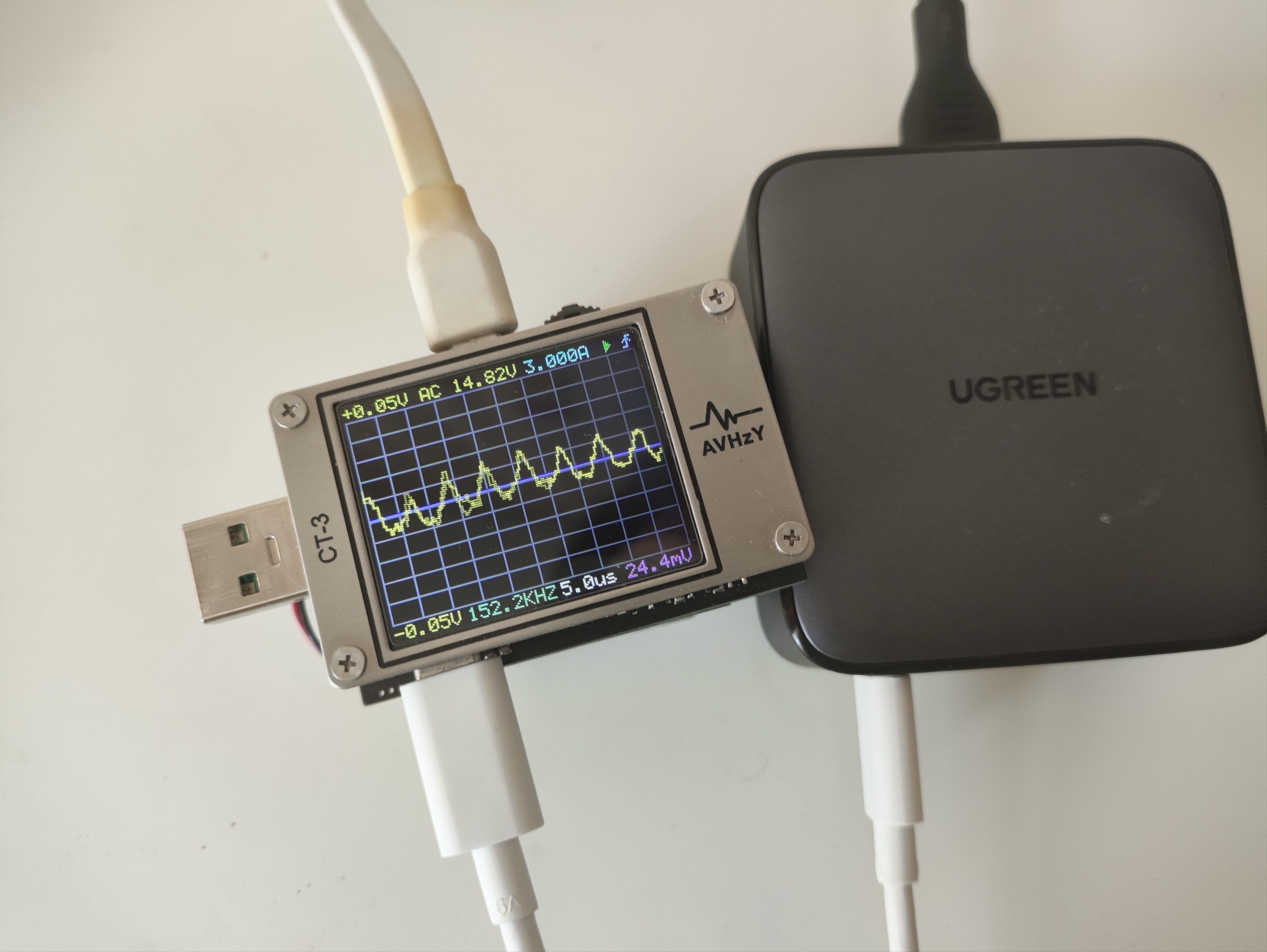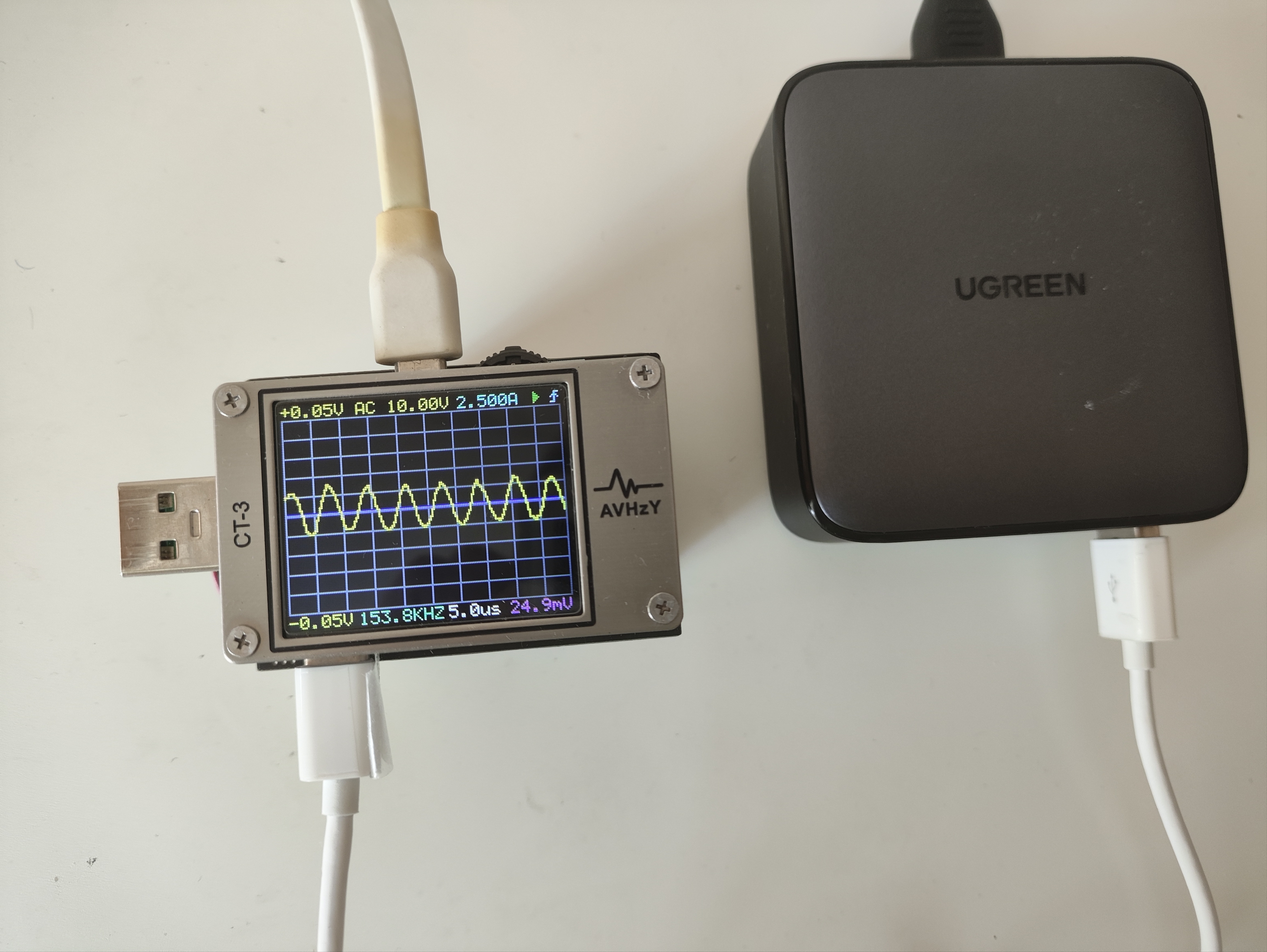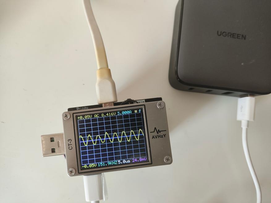 Пульсации оцениваются при помощи тестера AVHzY CT-3, как наиболее точного в этом плане устройства. В качестве нагрузки для оценки пульсаций выступают реальные потребители (внешние аккумуляторы и смарт-часы) на каждом из портов и по напряжениям 5, 9 и 20 В при близких к максимальным значениям силы тока по каждому.