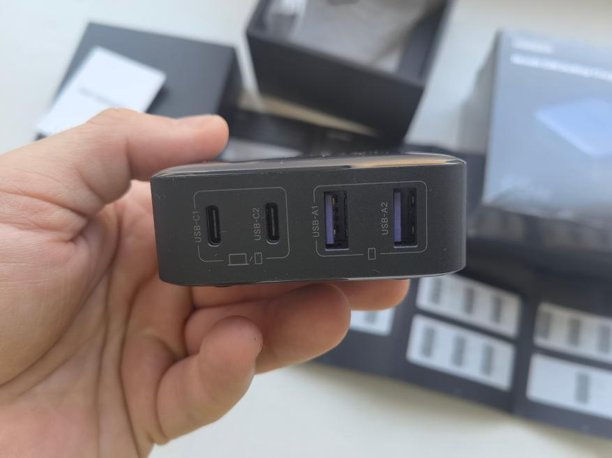 Зарядное устройство Ugreen CD327 имеет 4 выхода, по два USB-A и USB-C. Из особенностей, помимо 65Вт на каждом USB-C по отдельности, есть поддержка режима 10В/2,25А по каждому USB-A. Предыдущее ЗУ от Ugreen, CD296, не поддерживает такой режим. Этот режим даёт возможность быстро заряжать смартфоны Xiaomi на Mi Turbo Charge.
