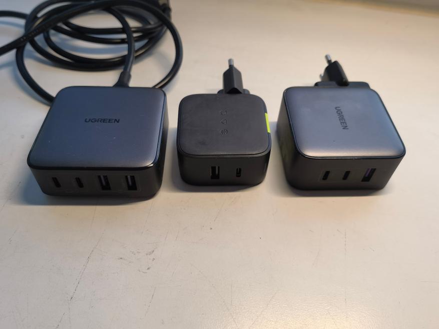 На следующей фотографии показаны три зарядных устройства, которые будут сравниваться между собой по нагреву. Это Ugreen CD327 и InfinityLab ILINK65W (обзор здесь), Ugreen CD296 (обзор здесь). Форма модели на обзоре отличается от привычных, ее размеры — 71х29х74,5 мм, объём — 153 см³. Для сравнения, объемы InfinityLab ILINK65W и Ugreen CD296 — 88 и 139 см³. Иными словами, четвертый порт по сравнению с последней стоил 14 см³