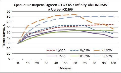 Из сравнения линий нагрева видно, что обозреваемая ЗУ с большим объемом, чем две другие, имеет меньший нагрев. Разница в нагреве в самой горячей точке с аналогом от Ugreen — примерно 10⁰С, с InfinityLab — 30⁰C.