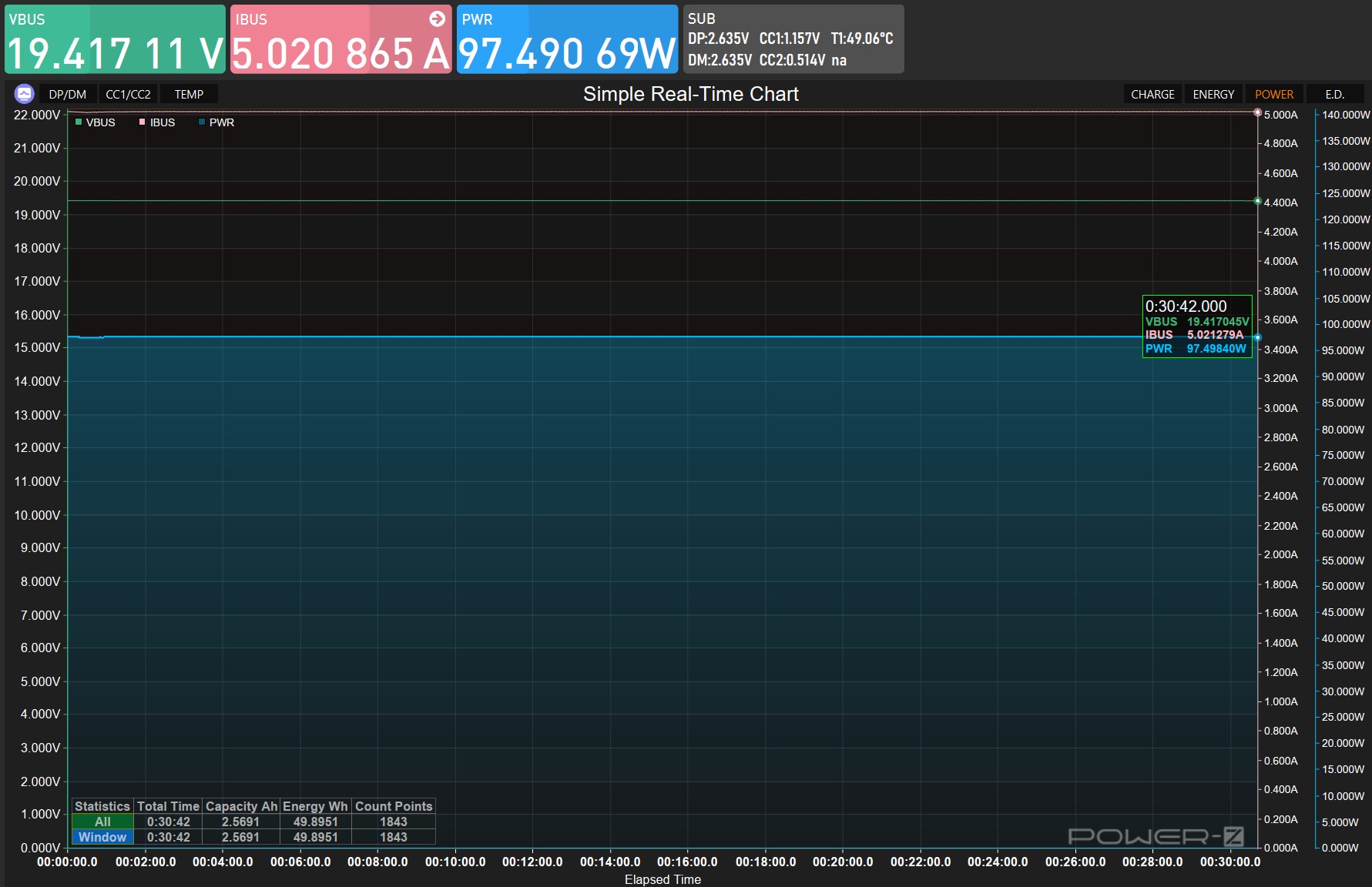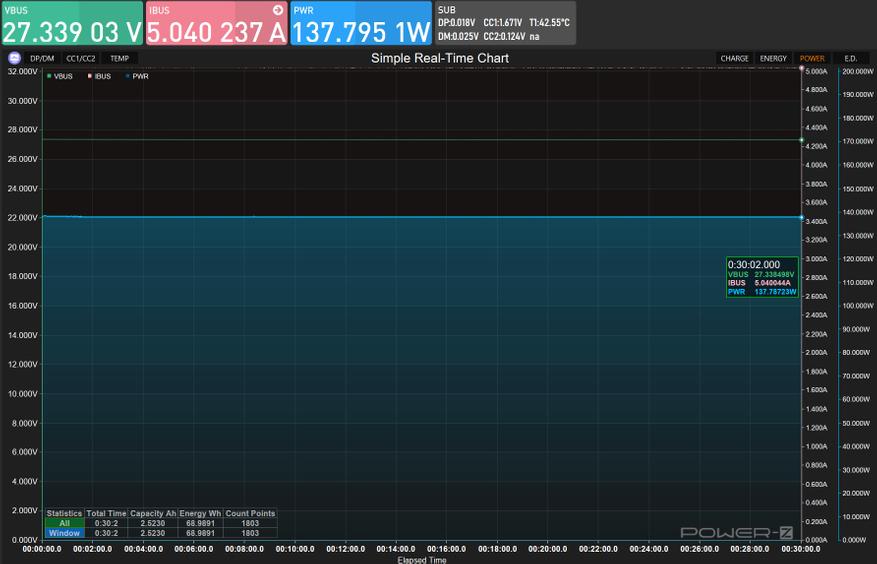 Порты Type-C1 и Type-C2/C3 подтвердили свою способность работать на заявленных высоких мощностях, демонстрируя при этом отличную стабильность напряжения. Запас по мощности в 10-15% со стабильным и чистым питанием на таких уровнях мощности являются сильным показателем качества.