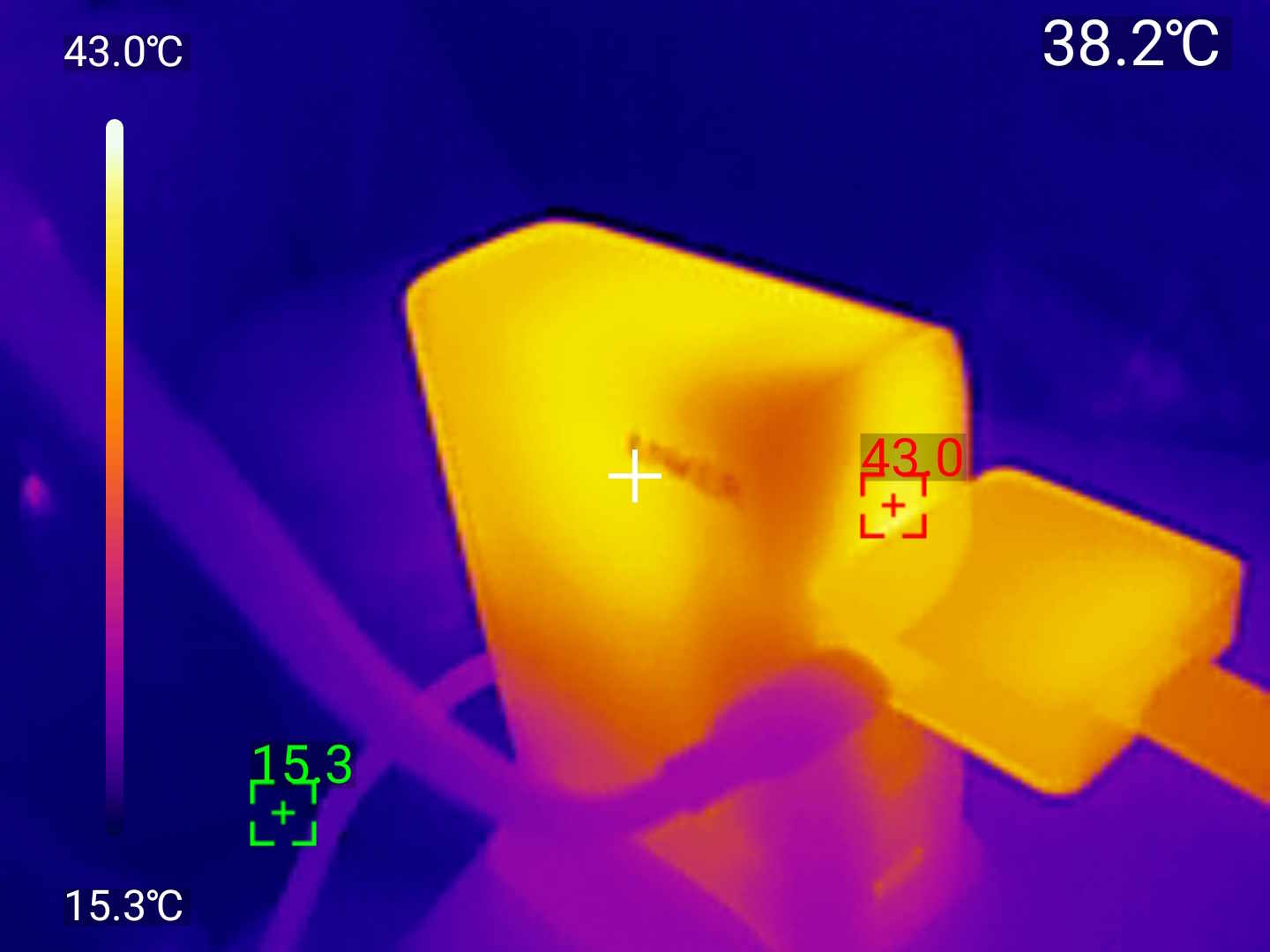 При полной нагрузке первого интерфейса (140W) корпус ощутимо тёплый, но не горячий. Температура корпуса по показаниям тепловизора держится в районе 38-40°C, что очень мало для GaN-зарядки такой мощности. Встроенный вентилятор отсутствует — охлаждение пассивное, что делает устройство абсолютно бесшумным.