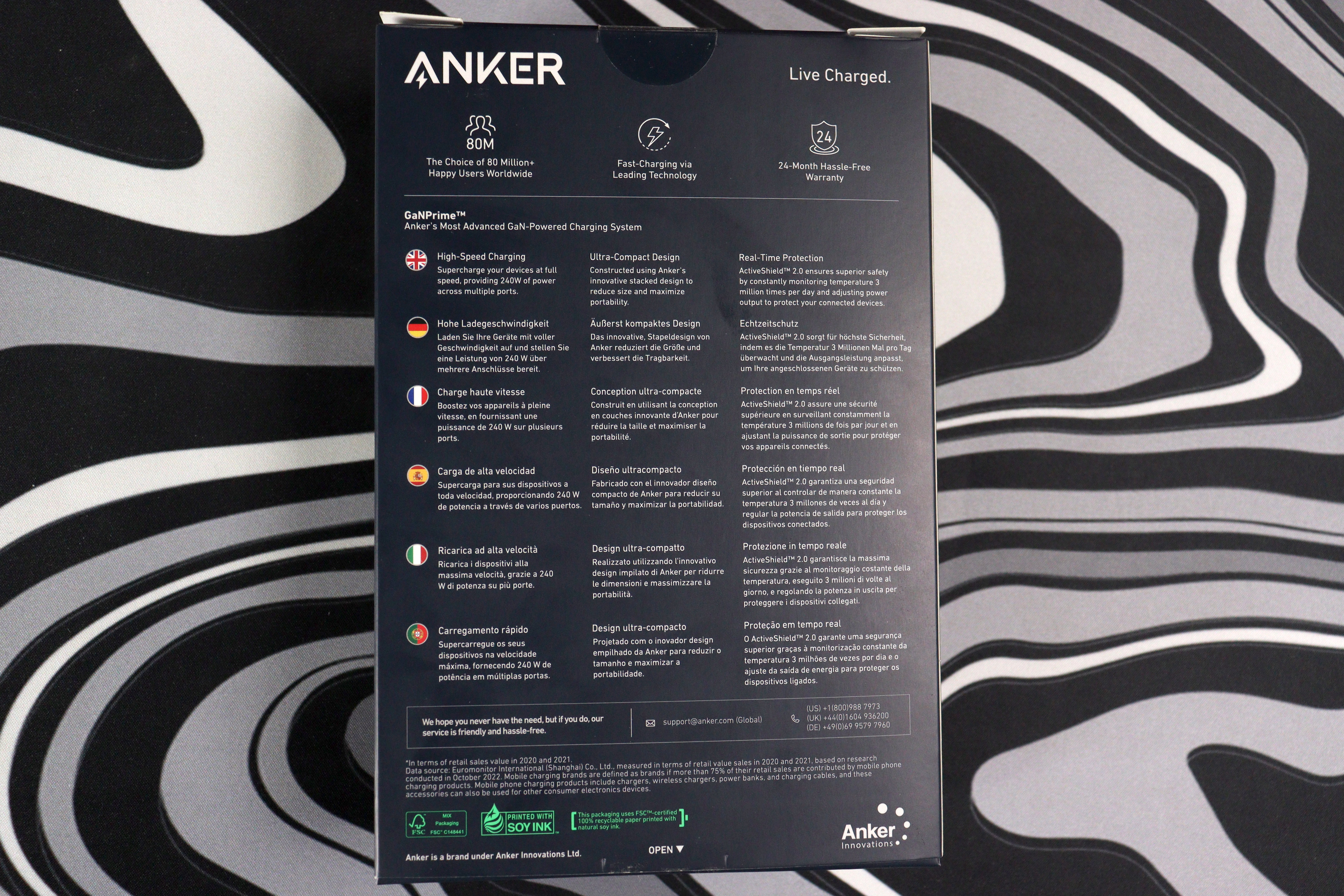В коробке всё строго по делу: само зарядное устройство, несъёмный кабель питания (у меня вариант с британской вилкой), инструкция и гарантийный талон на 24 месяца и металлическая подставка. Никаких USB-кабелей в комплекте нет — Anker справедливо полагает, что у вас их и так достаточно. Упаковка минималистичная, с акцентом на технологию GaNPrime и быструю зарядку.