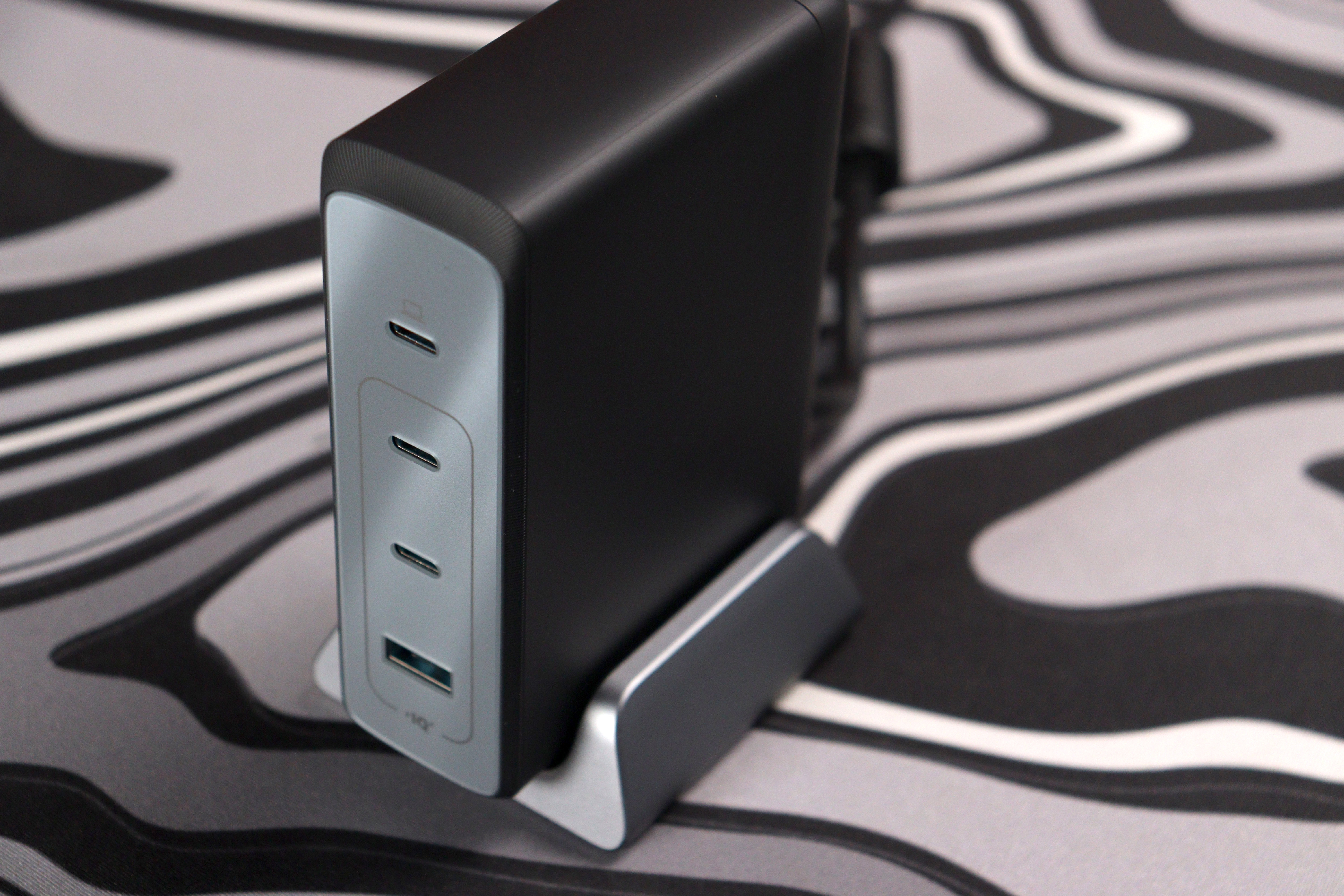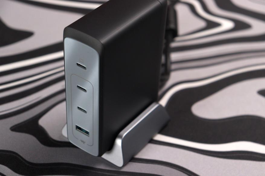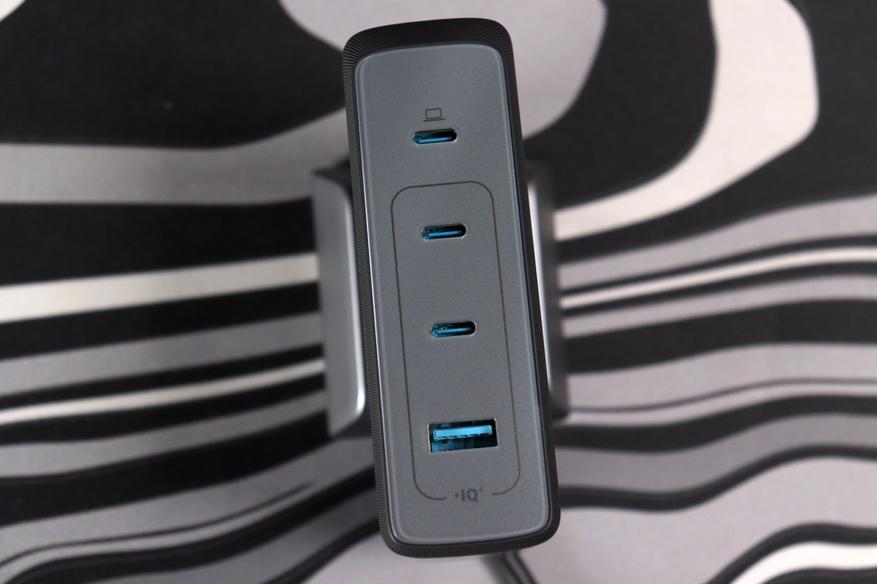 Устройство выполнено в двухцветной гамме: чёрный матовый корпус с серебристыми боковинами. Форм-фактор вертикальный, с подставкой — зарядка стоит на столе, как небольшая башенка. На фронтальной панели расположены четыре порта: три USB-C и один USB-A. Сверху напечатан логотип Anker и маркировка GaNPrime. Корпус пластиковый с резиновой структурой, но собран без люфтов. Габариты довольно компактные, особенно если сравнивать с аналогами.