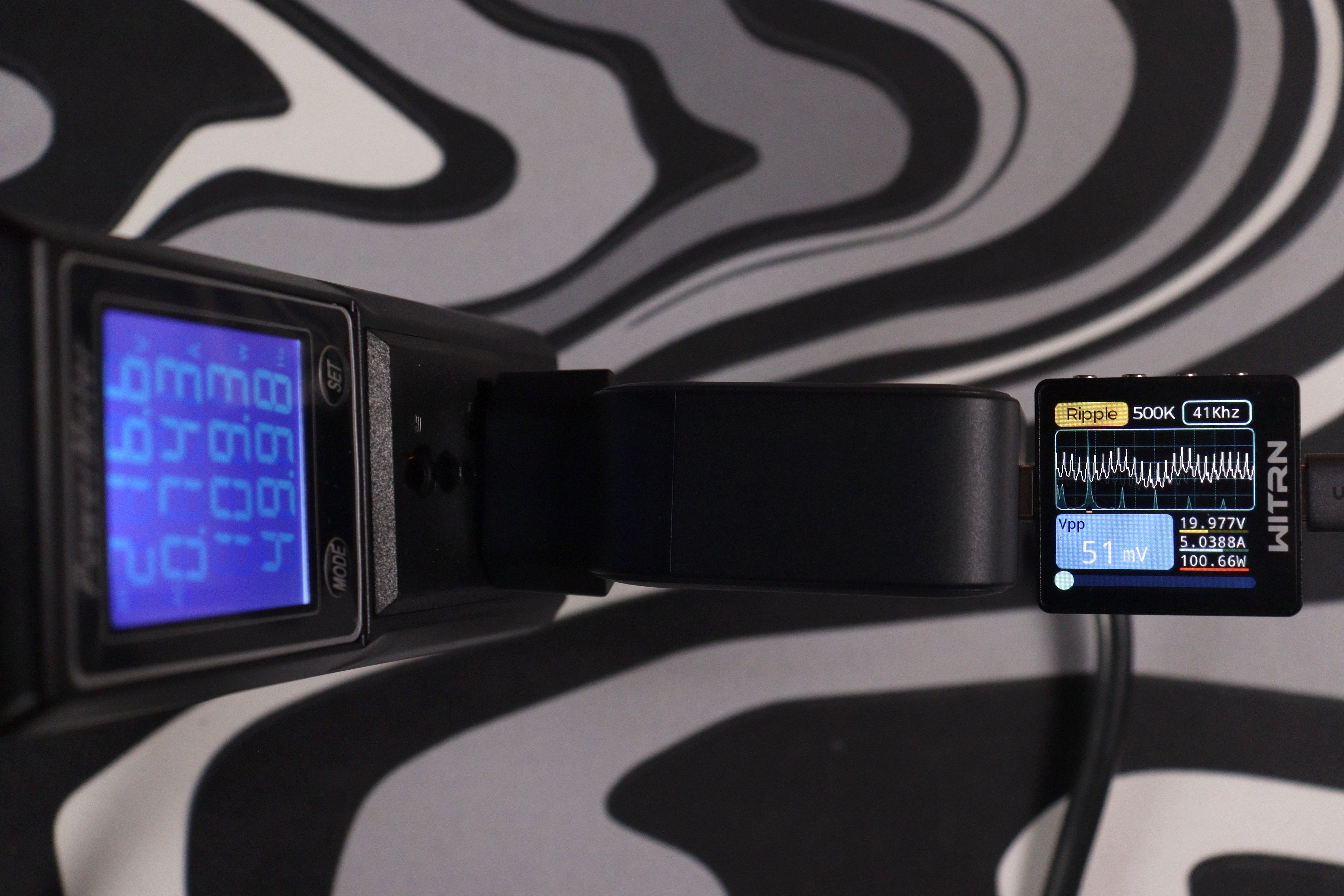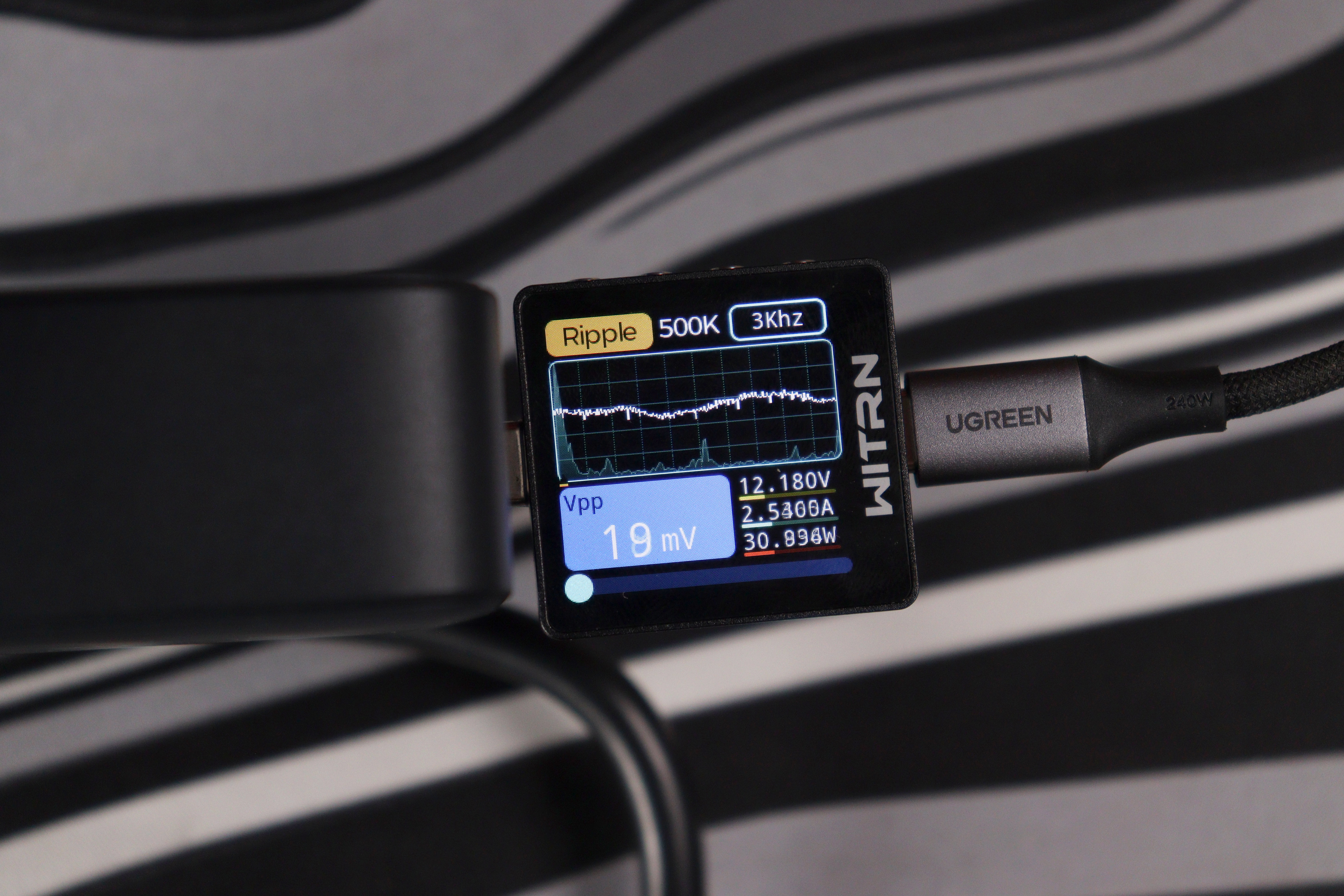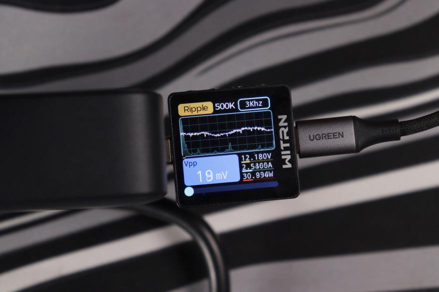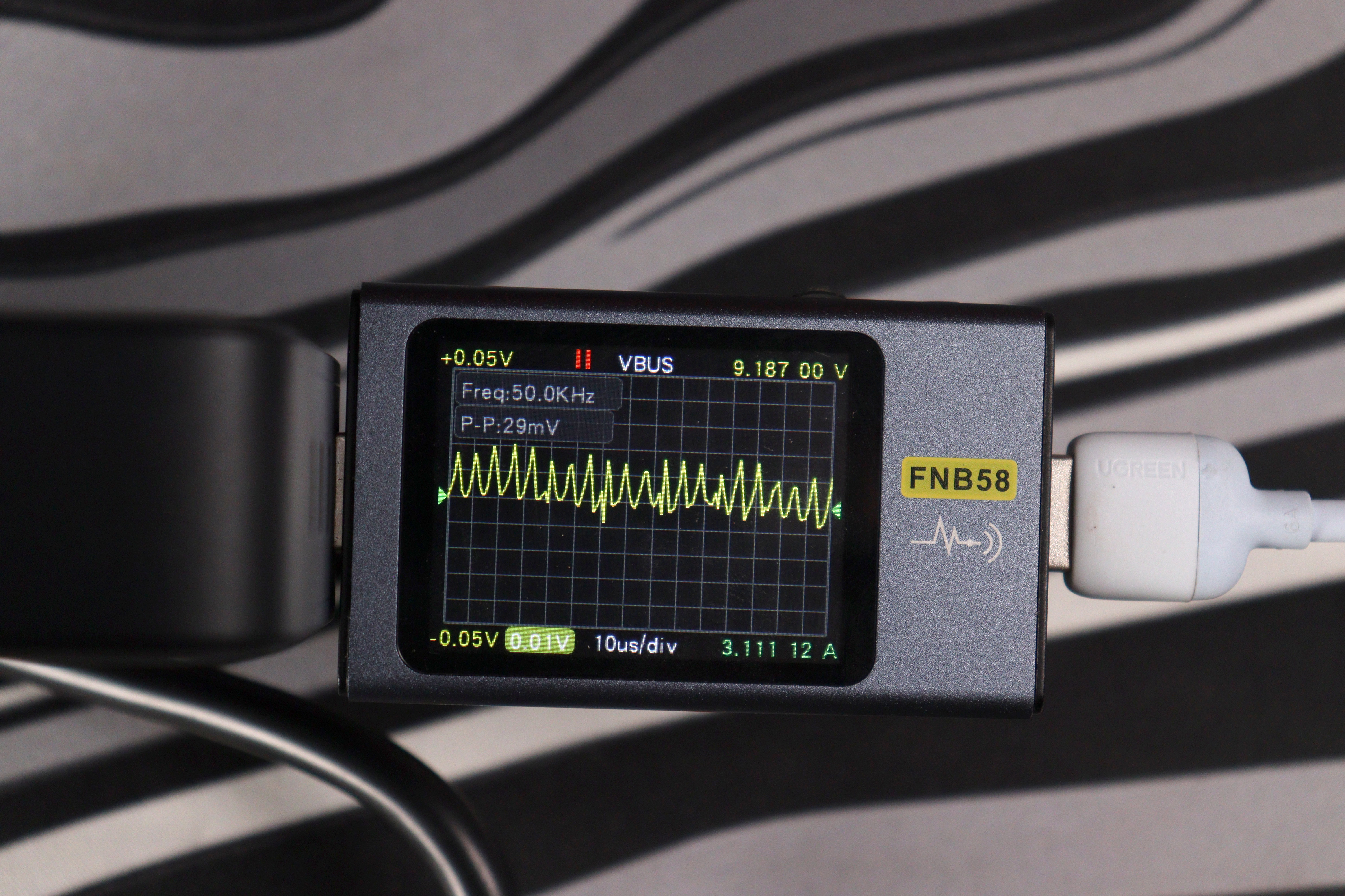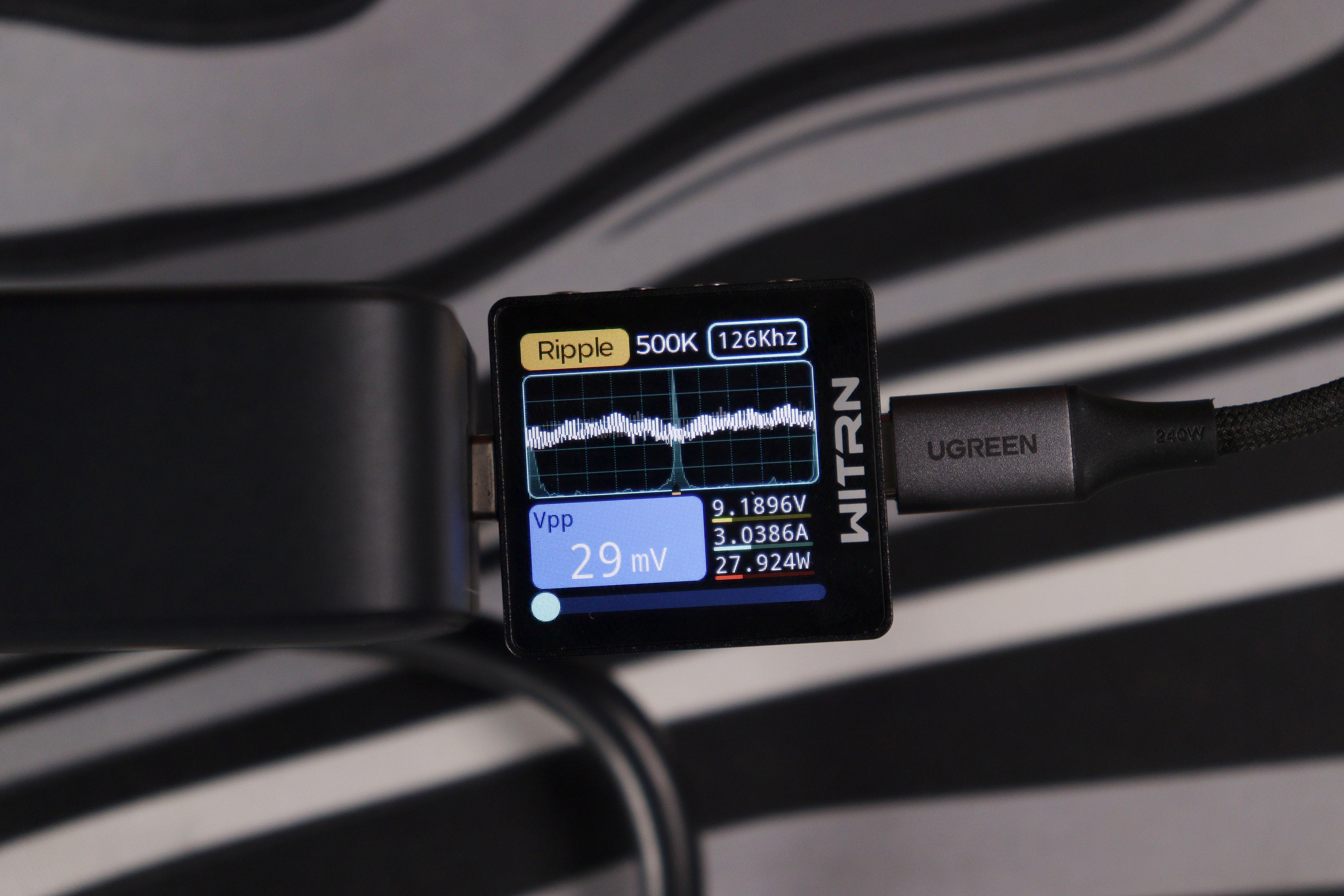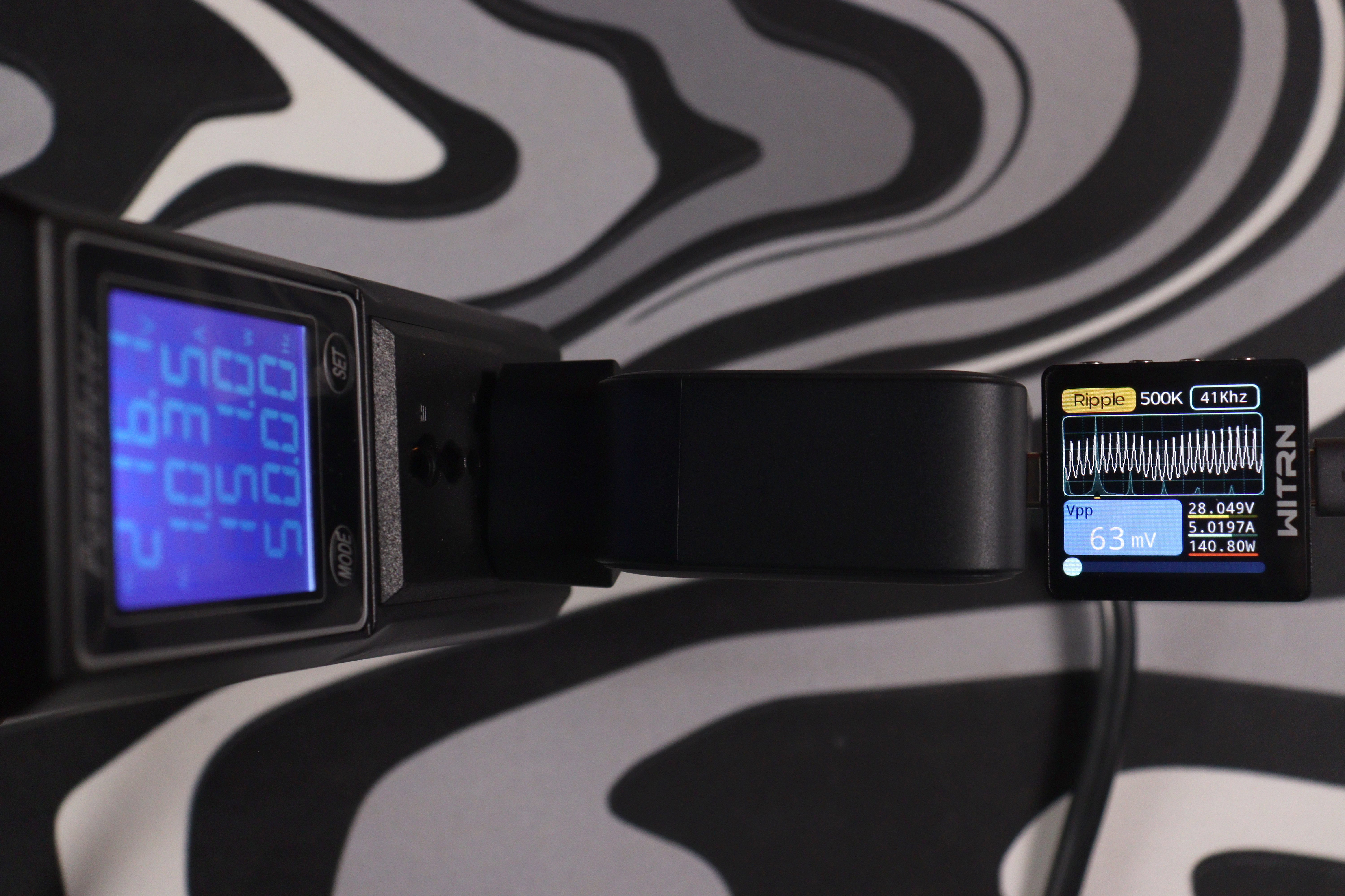 Во всех режимах работы, включая максимальные 28 В / 5 А (140.8 Вт) для Type-C1/C2, зафиксированы исключительно низкие значения пульсаций напряжения, которые варьируются от 23 мВ до 63 мВ. Эти показатели значительно ниже принятых стандартов, что гарантирует максимально чистое и безопасное питание для самой чувствительной техники. Фактическое выходное напряжение на каждом режиме (например, 19.977В при номинале 20В, 28.049В при номинале 28В) показывает, что зарядное устройство поддерживает небольшой запас мощности, составляющий примерно 0.2-2.3% выше номинала в большинстве режимов, что положительно сказывается на эффективности зарядки под нагрузкой. Таким образом, зарядное устройство демонстрирует превосходное качество сборки и стабилизации, подтверждая заявленные характеристики и обеспечивая высокую надежность.