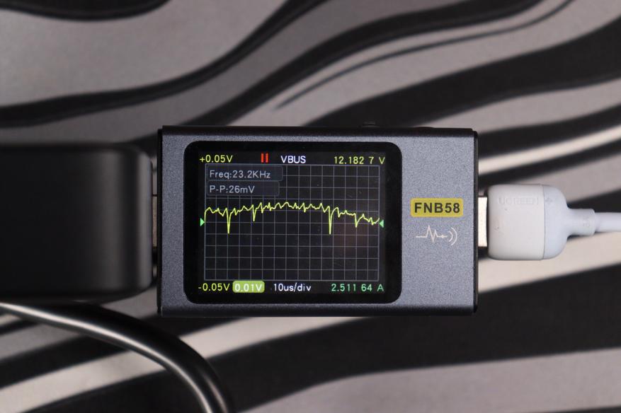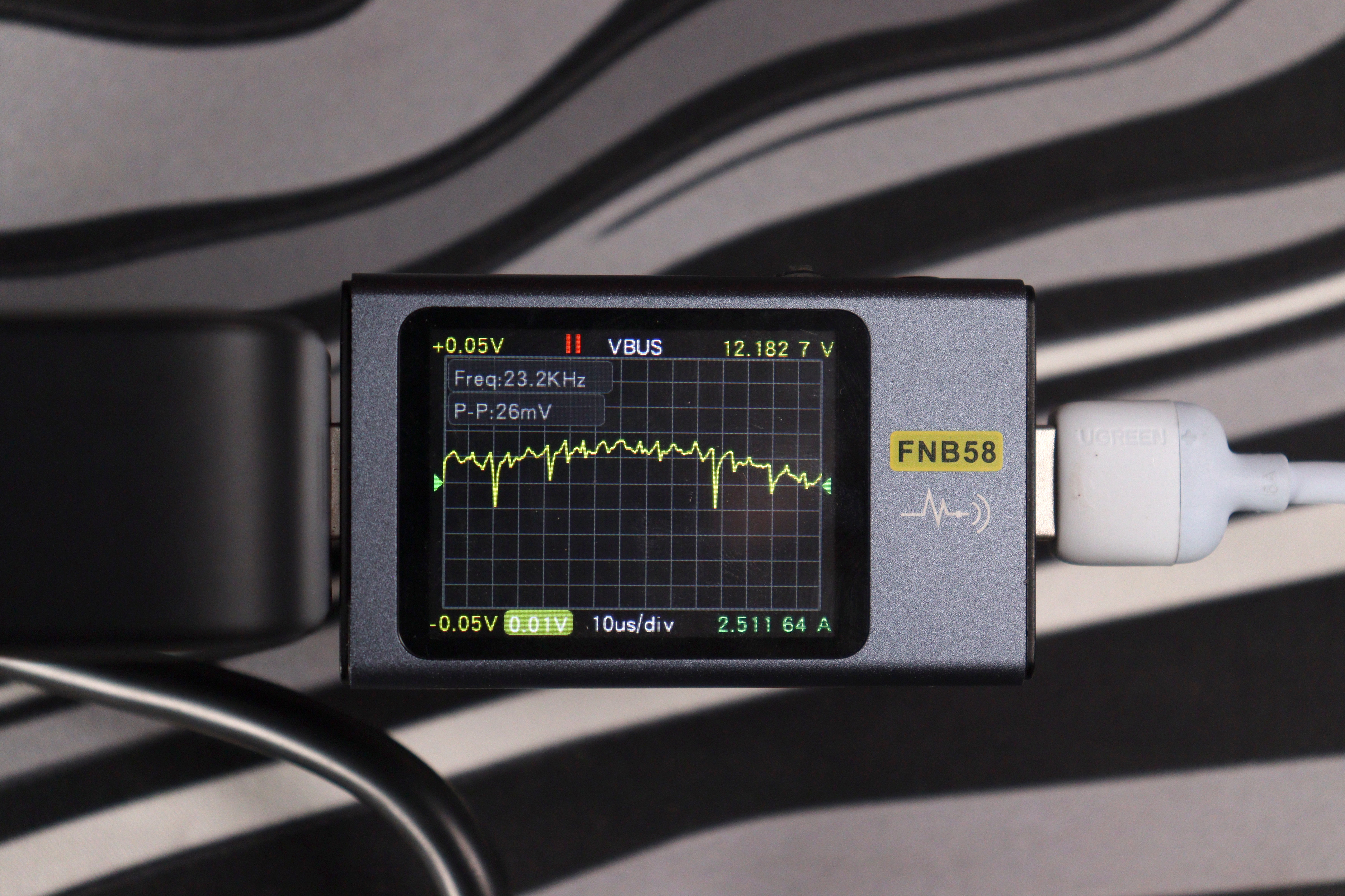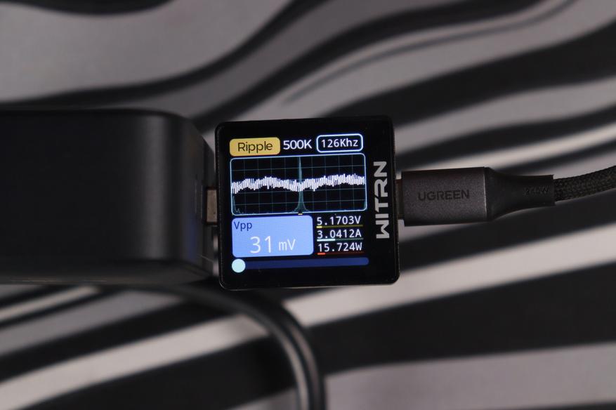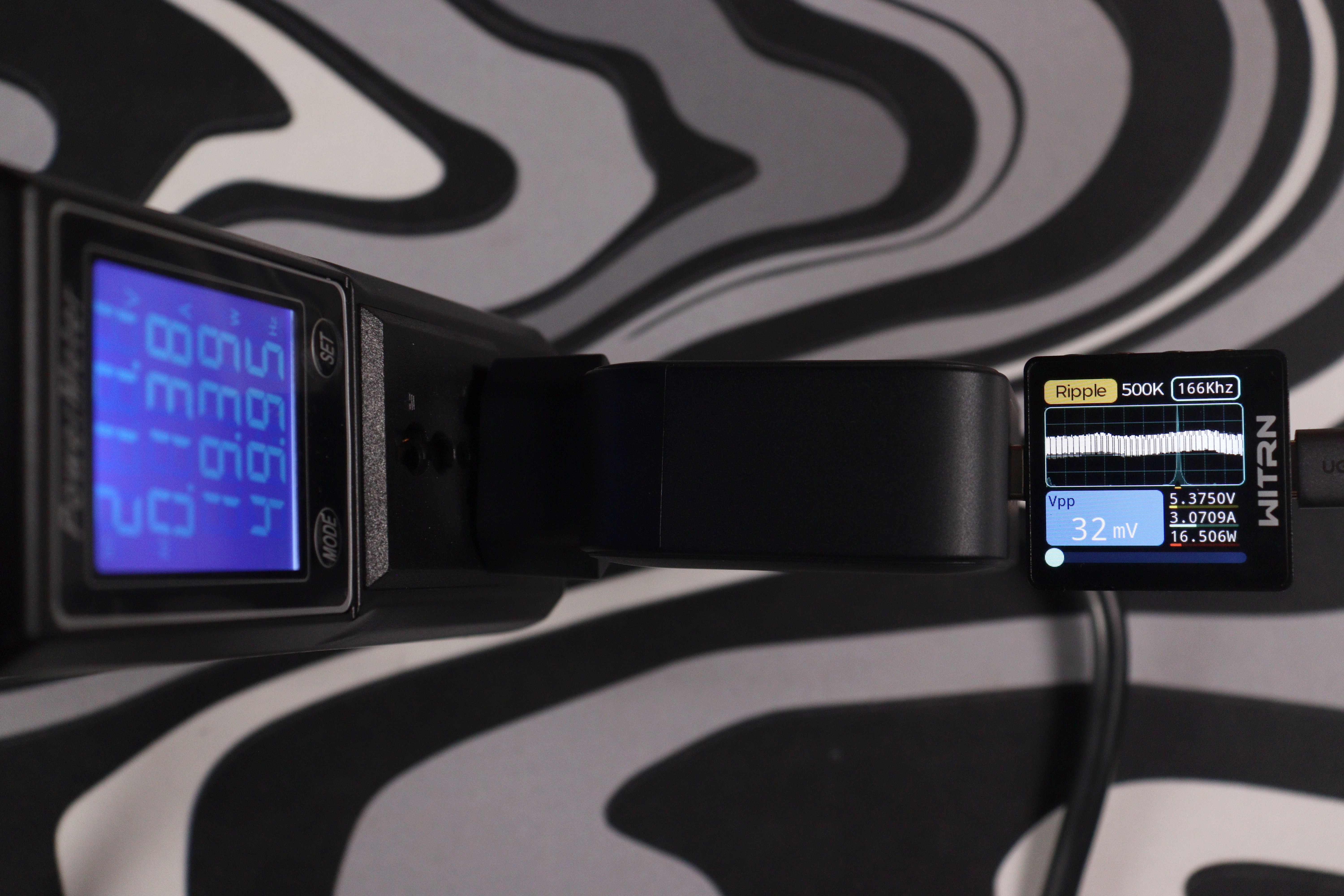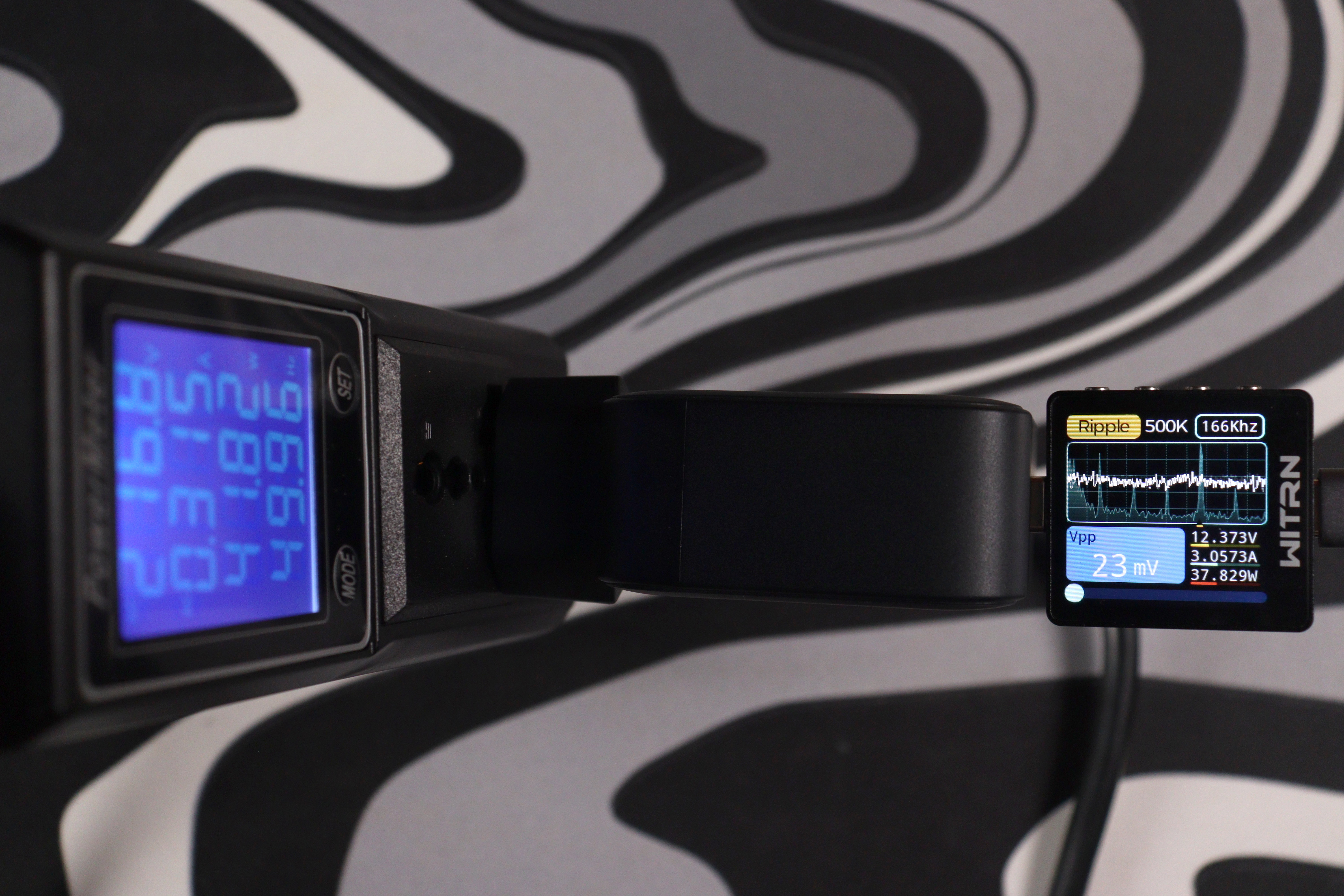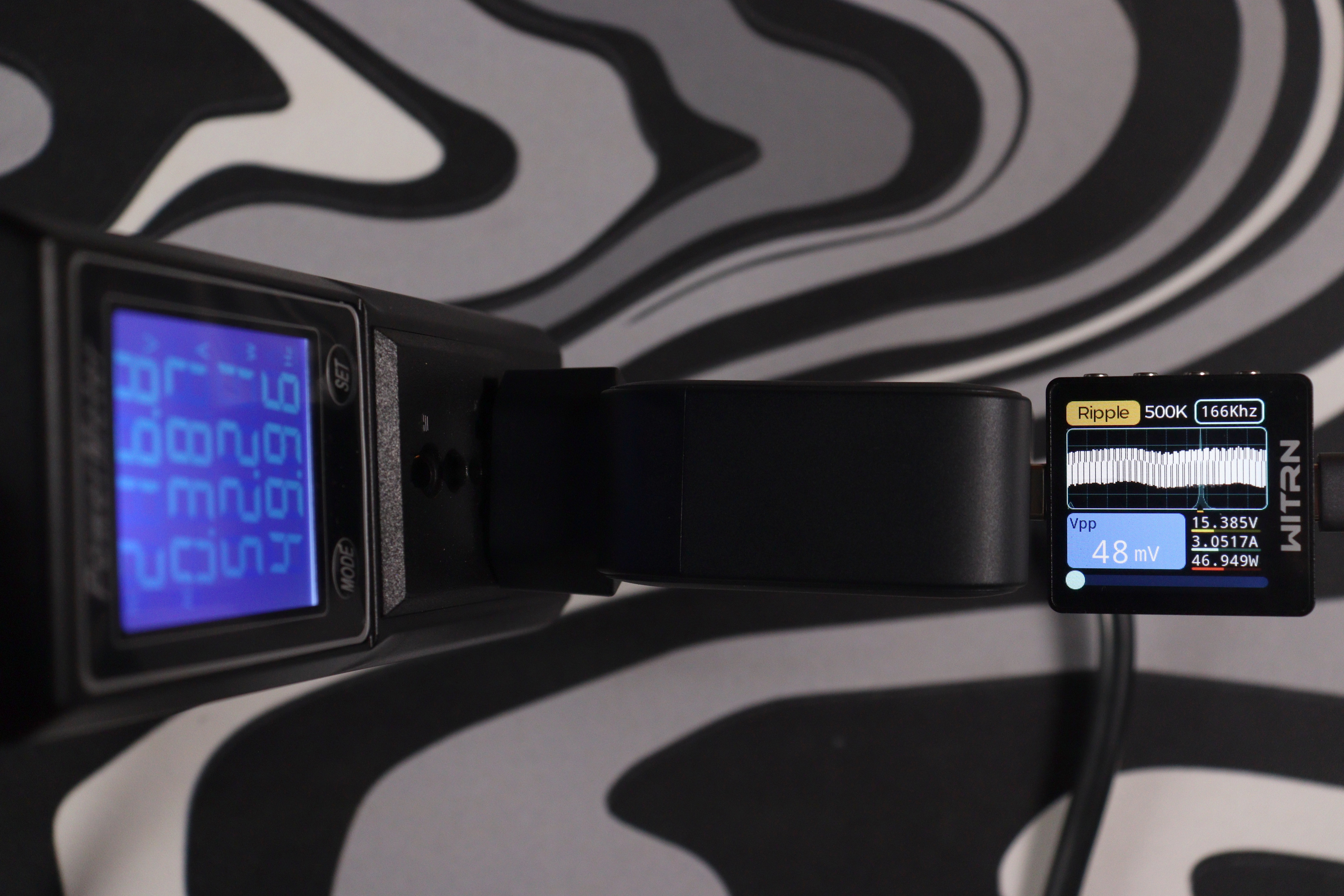 Во всех режимах работы, включая максимальные 28 В / 5 А (140.8 Вт) для Type-C1/C2, зафиксированы исключительно низкие значения пульсаций напряжения, которые варьируются от 23 мВ до 63 мВ. Эти показатели значительно ниже принятых стандартов, что гарантирует максимально чистое и безопасное питание для самой чувствительной техники. Фактическое выходное напряжение на каждом режиме (например, 19.977В при номинале 20В, 28.049В при номинале 28В) показывает, что зарядное устройство поддерживает небольшой запас мощности, составляющий примерно 0.2-2.3% выше номинала в большинстве режимов, что положительно сказывается на эффективности зарядки под нагрузкой. Таким образом, зарядное устройство демонстрирует превосходное качество сборки и стабилизации, подтверждая заявленные характеристики и обеспечивая высокую надежность.