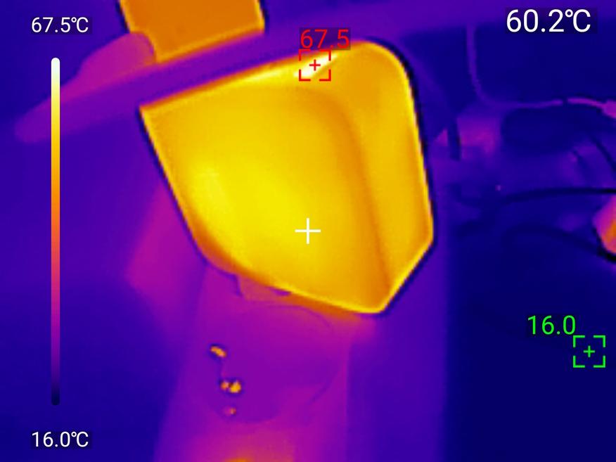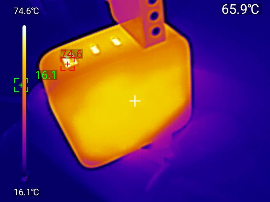 Термограмма после 30 минут работы на максимальной мощности (140W) показала температуру корпуса около 66°C в самой горячей точке. При такой температуре держать зарядку в руках некомфортно, но для длительной работы это допустимо — встроенная защита не дает перегреться компонентам, тем самым снижая мощность до 100Вт.