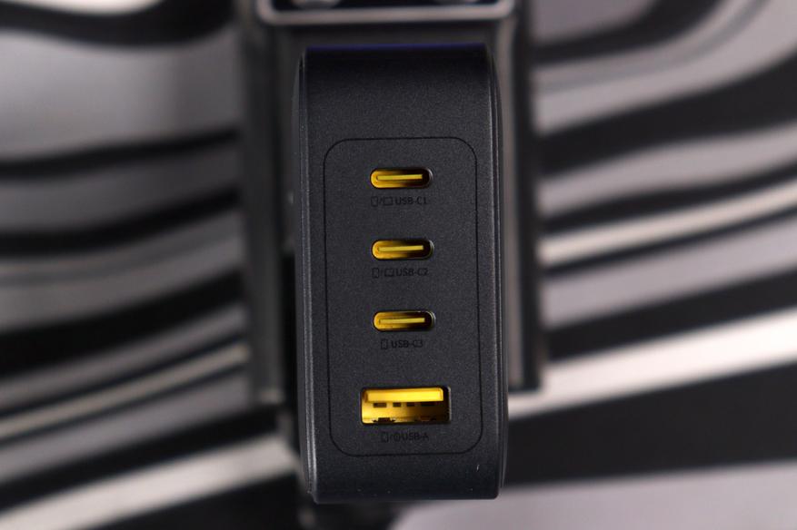 На лицевой стороне расположены четыре порта: три USB-C и один USB-A. Все порты маркированы желтыми контактами — приятная деталь, упрощающая подключение в темноте. Вилка европейского стандарта интегрирована в корпус и складывается для удобства транспортировки.