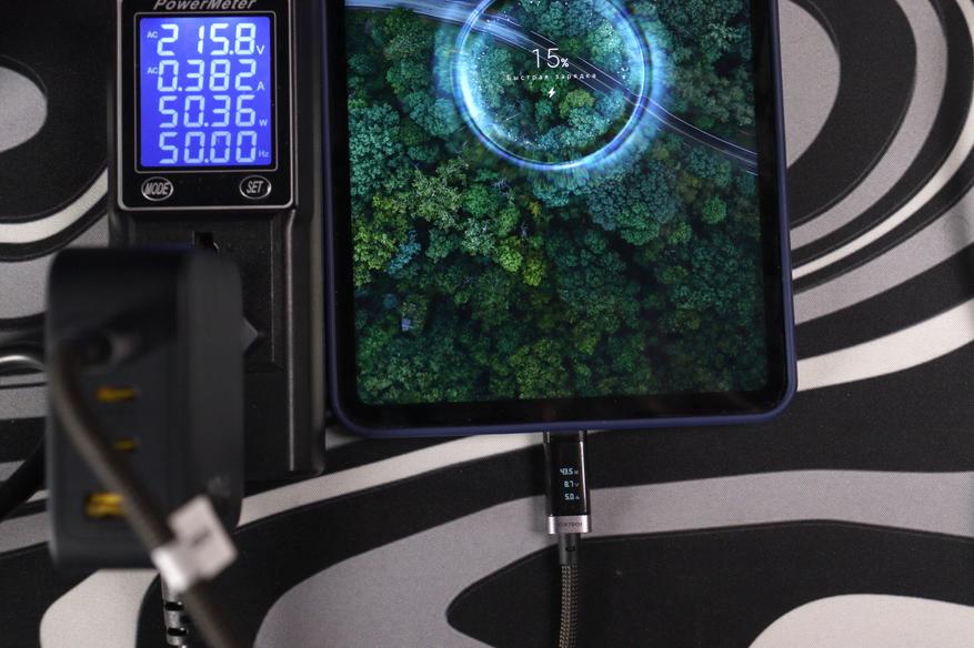 Во время испытаний с планшетом Xiaomi кабель Cuktech, поддерживающий ток до 6 А, смог выдать максимальную для данного устройства мощность — 45 Вт. Ускорить процесс зарядки невозможно, поскольку для более высоких показателей требуется фирменный стандарт Mi Turbo Charge.