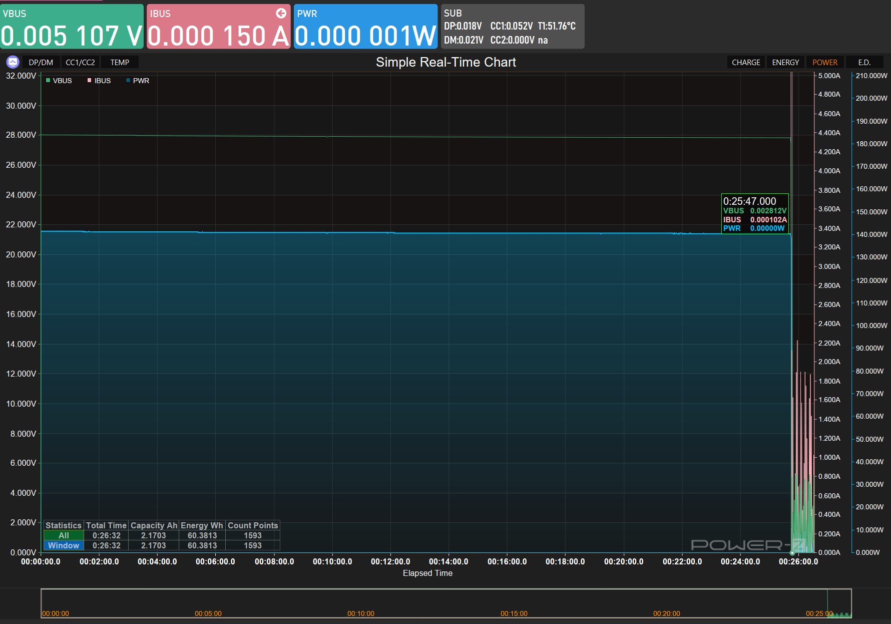 Интересный момент: после 29 минут непрерывной работы на максимуме срабатывает защита, и мощность ограничивается до 65W. График четко показывает — резкое падение с 140W ровно на 26-й минуте. Это термопротекция в действии: зарядка не может постоянно держать пиковую мощность и переходит в режим охлаждения.