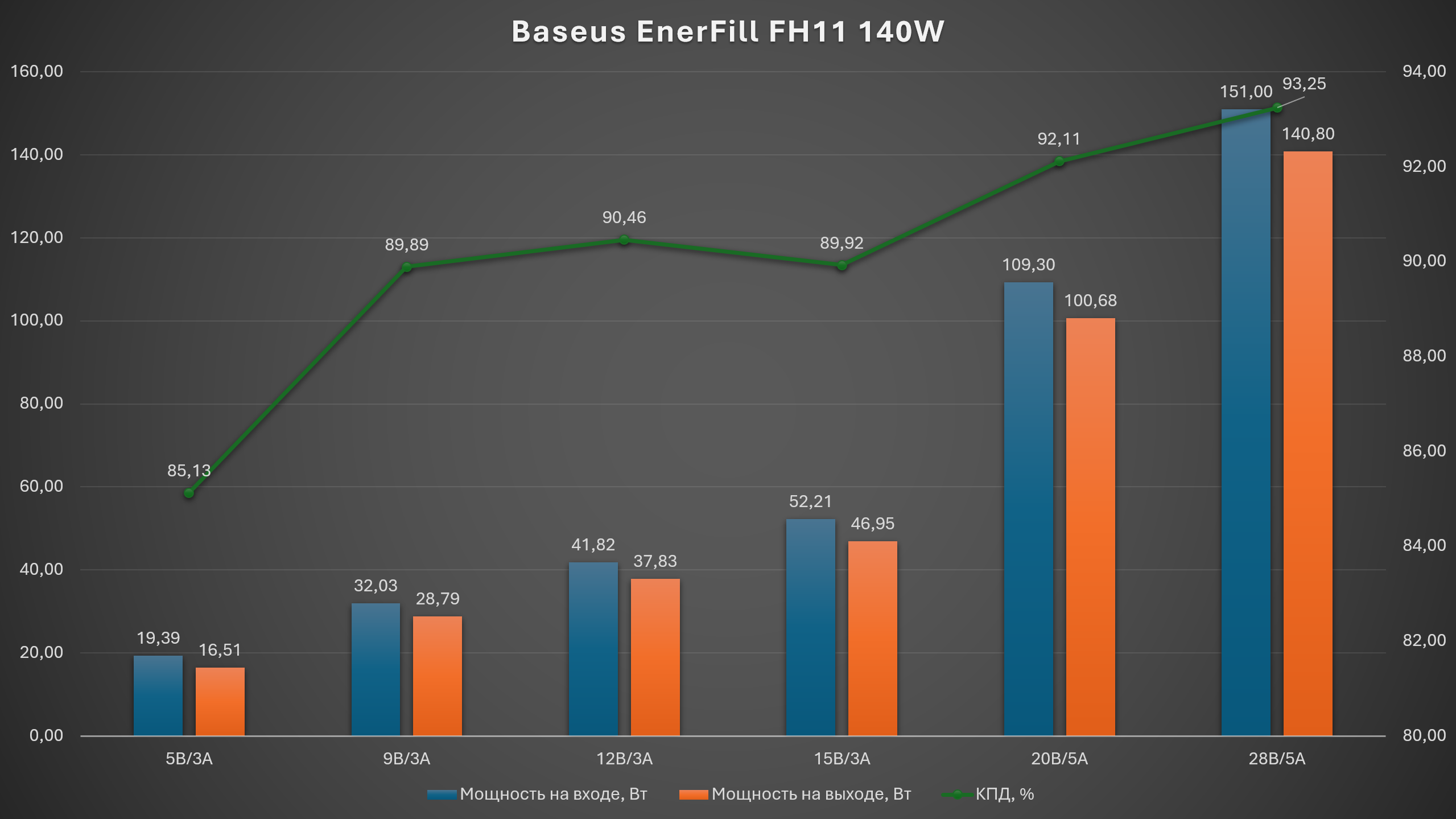 Эффективность преобразования зарядного устройства Baseus EnerFill FH11 140W продемонстрировала весьма неплохие показания во всем диапазоне нагрузок. При низких нагрузках, таких как 5В/3А (16.5Вт), КПД составляет 85.13%, что является хорошим показателем для начала работы. По мере увеличения мощности, эффективность быстро растет, достигая более 90% в режимах средней мощности, например, 90.46% при 12В/3А (37.8Вт). Максимальный КПД был зафиксирован в режиме полной мощности 28В/5А (140.8Вт), достигнув 93.25%. Столь высокая эффективность преобразования минимизирует потери энергии в виде тепла, но даже с такой высокой эффективностью зарядное перегревается на своей максимальной мощности.