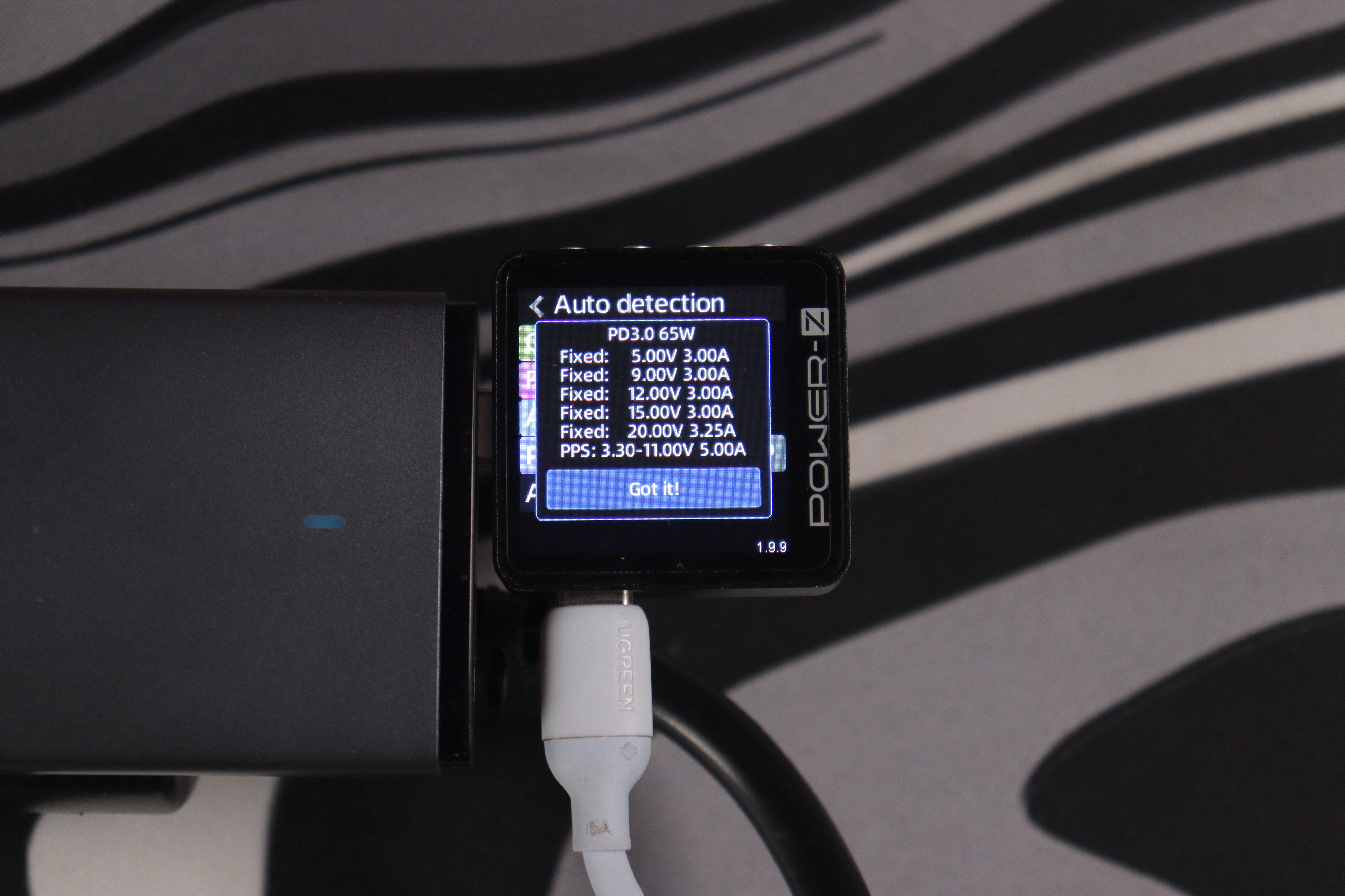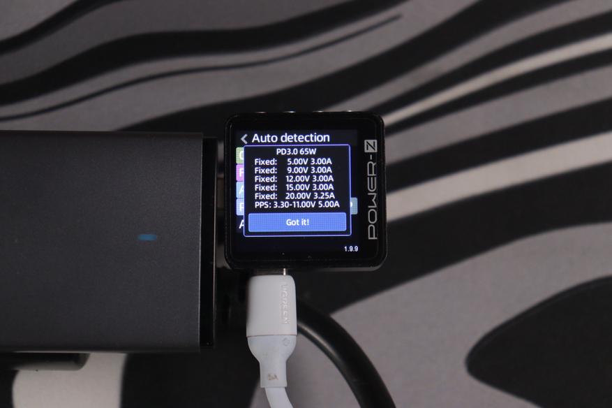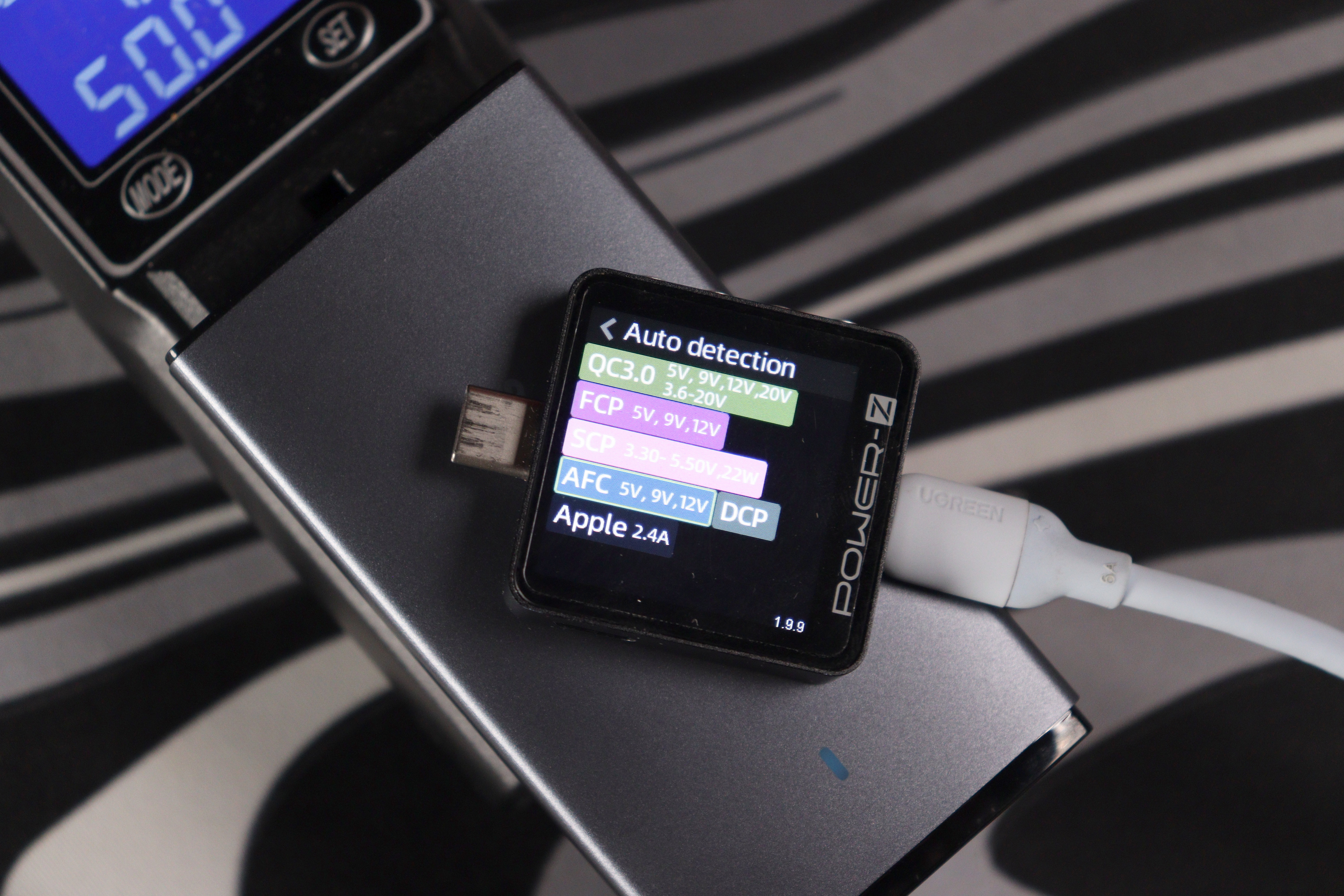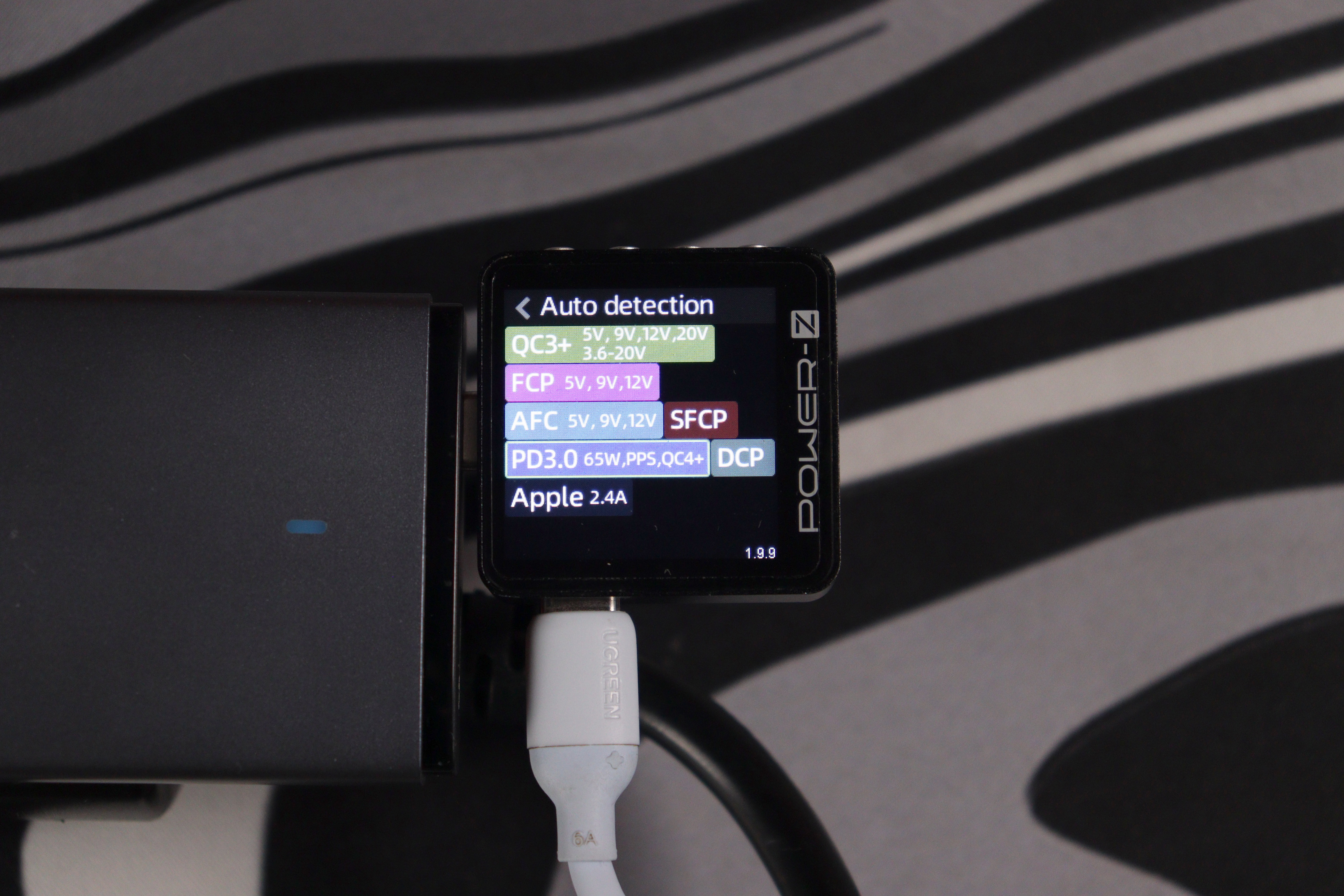 Тестер Power-Z показал полный набор протоколов для порта USB-C: QC3+ (5V/9V/12V/20V и 3.6-20V), FCP (5V/9V/12V), AFC (5V/9V/12V), SFCP, PD3.0 65W с PPS и QC4+, DCP, Apple 2.4A. Профили PD следующие: 5V/3A, 9V/3A, 12V/3A, 15V/3A, 20V/3.25A, плюс режим PPS 3.3-11V/5A.