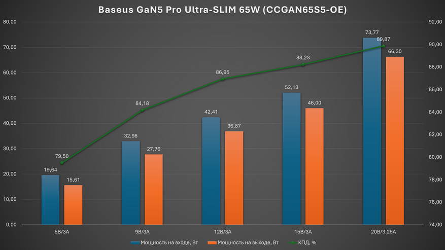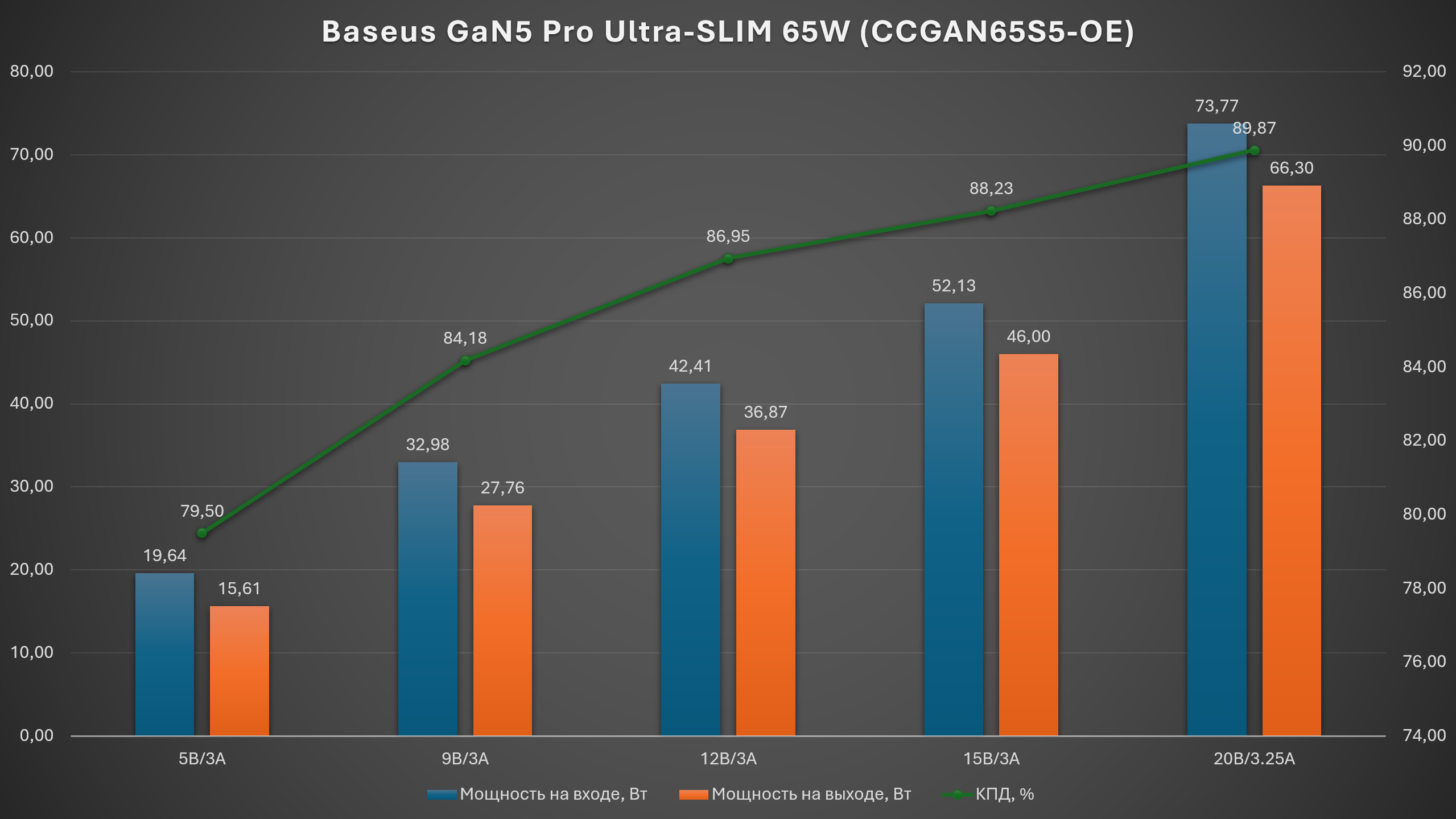 Baseus GaN5 Pro Ultra-SLIM 65W обладает неплохим КПД, который демонстрирует ожидаемую тенденцию роста с увеличением выходной мощности. При минимальной нагрузке 5V/3A (15.61 Вт на выходе) КПД составляет 79.50%. По мере увеличения напряжения и мощности, КПД стабильно растет: при 9V/3A он достигает 84.18%, при 12V/3A — 86.95%, а при 15V/3A — 88.23%. Максимальный КПД достигается при полной нагрузке 20V/3.25A (66.30 Вт на выходе), составляя 89.87%. Показатель достаточно высокий, но всё же уступает многим вариантам от Ugreen и Anker, в частности этим и объясняется высокий нагрев устройства.