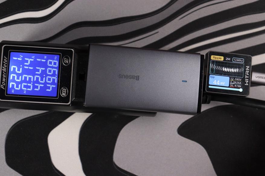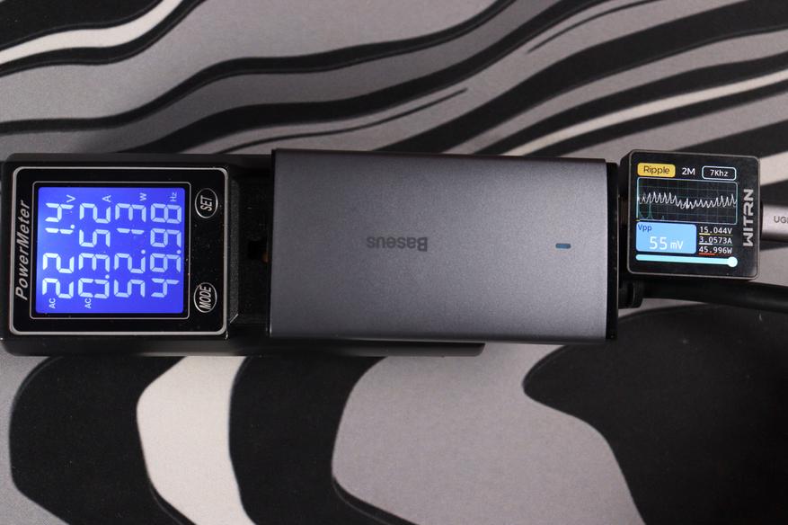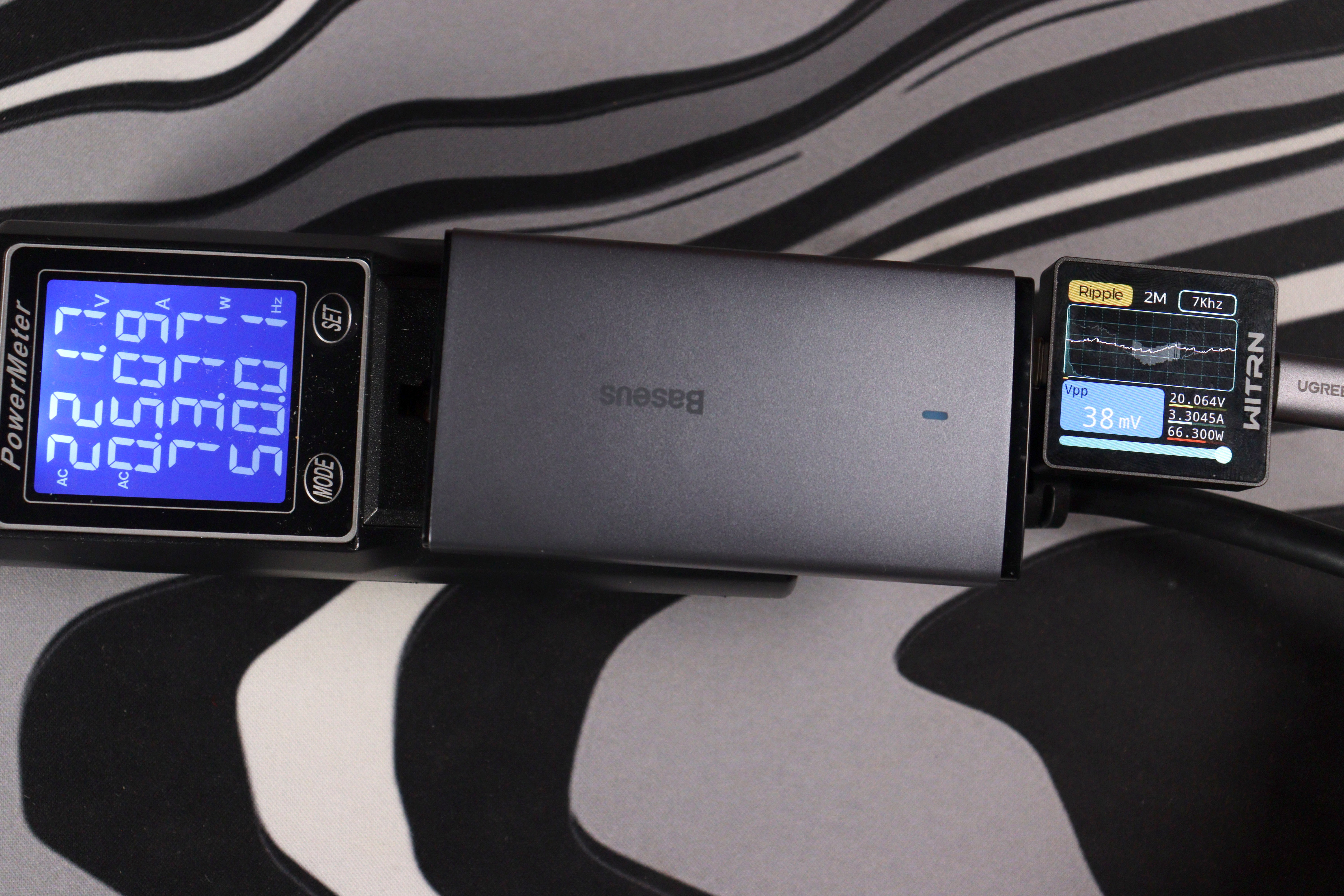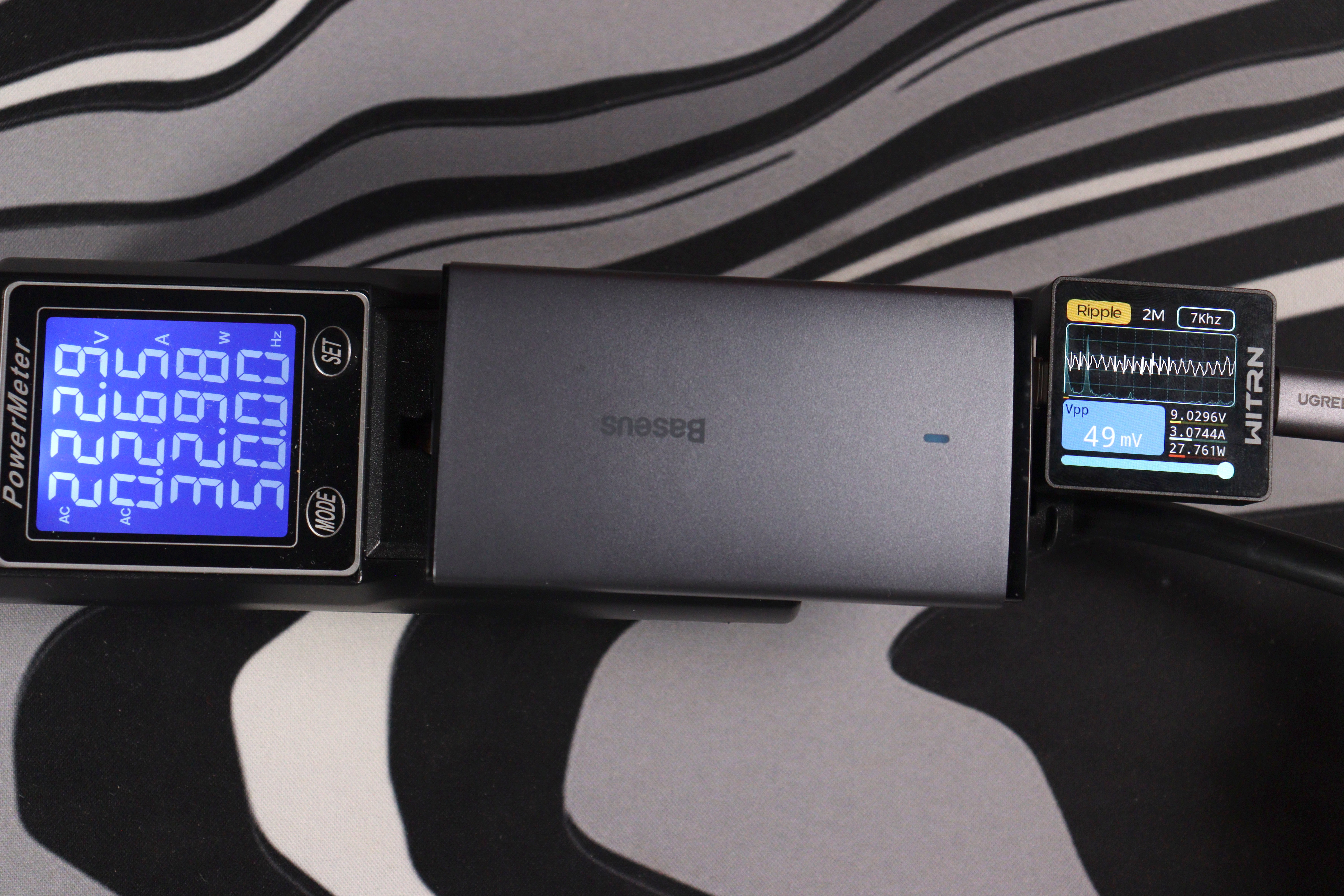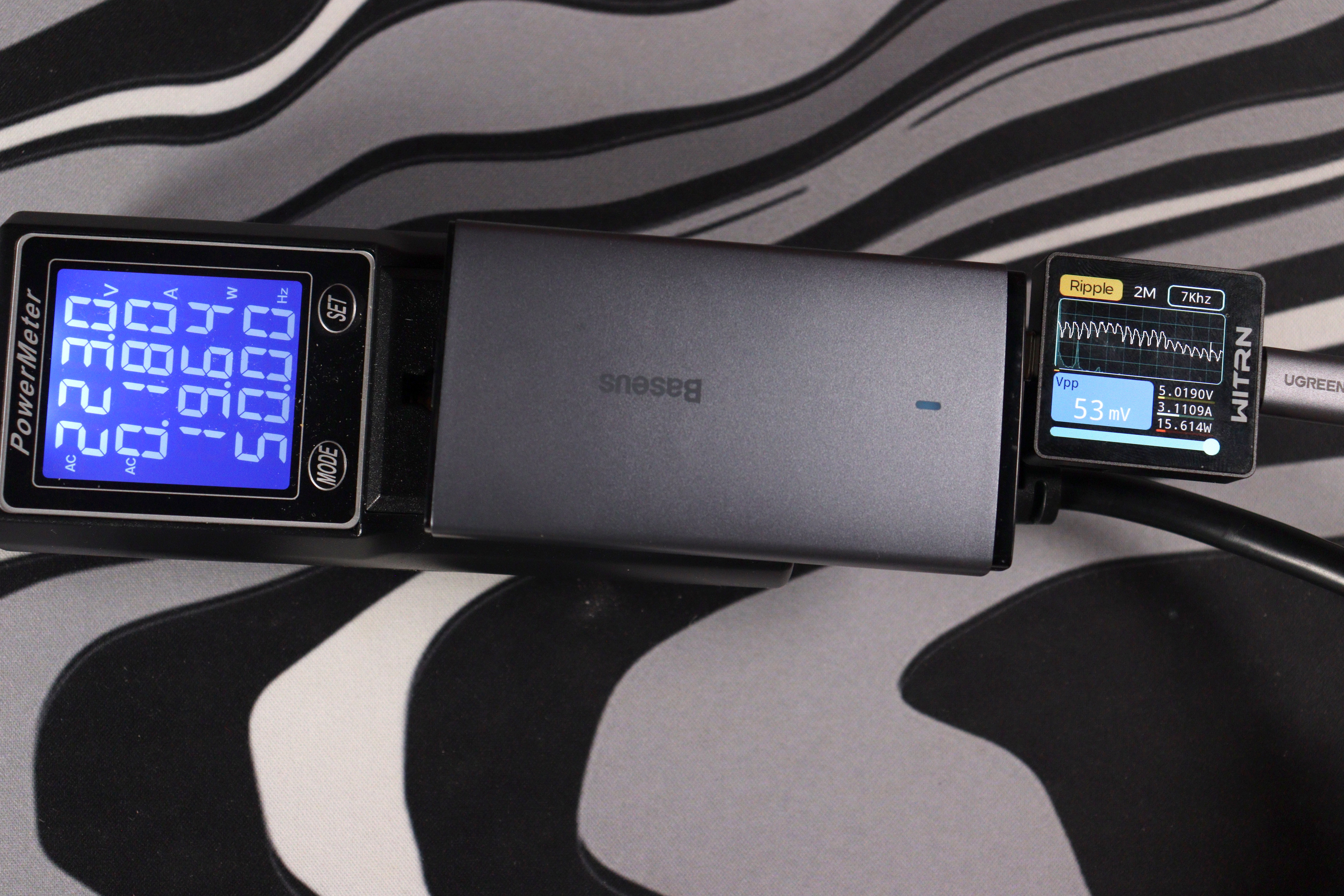 Порт USB-C1 демонстрирует весьма хорошие результаты, полностью реализуя заявленную мощность 65W и успешно активируя все стандартные режимы USB Power Delivery: 5V, 9V, 12V, 15V и 20V. Показатели пульсации напряжения на USB-C1 чрезвычайно низкие, варьируясь от 38mV до 55mV, что подтверждает высокое качество выходной мощности. В то же время, порт USB-A также показал себя превосходно, особенно благодаря редко встречающейся поддержке напряжения 20V/3.0A, что значительно расширяет его применимость для зарядки более мощных устройств. Пульсации на порте USB-A также отлично контролируются, оставаясь в пределах 87mV до 125mV (что для 5V всё-же многовато) в. В целом, оба порта обладают стабильными показателями напряжения с минимальной просадкой под нагрузкой, подтверждая наличие заявленного запаса мощности и делая зарядное устройство Baseus GaN5 Pro Ultra-SLIM 65W надежным и высококачественным решением.