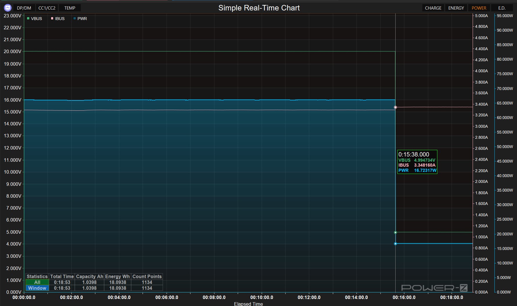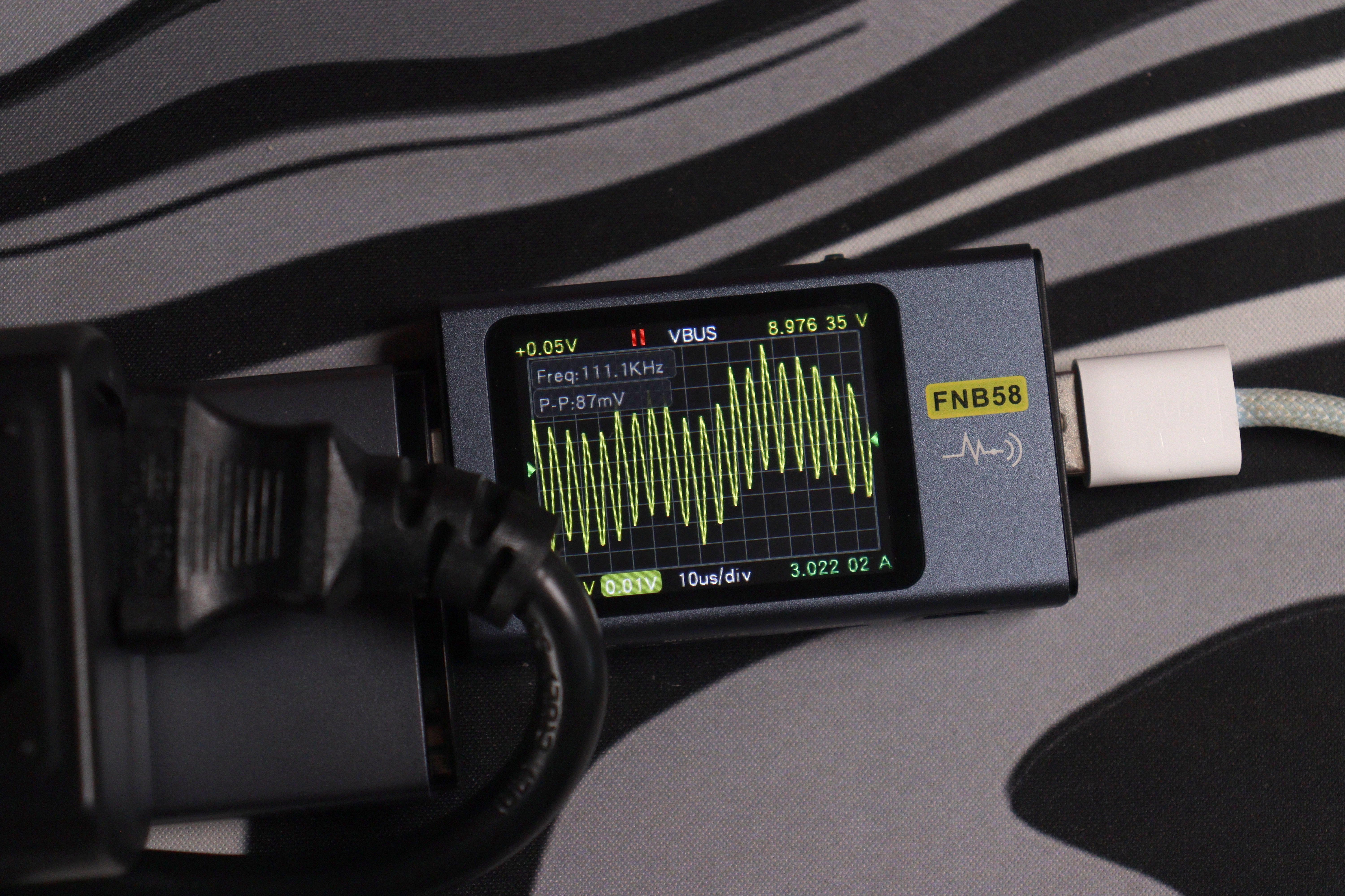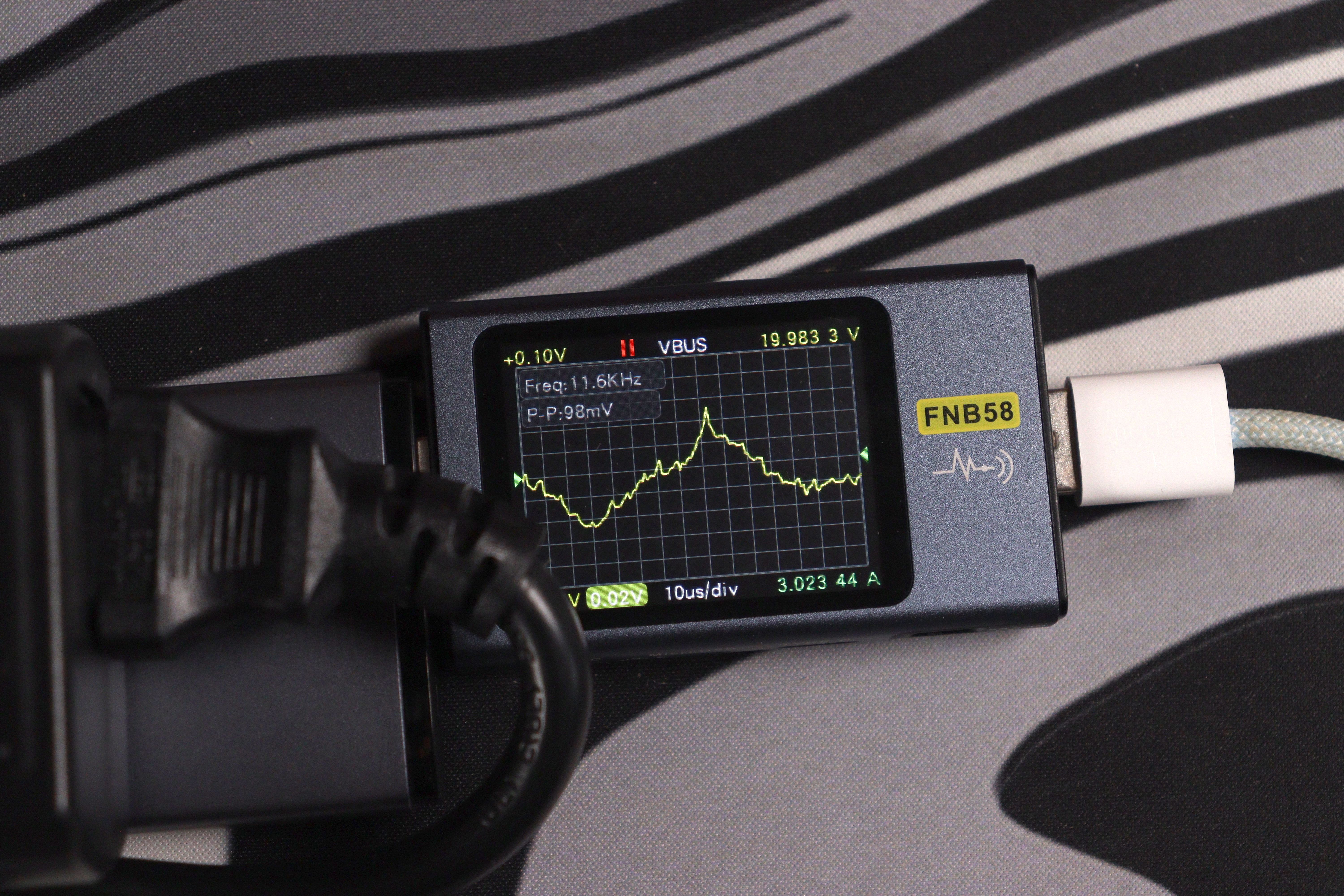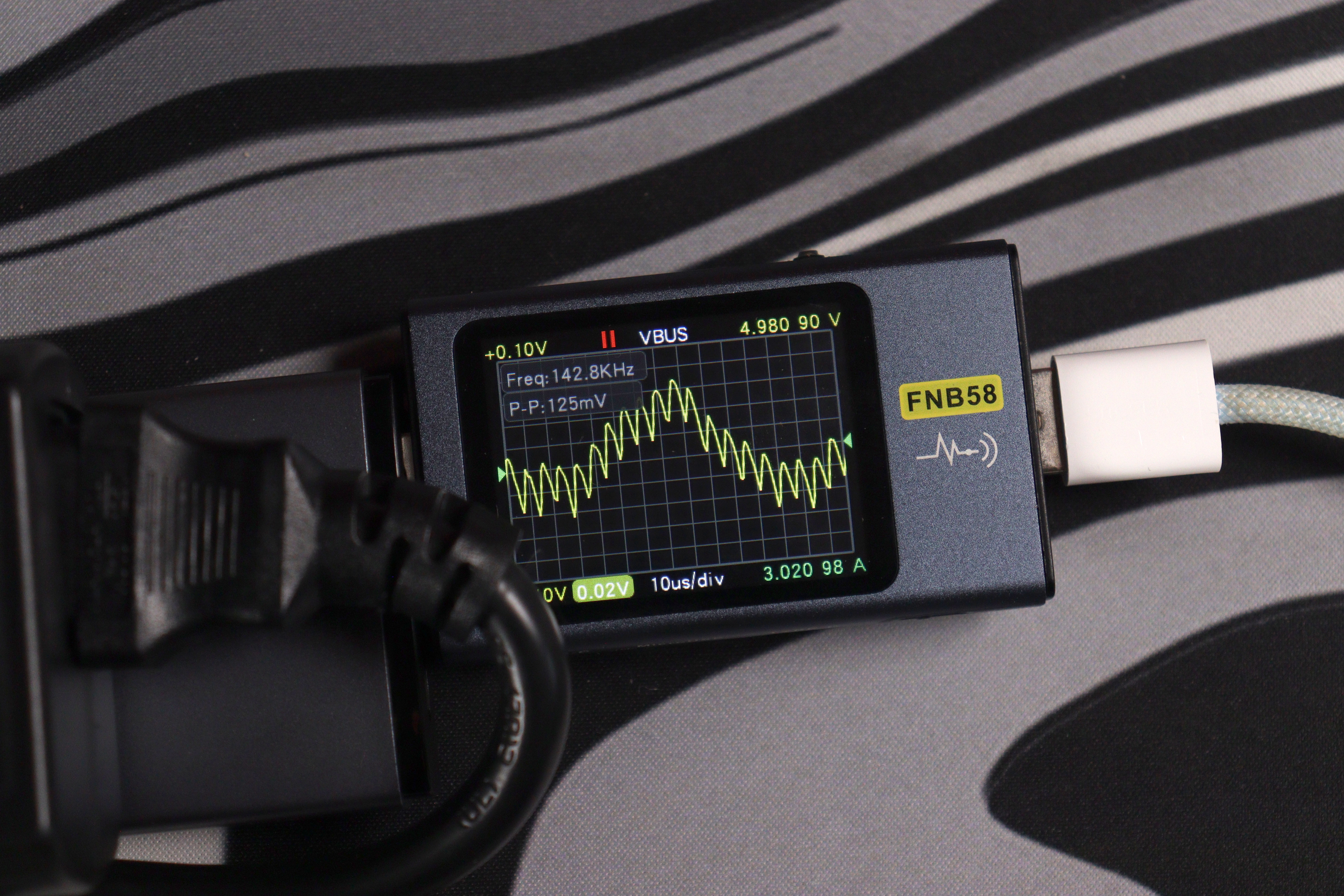 Порт USB-C1 демонстрирует весьма хорошие результаты, полностью реализуя заявленную мощность 65W и успешно активируя все стандартные режимы USB Power Delivery: 5V, 9V, 12V, 15V и 20V. Показатели пульсации напряжения на USB-C1 чрезвычайно низкие, варьируясь от 38mV до 55mV, что подтверждает высокое качество выходной мощности. В то же время, порт USB-A также показал себя превосходно, особенно благодаря редко встречающейся поддержке напряжения 20V/3.0A, что значительно расширяет его применимость для зарядки более мощных устройств. Пульсации на порте USB-A также отлично контролируются, оставаясь в пределах 87mV до 125mV (что для 5V всё-же многовато) в. В целом, оба порта обладают стабильными показателями напряжения с минимальной просадкой под нагрузкой, подтверждая наличие заявленного запаса мощности и делая зарядное устройство Baseus GaN5 Pro Ultra-SLIM 65W надежным и высококачественным решением.