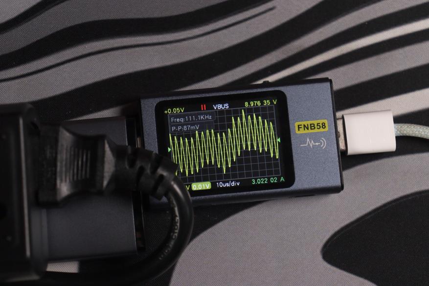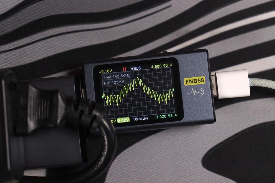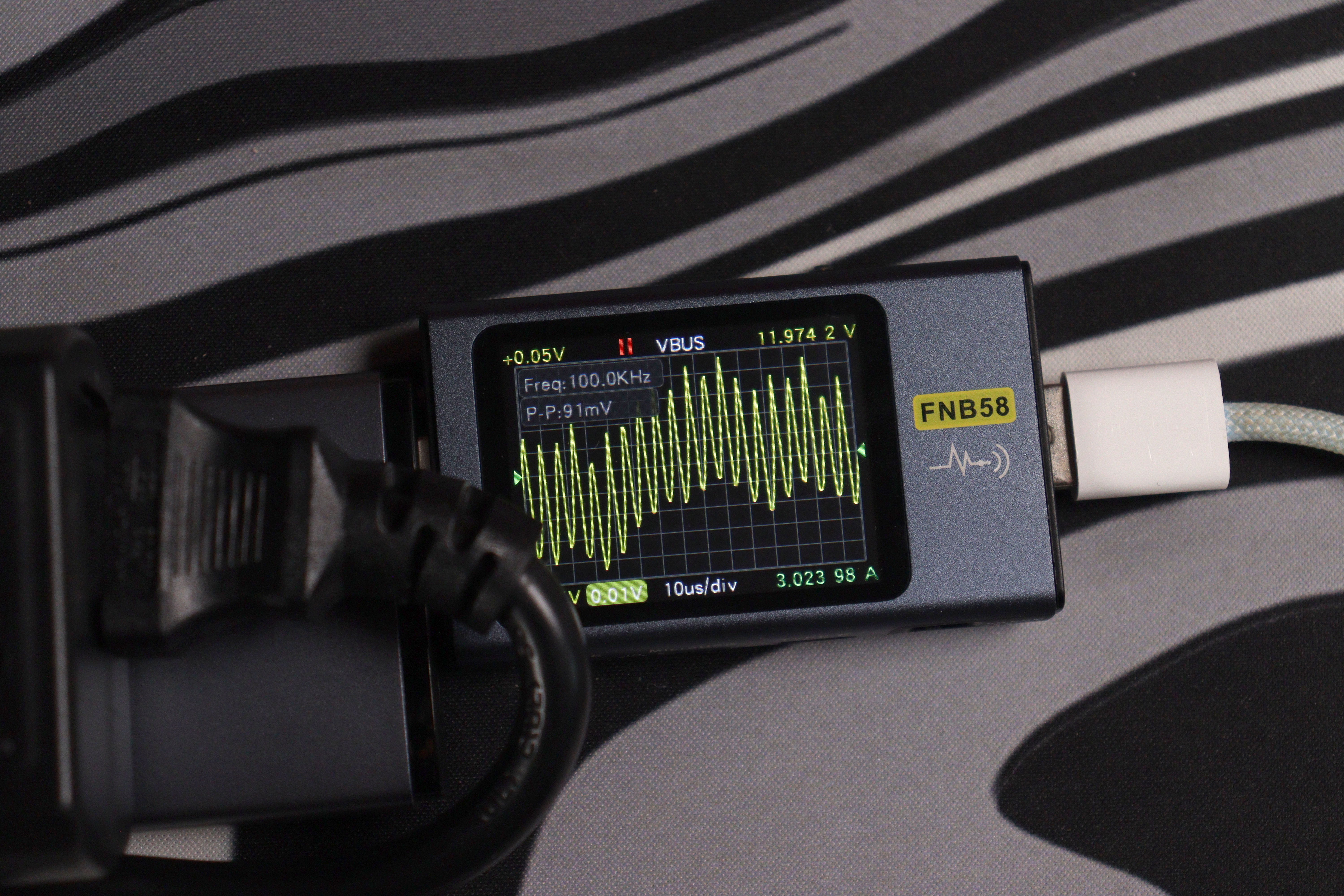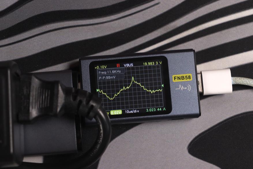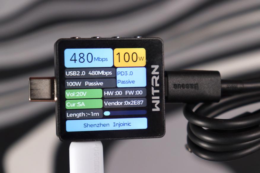 Комплектный кабель по тестам WITRN показал поддержку PD3.0 на 100 Вт (20V/5A), что вполне достаточно для работы с этой зарядкой на полной мощности. Чип внутри кабеля — Shenzhen Injoinic.