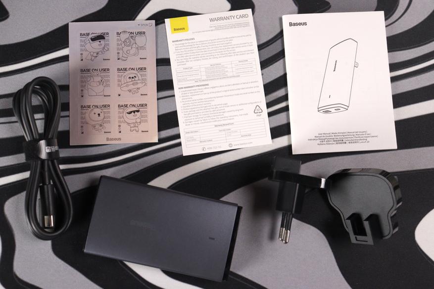Коробка выполнена в фирменном стиле Baseus — светлый картон с жёлтым акцентом логотипа. Внутри обнаружилось следующее: само зарядное устройство, кабель USB-C to USB-C длиной около метра с поддержкой 100 Вт (пассивный, USB 2.0), два сменных адаптера для вилки (британский Type G и европейский Type C), гарантийная карточка, инструкция и набор фирменных наклеек Baseus. Версия «Overseas Edition» как раз и означает наличие сменных вилок для разных регионов — решение удобное для тех, кто часто путешествует.
