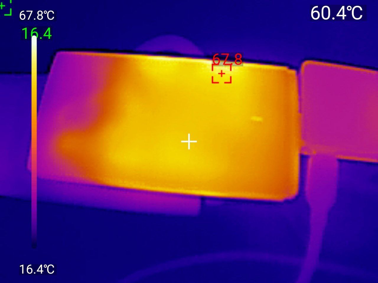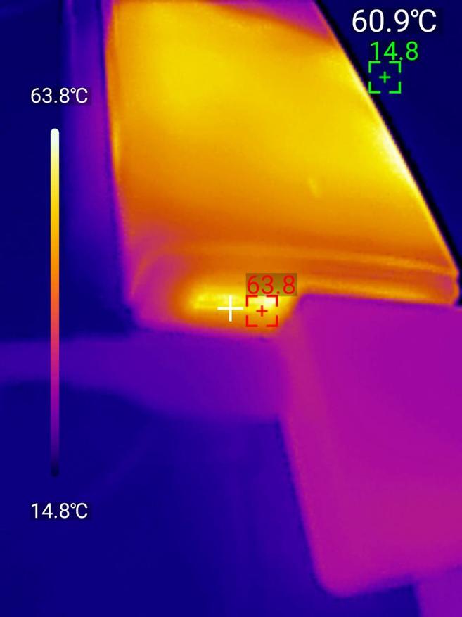 Вот тут есть важный нюанс. При длительной работе на максимальной мощности (65W) зарядка ощутимо греется. Тепловизор зафиксировал температуру корпуса до 67.8°C после получаса работы, а в районе порта для зарядки — до 63.8°C.
