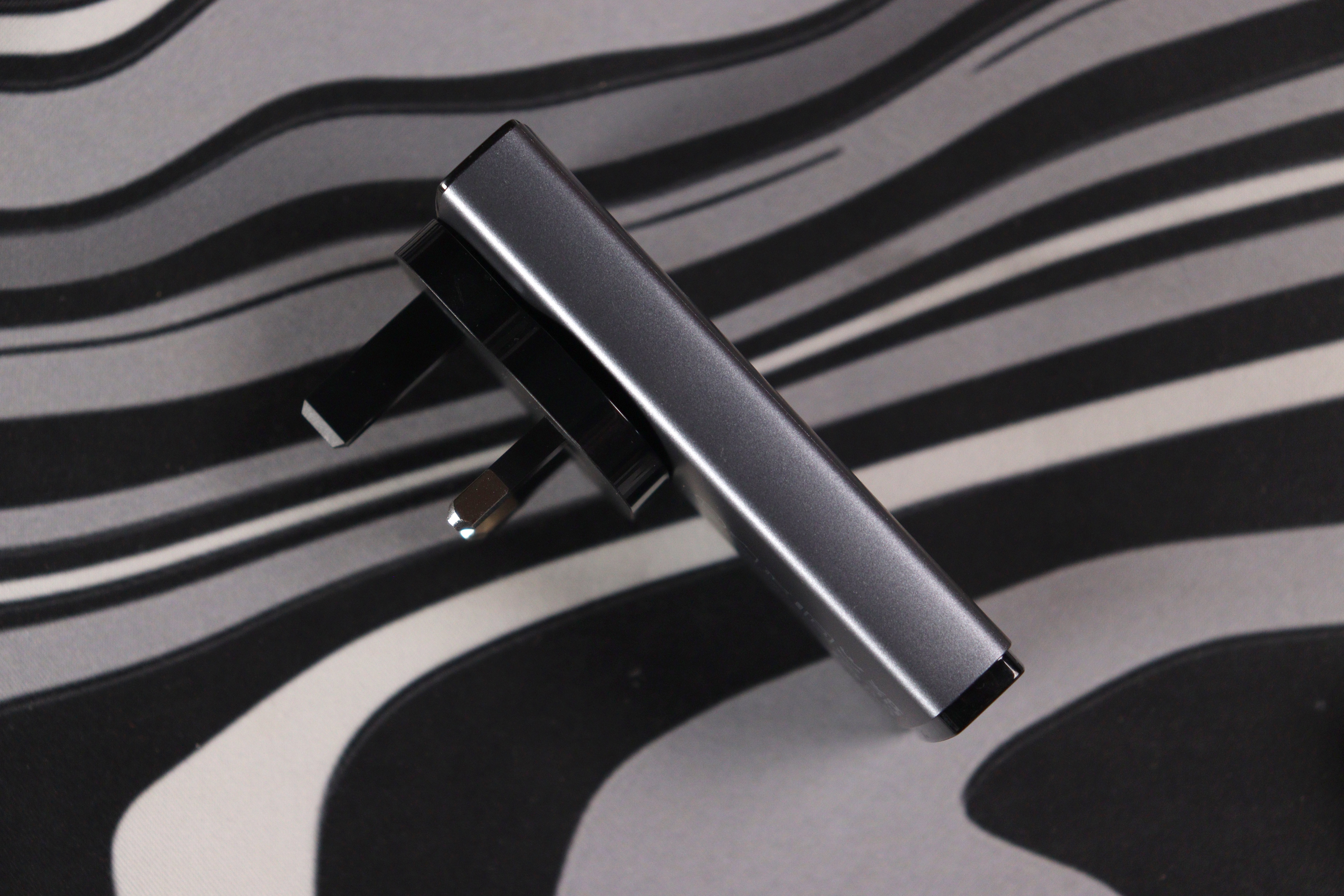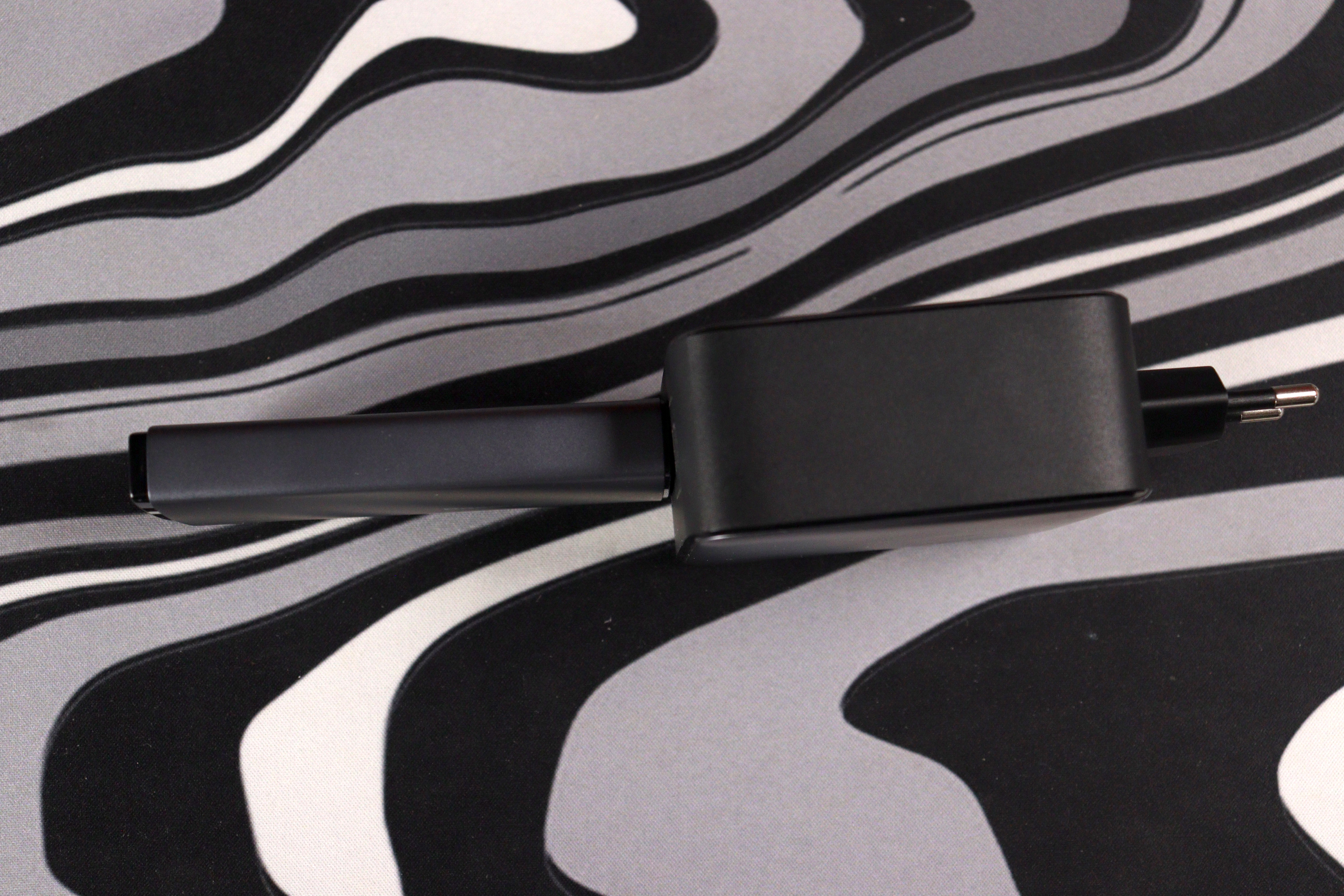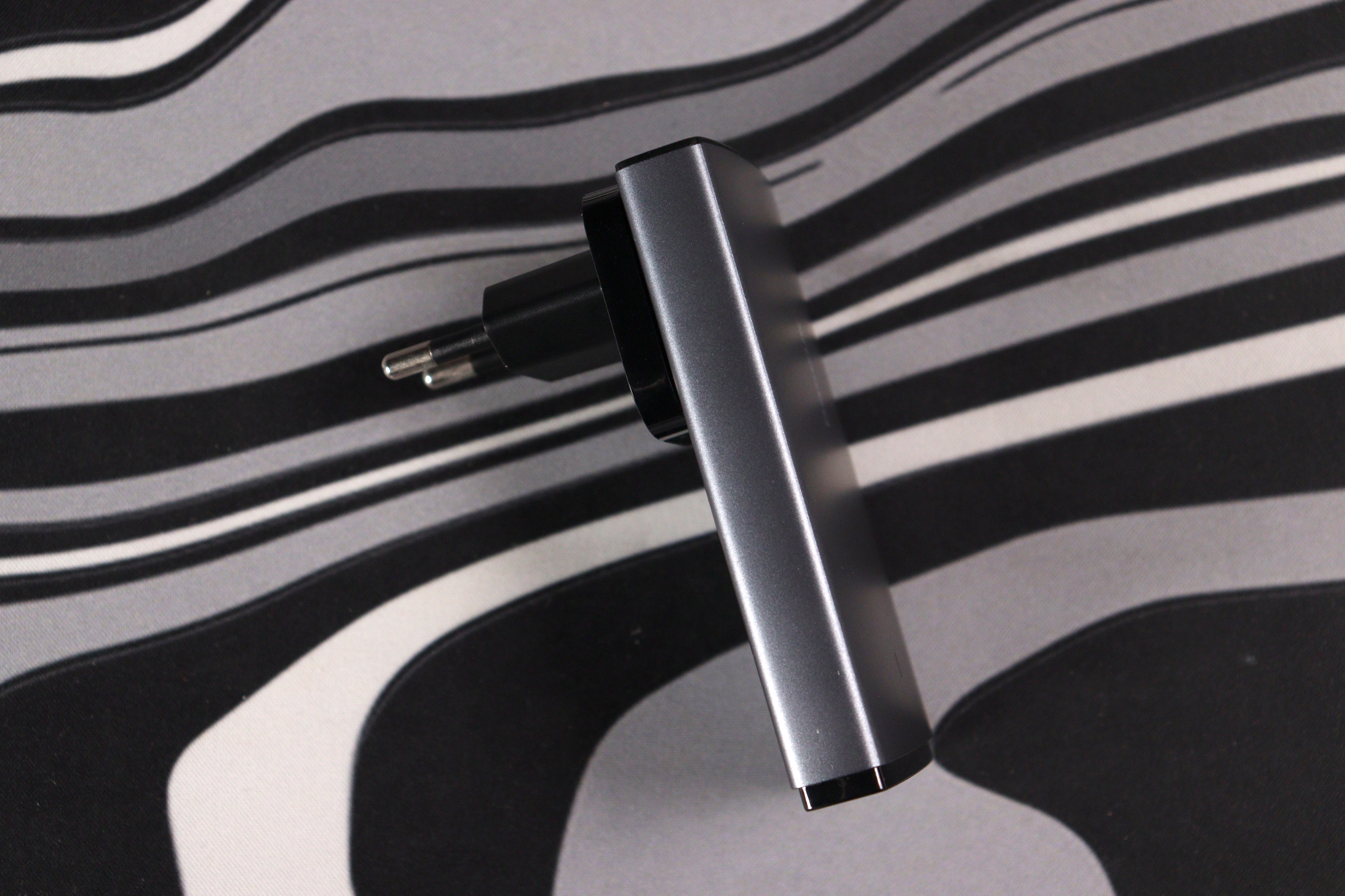 Главная фишка этой модели — форм-фактор. Корпус выполнен из тёмно-серого поликарбоната с приятным матовым покрытием, которое не собирает отпечатки. Форма вытянутая, прямоугольная, напоминает небольшой павербанк. Вилка складная и утапливается в корпус, что делает транспортировку удобной — ничего не торчит и не цепляется. В комплекте также присутствует переходники под различные типы розеток