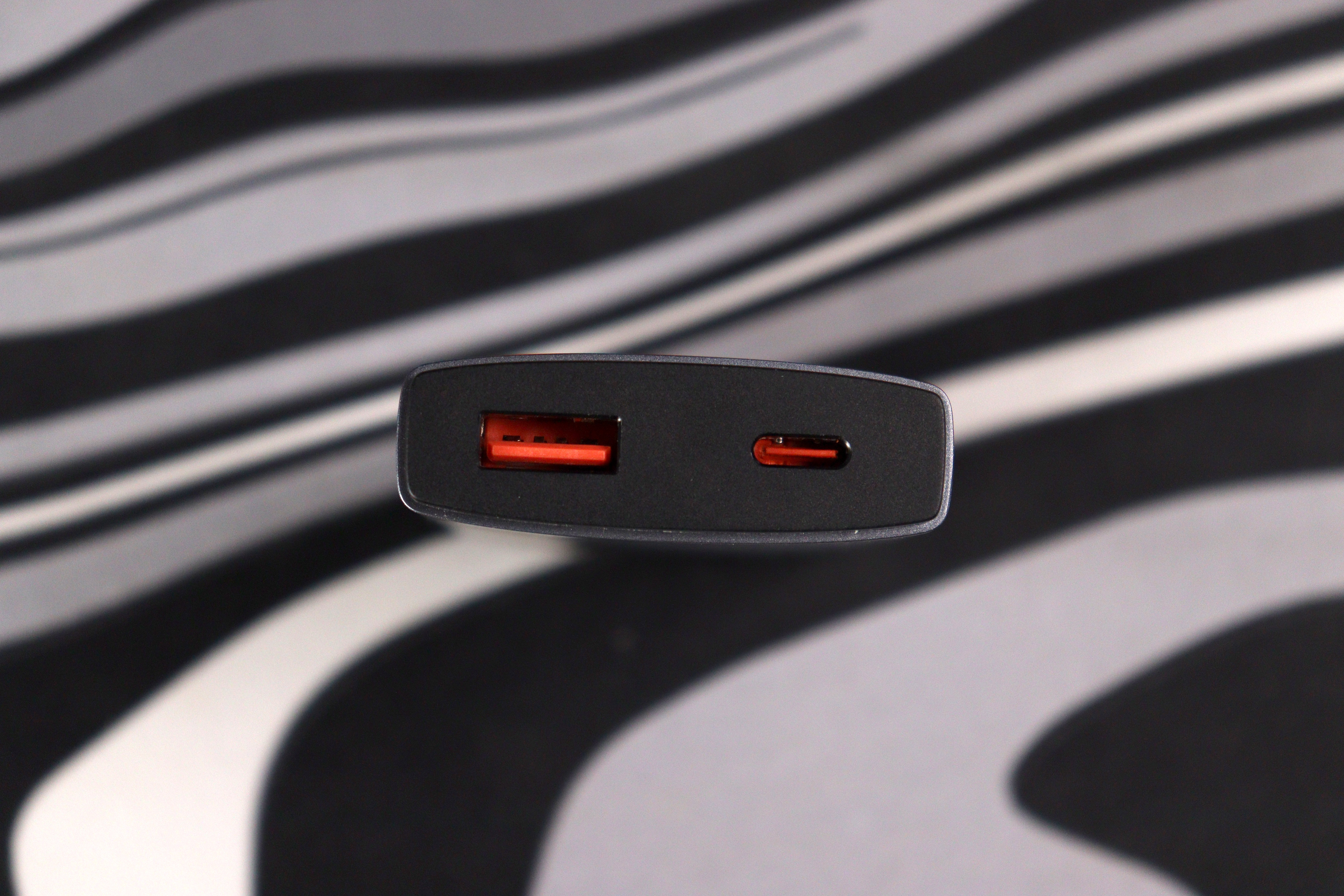 На торце расположены два порта: USB-A (оранжевый, с поддержкой быстрой зарядки) и USB-C. Оба порта маркированы оранжевым цветом, что указывает на поддержку быстрой зарядки. На боковой грани есть небольшой светодиодный индикатор работы — синий, ненавязчивый.