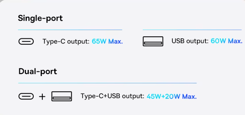 Зарядное устройство использует динамическое распределение мощности для оптимальной и безопасной зарядки подключенных устройств. При использовании только одного порта, устройство максимально раскрывает свой потенциал: порт Type-C может выдавать до 65W Max. (20V/3.25A), а порт USB-A — до 60W Max. (20V/3A). Однако при одновременном подключении двух устройств общая мощность 65W перераспределяется по схеме 45W + 20W Max., где порт Type-C получает 45W (достаточно для большинства ноутбуков), а порт USB-A — 20W (для быстрой зарядки смартфонов). Как и большинство многопортовых зарядных устройств с технологией Power Delivery, при подключении нового устройства к свободному порту или при отключении уже заряжающегося, происходит кратковременная перезагрузка всех портов.