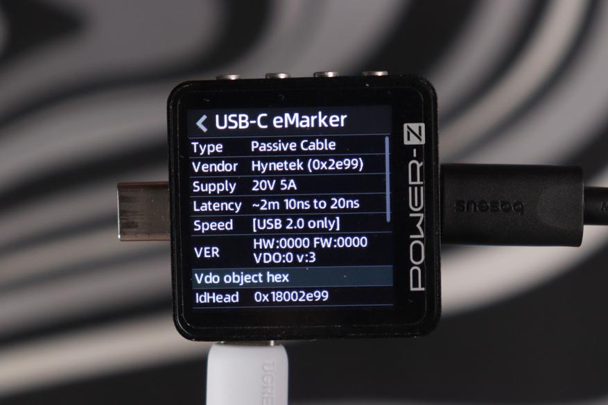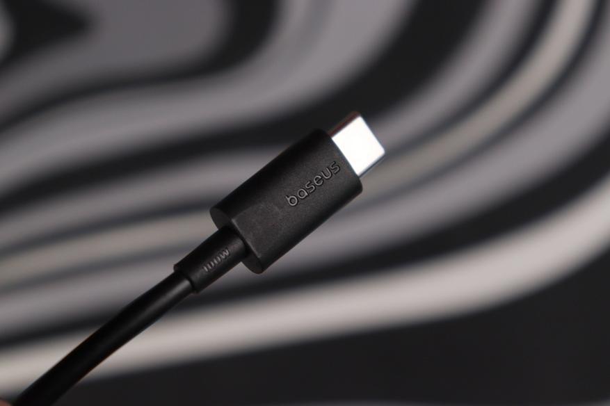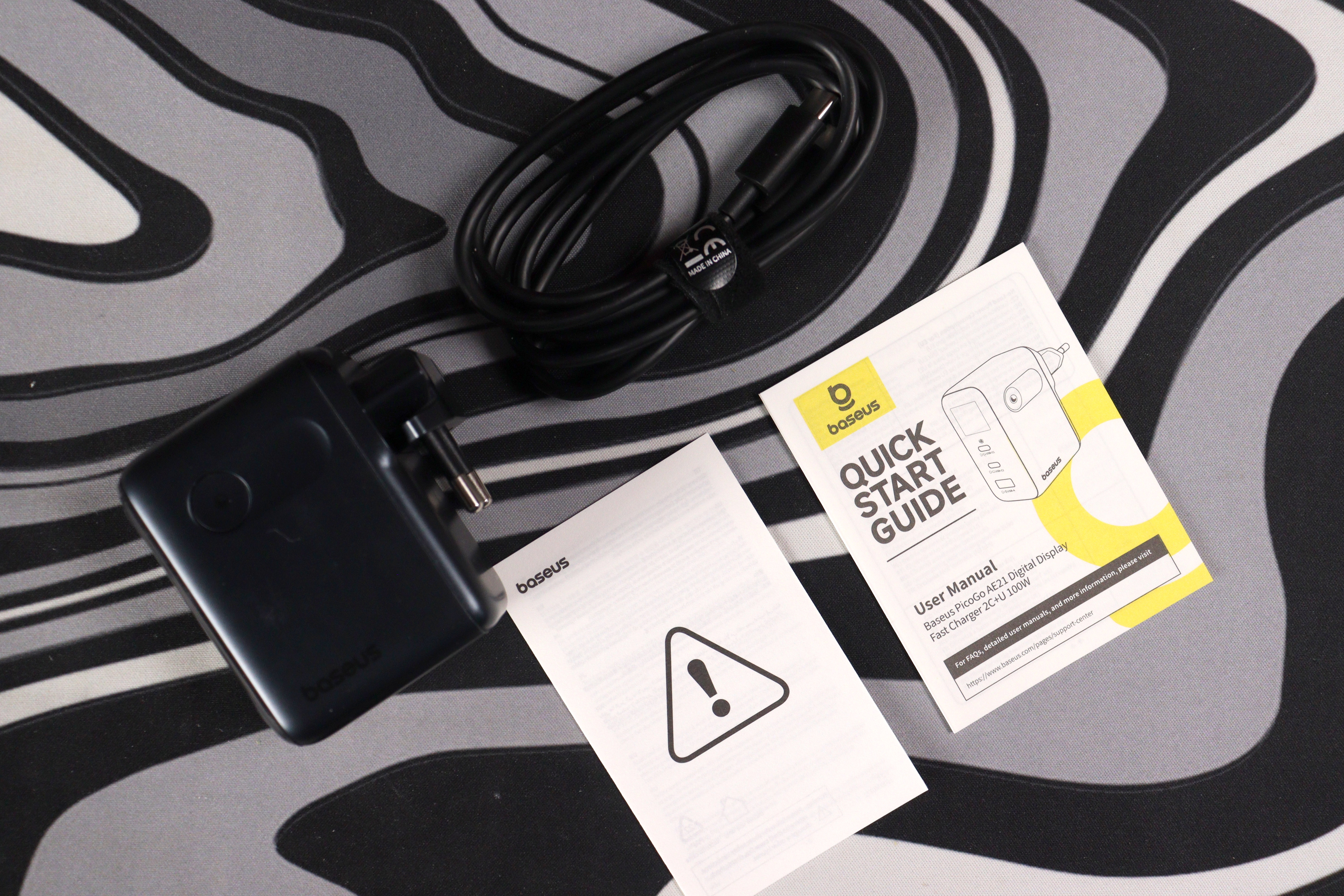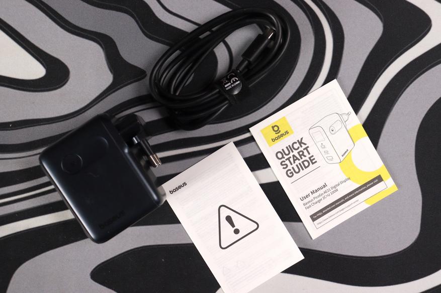 В коробке ничего лишнего: само зарядное, метровый кабель USB-C to USB-C и краткая инструкция. Кабель приятный на ощупь, не дубовый, с маркировкой — тестер показал, что это пассивный кабель с поддержкой 20V 5A (100W по спецификации USB PD 3.0). Для повседневных задач более чем достаточно, хотя для максимальной мощности в 100 Вт всё же лучше использовать качественный кабель с маркировкой e-marker.