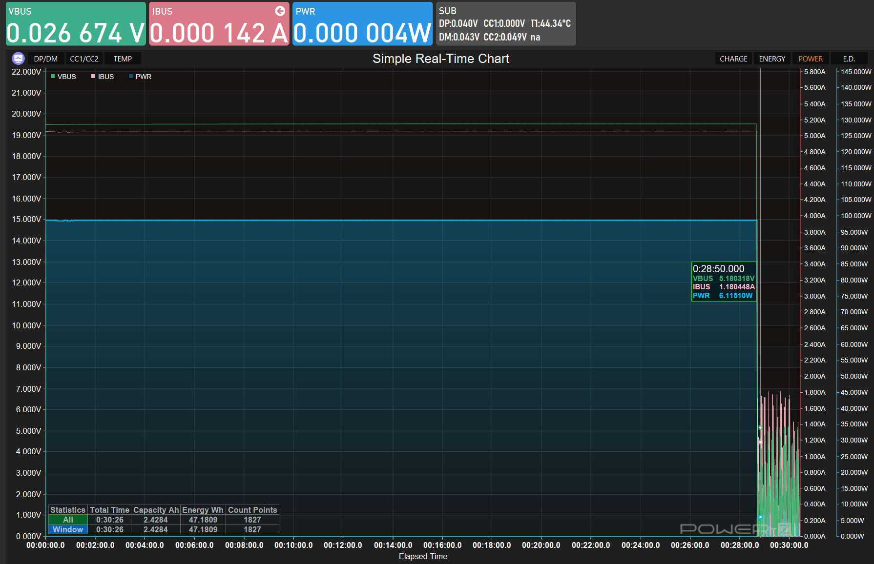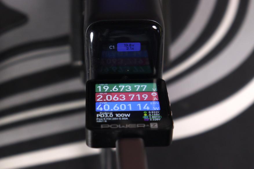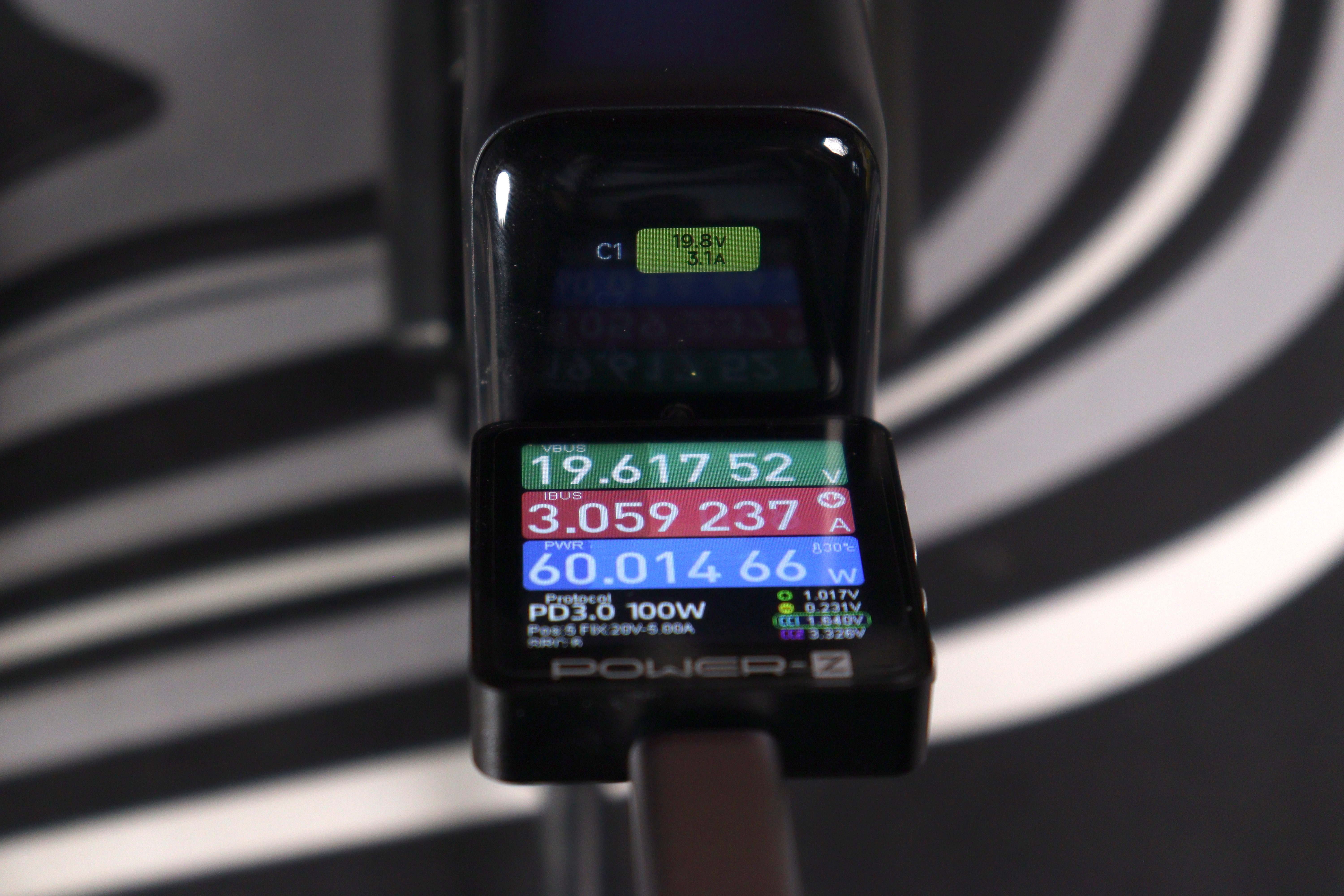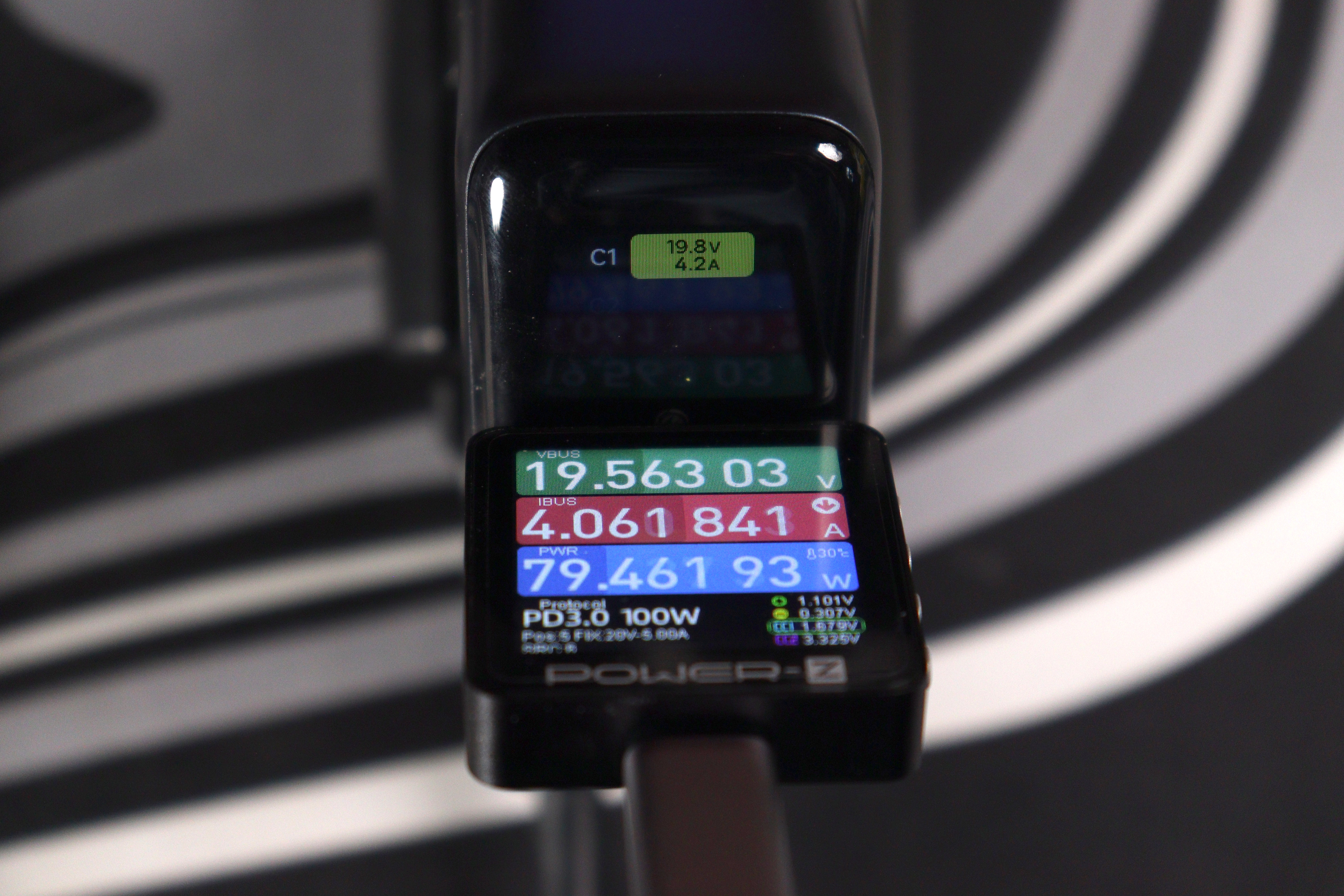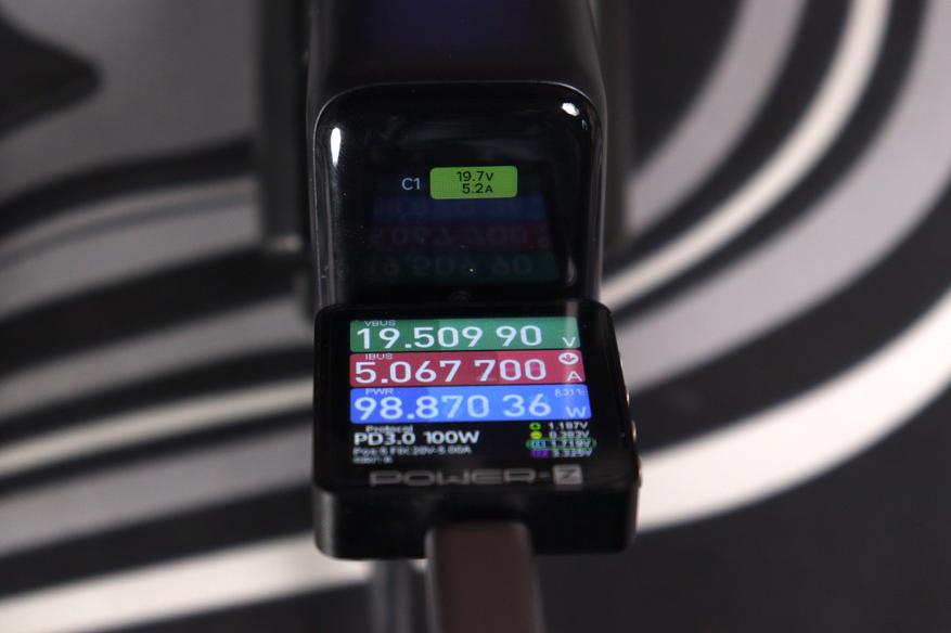 Особый интерес представляет поведение при максимальной нагрузке. При длительной зарядке на 100W (19.73V, 5.07A по факту 99.87W) зарядное устройство проработало около 29 минут на полной мощности, после чего включился тротлинг — мощность упала до ~60-80W. Это защитный механизм от перегрева, что вполне нормально для компактных устройств.