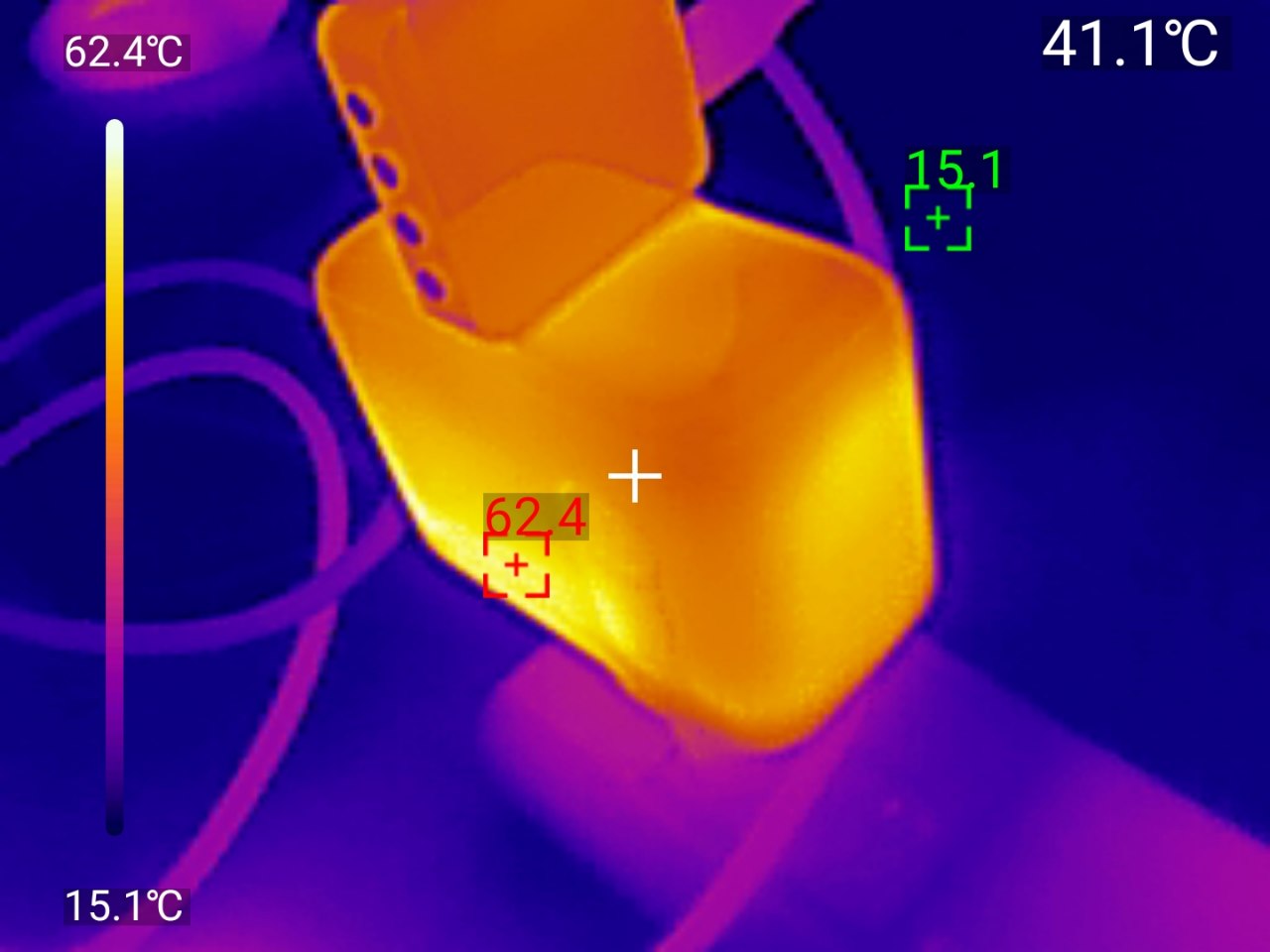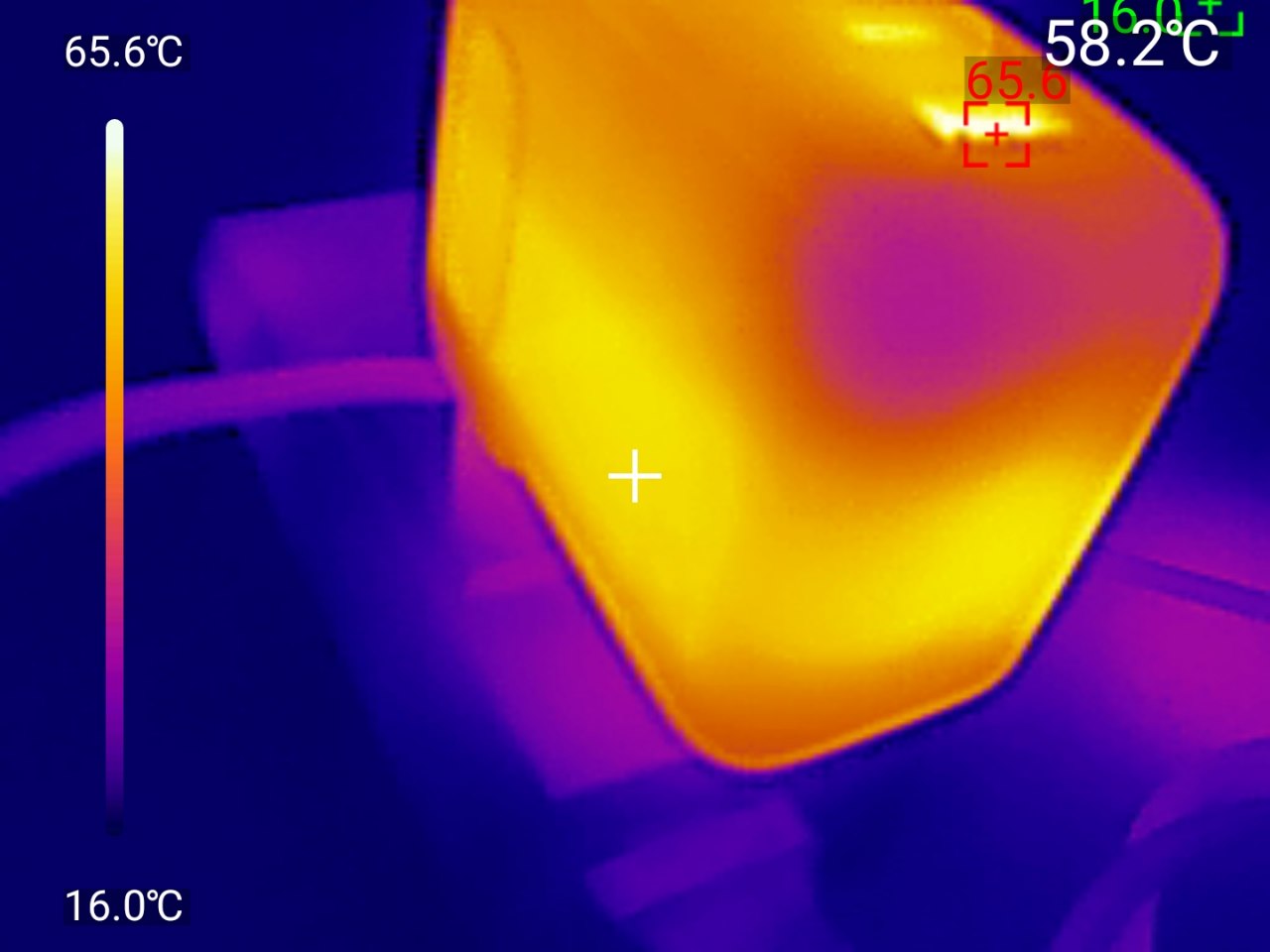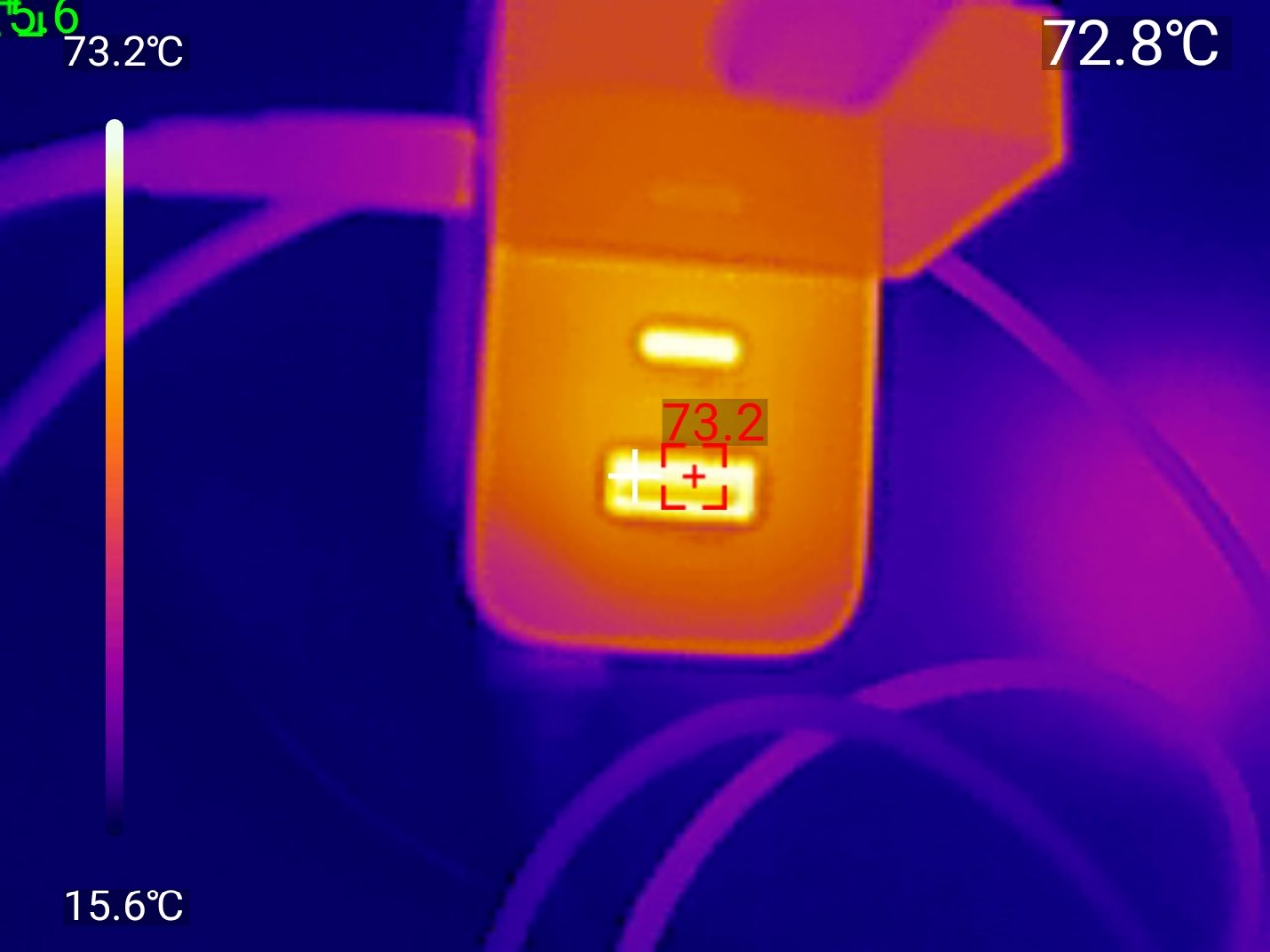 Тепловизор зафиксировал максимальную температуру корпуса 62.4°C в центральной части, области вокруг вилки нагрелись до 65.6°C. Порты показали пиковые значения 73.2°C — это горячо, но не критично. Для сравнения: многие зарядки греются сильнее. Активное охлаждение отсутствует, охлаждение пассивное через корпус.
