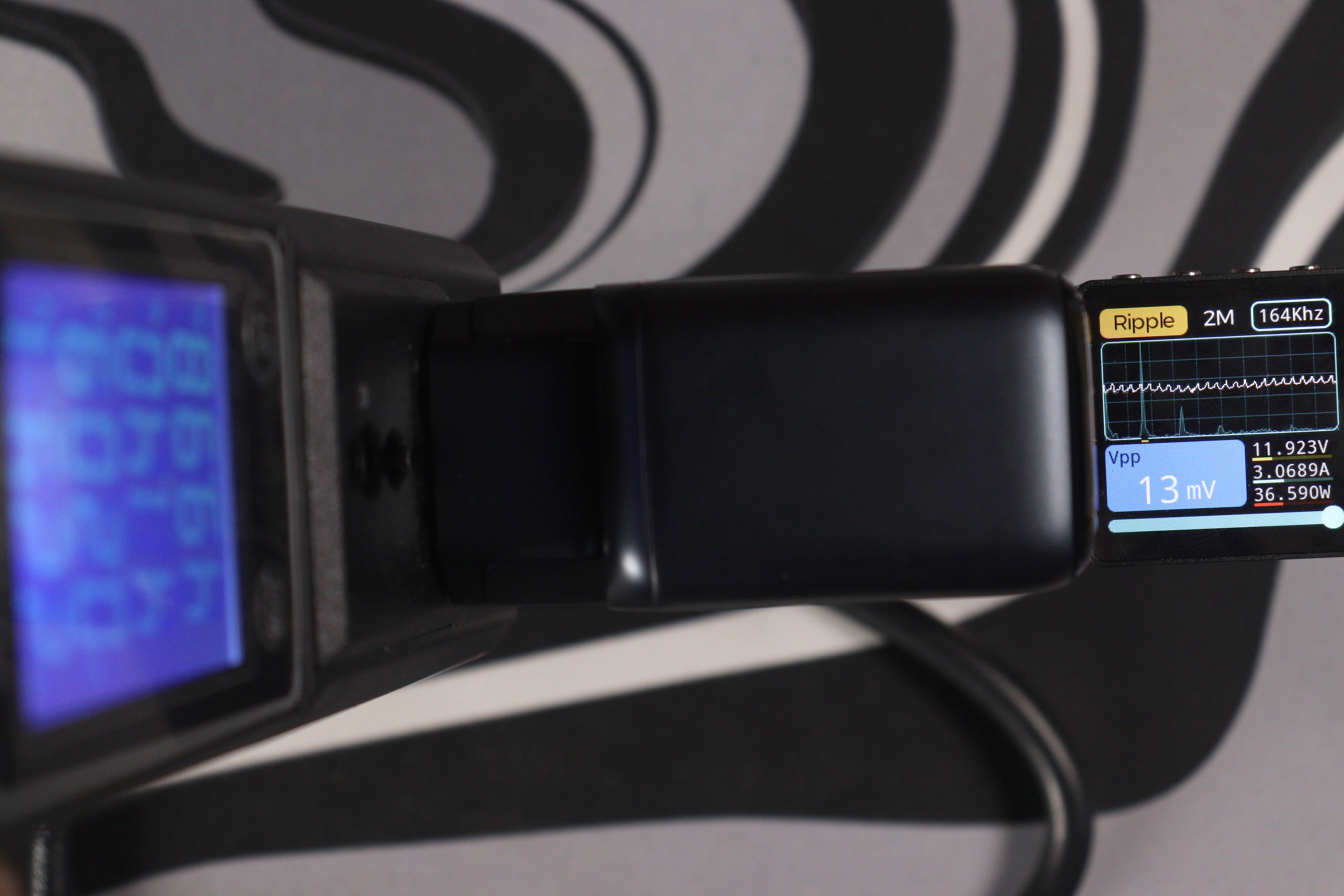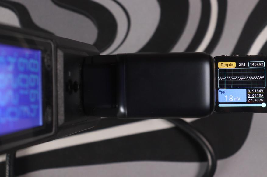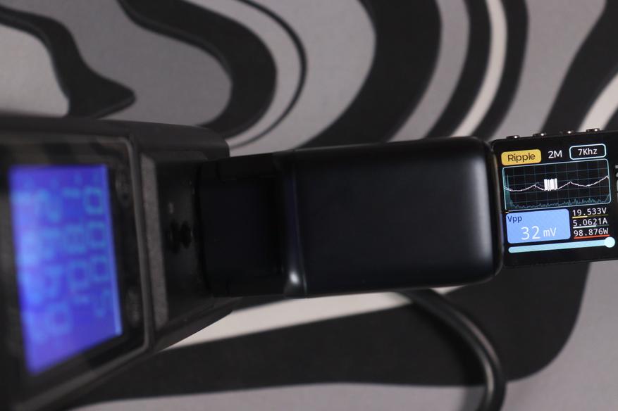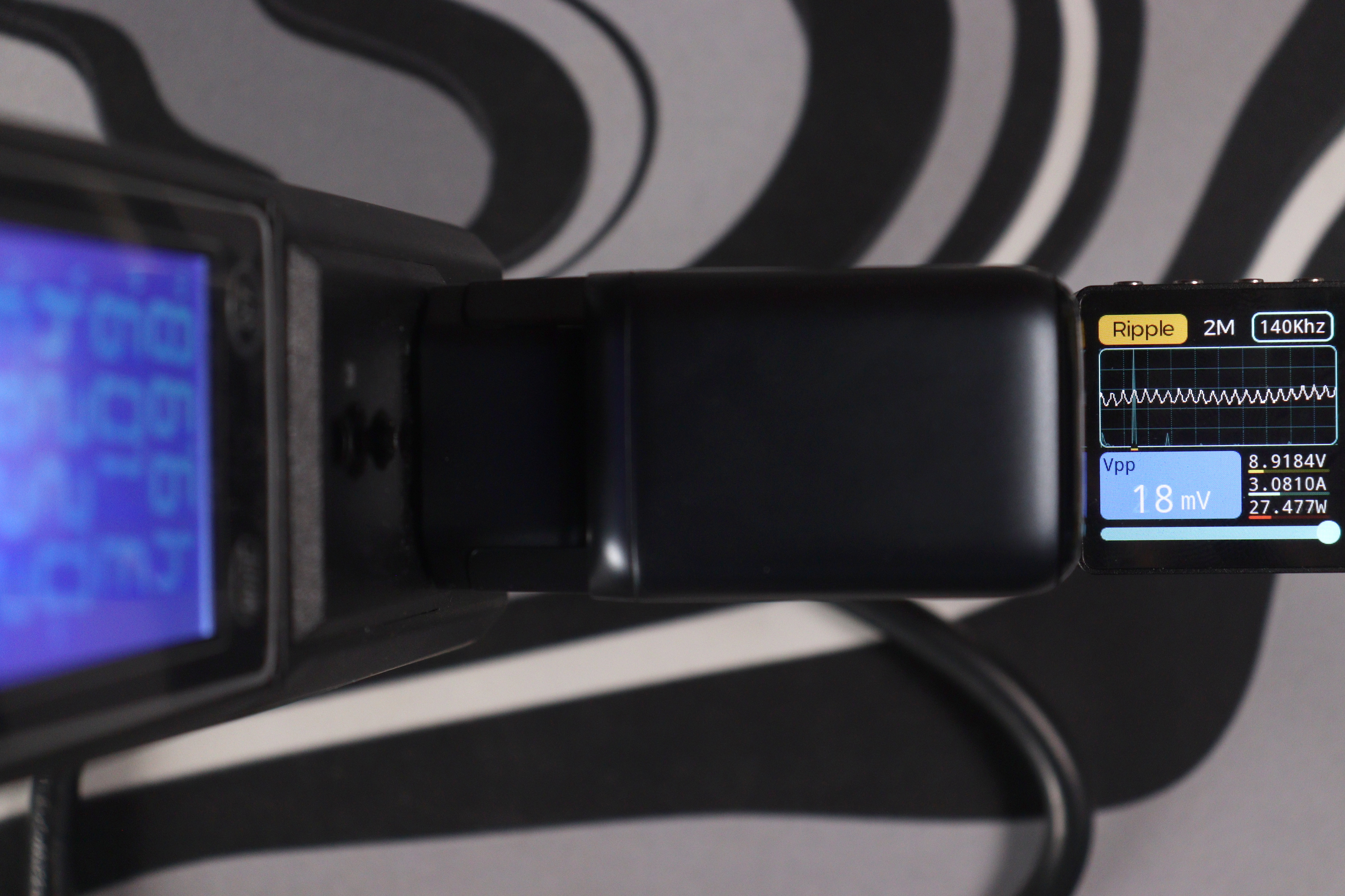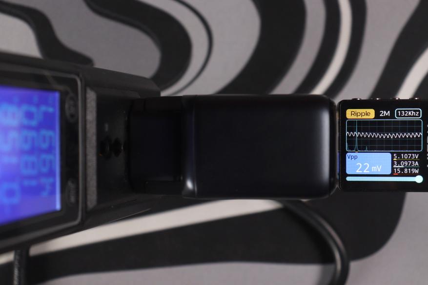 Напряжение стабильное, просадки минимальные. Пульсации находятся в пределах нормы для современных GaN-зарядок, хотя на профилях 15V и 20V частота переключения заметно ниже, что теоретически может влиять на эффективность, но на практике незаметно.