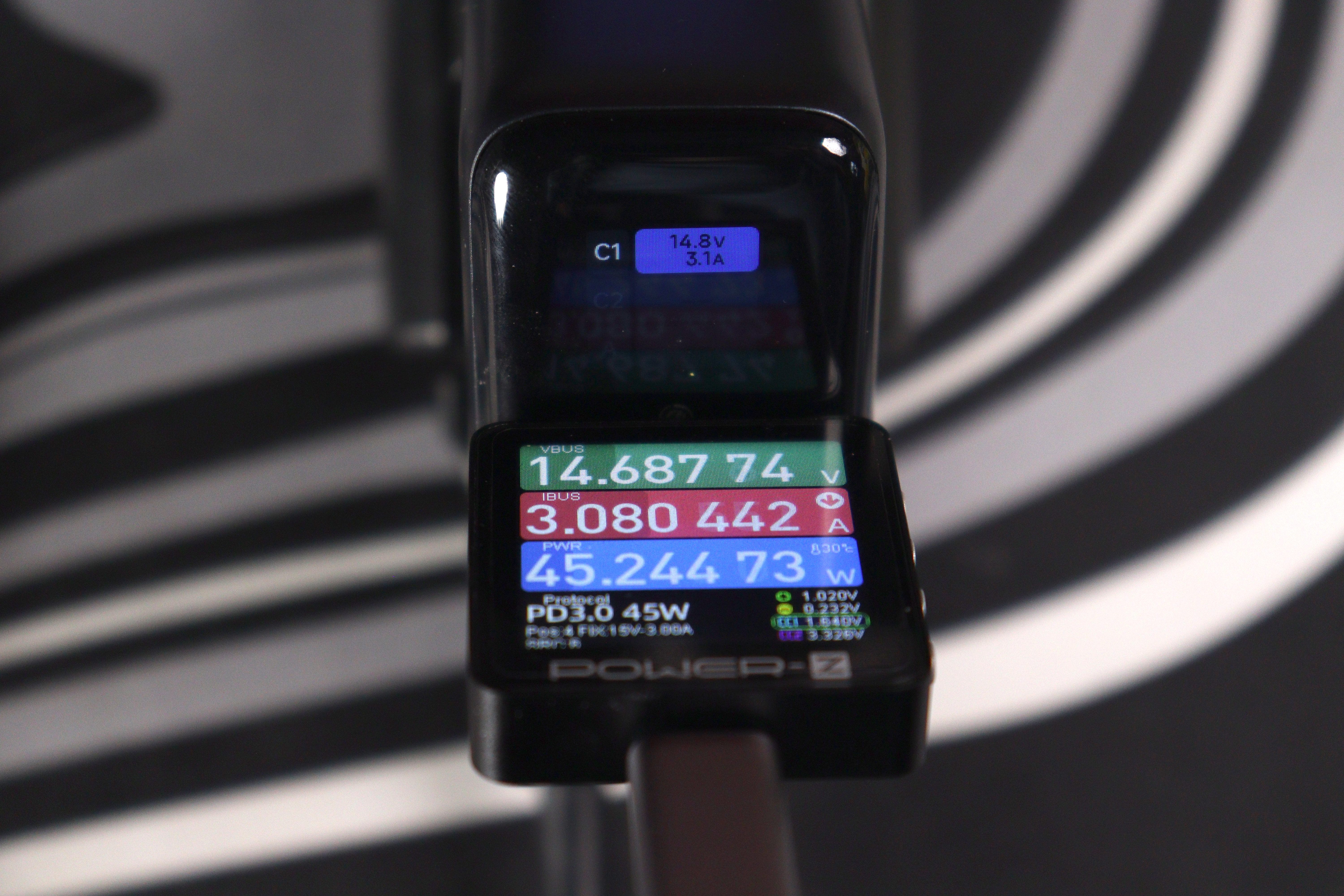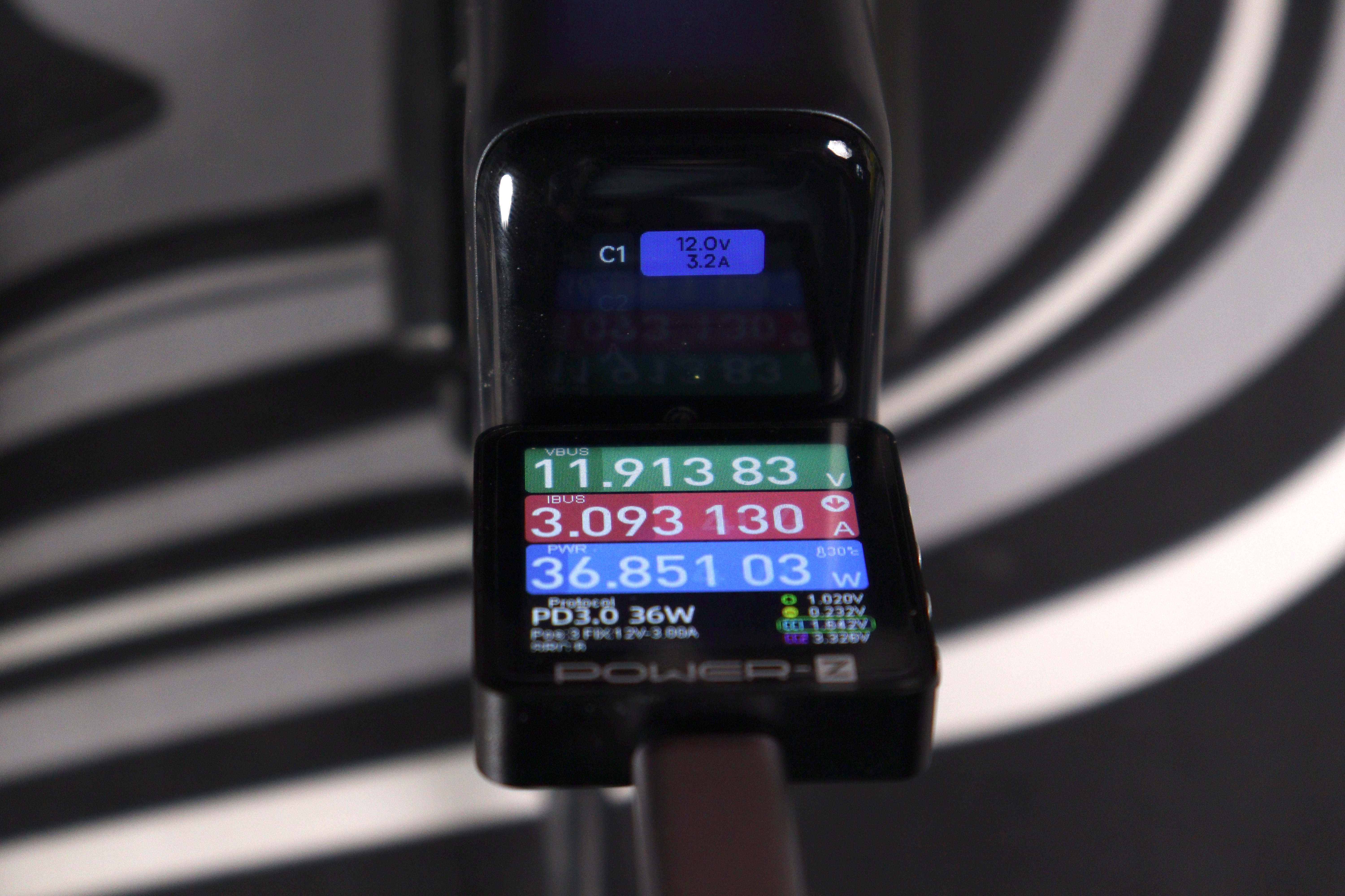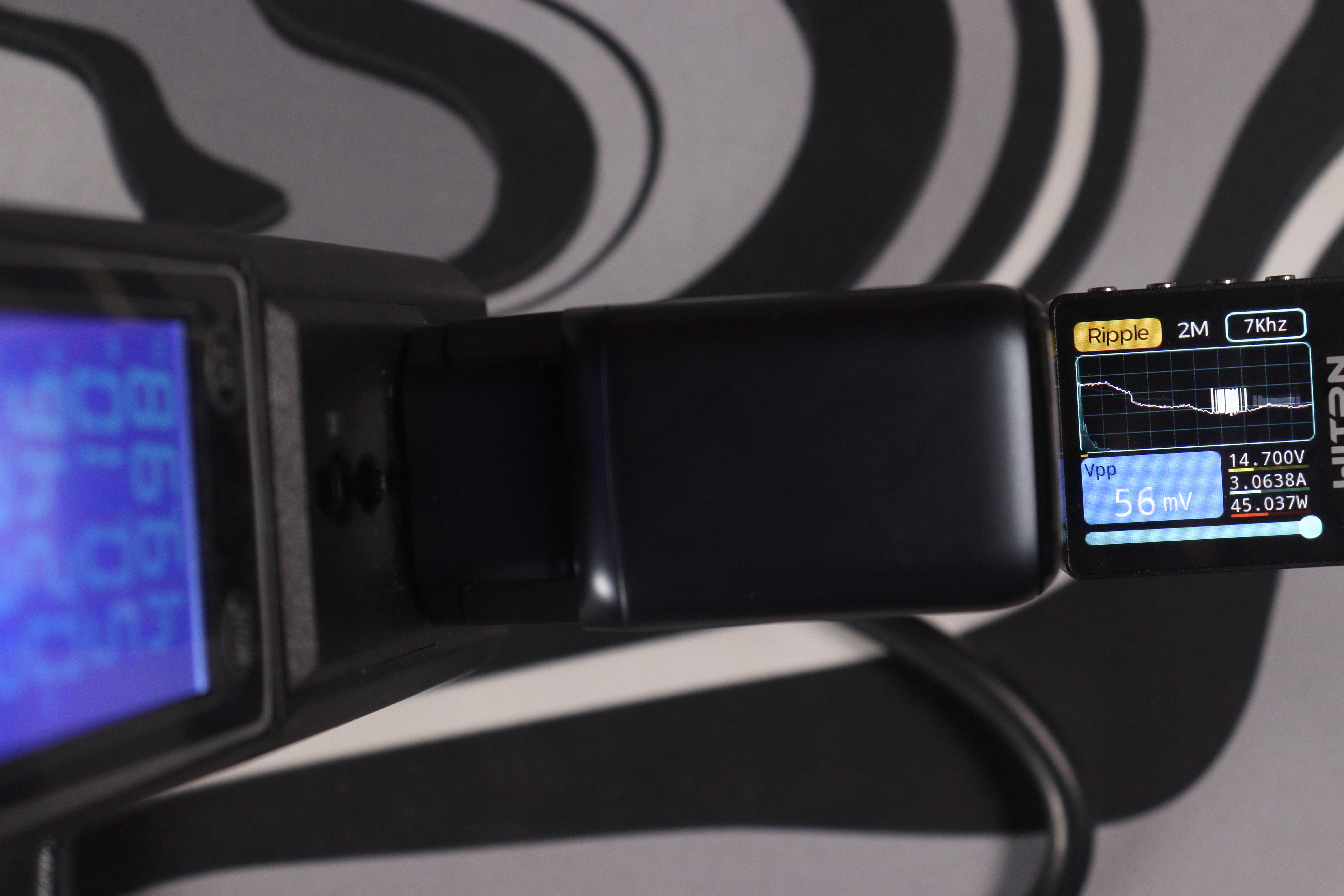 Напряжение стабильное, просадки минимальные. Пульсации находятся в пределах нормы для современных GaN-зарядок, хотя на профилях 15V и 20V частота переключения заметно ниже, что теоретически может влиять на эффективность, но на практике незаметно.