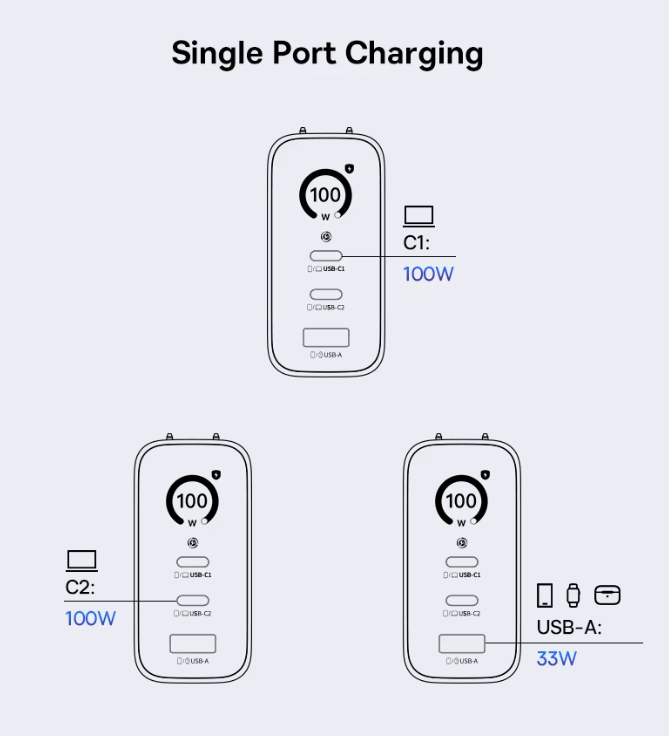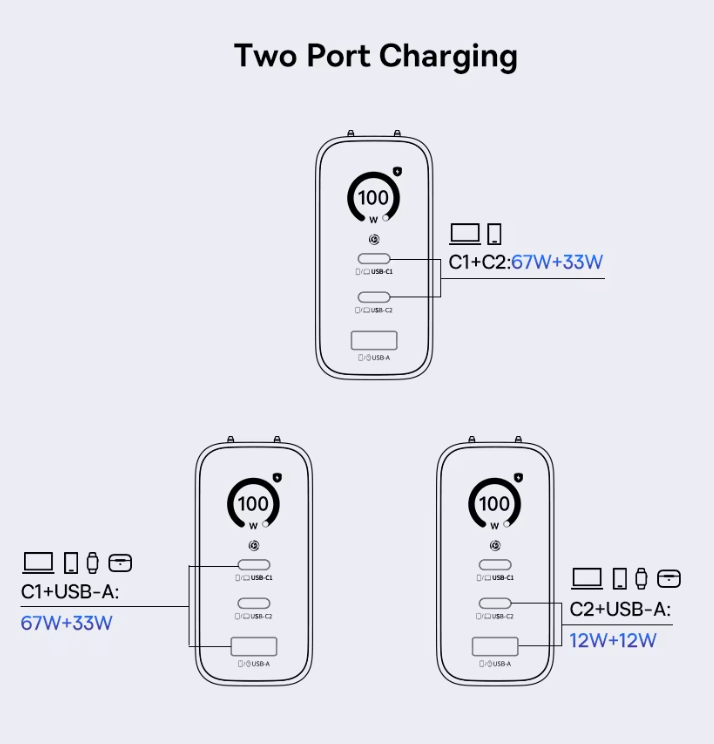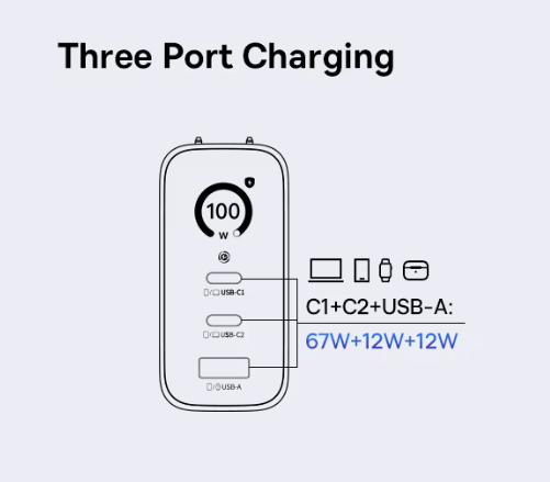 При одновременном подключении нескольких потребителей к зарядному устройству его общая выходная мощность 100 Вт распределяется следующим образом. При однопортовой зарядке порты USB-C1 и USB-C2 могут выдавать до 100 Вт каждый, а порт USB-A — до 33 Вт. При двухпортовой зарядке мощность распределяется по-разному: C1 + C2 дают 67 Вт + 33 Вт соответственно; C1 + USB-A дают 67 Вт + 33 Вт; а C2 + USB-A распределяют мощность как 12 Вт + 12 Вт. Наконец, при трёхпортовой зарядке (C1 + C2 + USB-A) мощность распределяется между портами как 67 Вт + 12 Вт + 12 Вт. Мощность, доступная каждому порту, зависит от того, сколько портов используется одновременно.