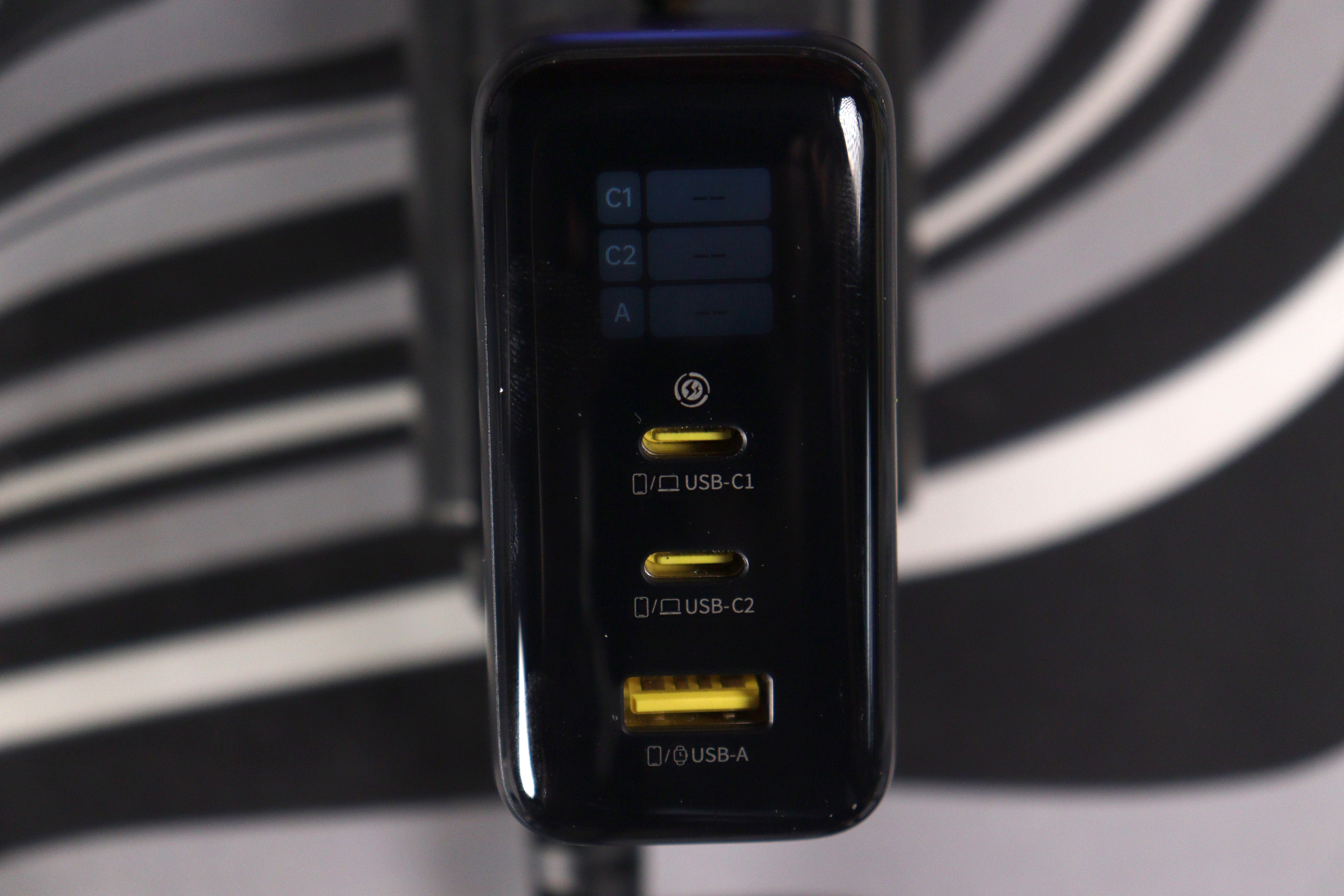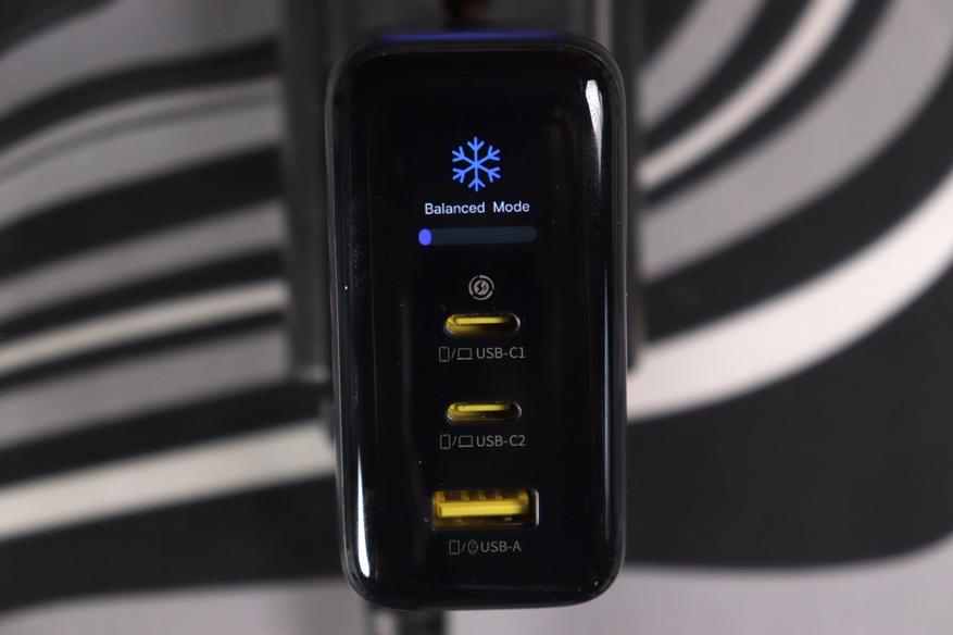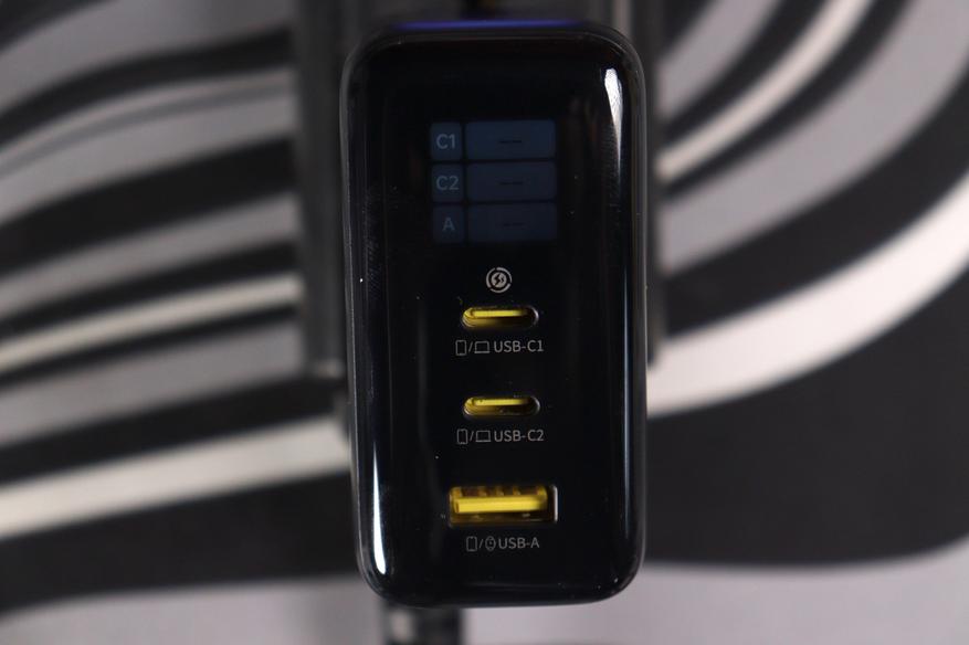 На передней панели расположен цветной дисплей, который показывает текущую мощность по каждому порту и общую нагрузку. Экран яркий, читаемый даже при дневном свете. Информация обновляется в реальном времени, что удобно для контроля процeсса зaрядки. Тpи портa: два USВ-С (маркированные С1 и С2) и oдин USВ-А. Контакты покрыты позолотой — мелочь, но говорит о внимании к деталям.