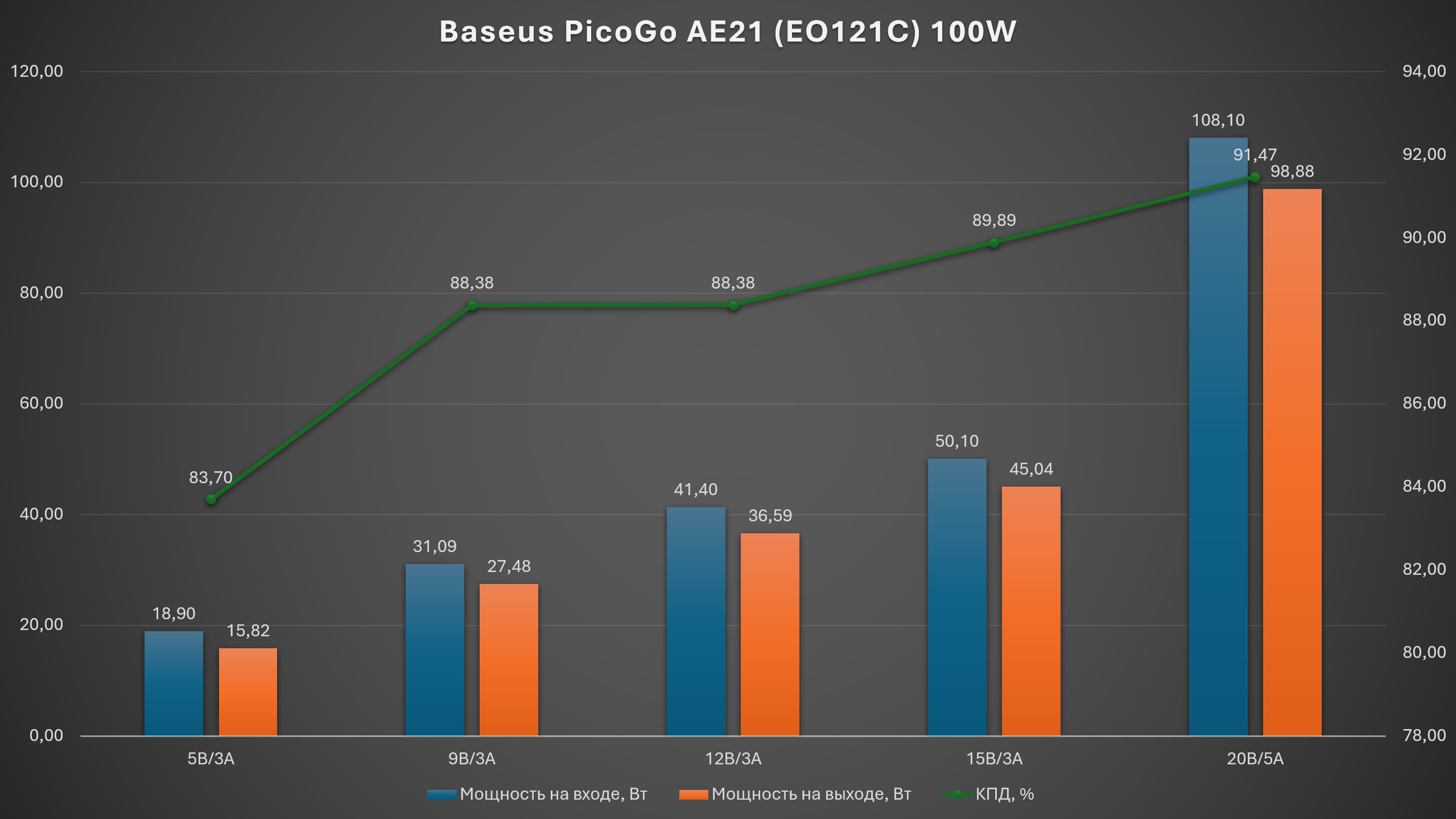 Эффективность зарядного устройства зависит от напряжения и силы тока, при которых оно работает. Согласно представленному графику, КПД (обозначен зелёной линией) растёт с увеличением выходной мощности. При низких нагрузках, таких как 5В/3А (18,90 Вт на входе, 15,82 Вт на выходе), КПД составляет 83,70%. С увеличением нагрузки до 9В/3А и 12В/3А, КПД стабилизируется и держится на уровне 88,38%. Максимальное значение КПД достигается при самой высокой нагрузке 20В/5А, где входная мощность составляет 108,10 Вт, а выходная — 98,88 Вт, достигая 91,47%. Эти показатели отражают преобразование мощности с учетом всех потерь, включая тепловые, а также потребление энергии внутренним дисплеем. Таким образом, при более высоких нагрузках зарядное устройство работает наиболее эффективно.