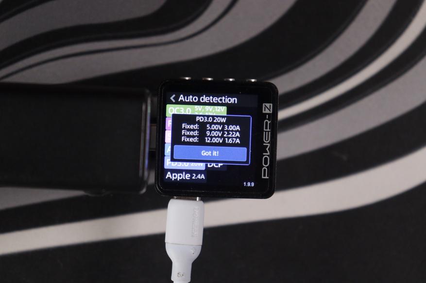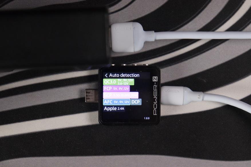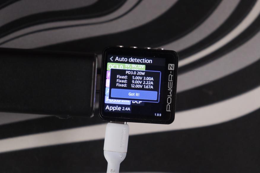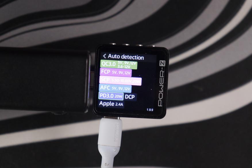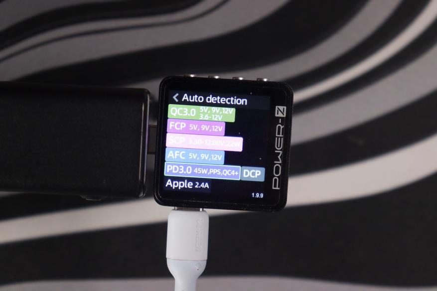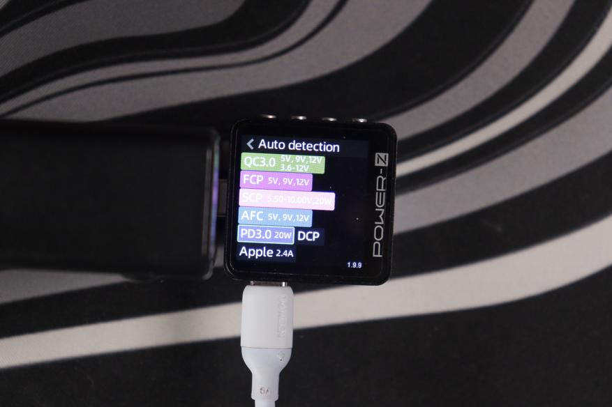 Проверил поддержку протоколов с помощью Power-Z тестера. USB-C порты понимают полный набор: QC3.0 (5V/9V/12V, 3.6-12V), FCP (5V/9V/12V), SCP (3.3-5.9V/11V/20V, 20W), AFC (5V/9V/12V), PD3.0 с фиксированными напряжениями 5V/9V/12V/15V/20V плюс PPS (5-11V при 4.5A) и DCP с Apple 2.4A. USB-A работает с QC3.0, AFC и FCP — тоже полный комплект для старых устройств.