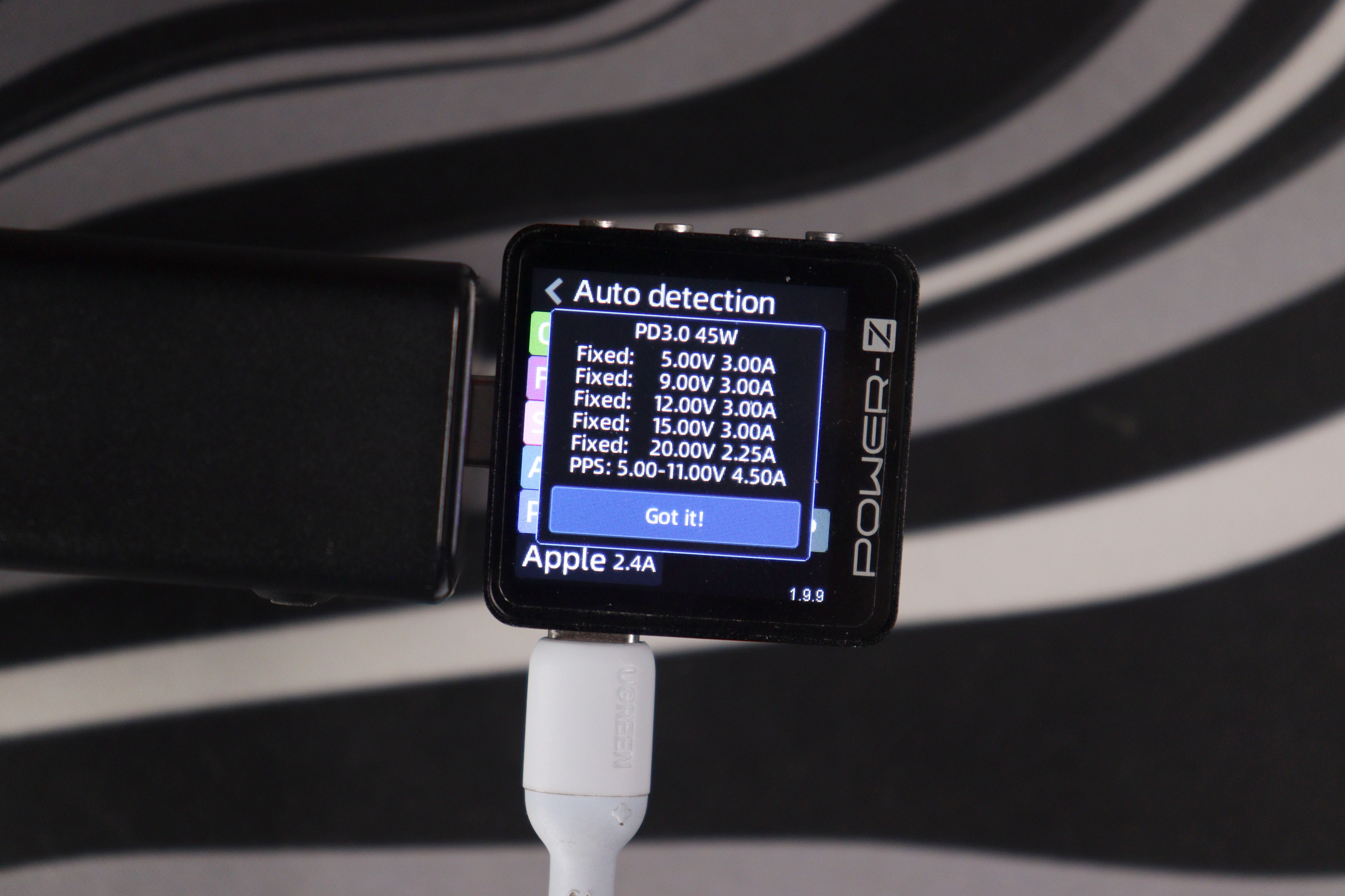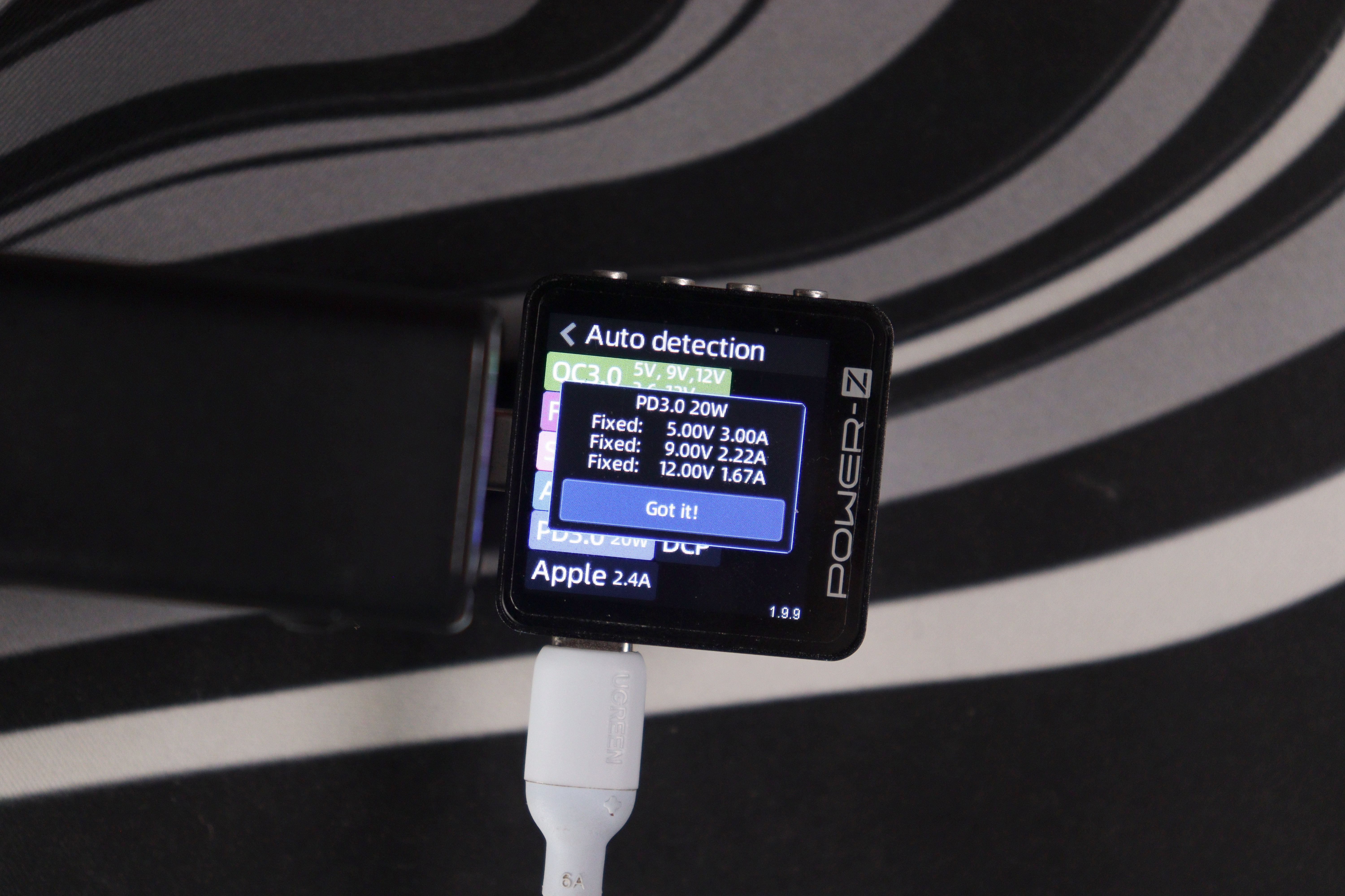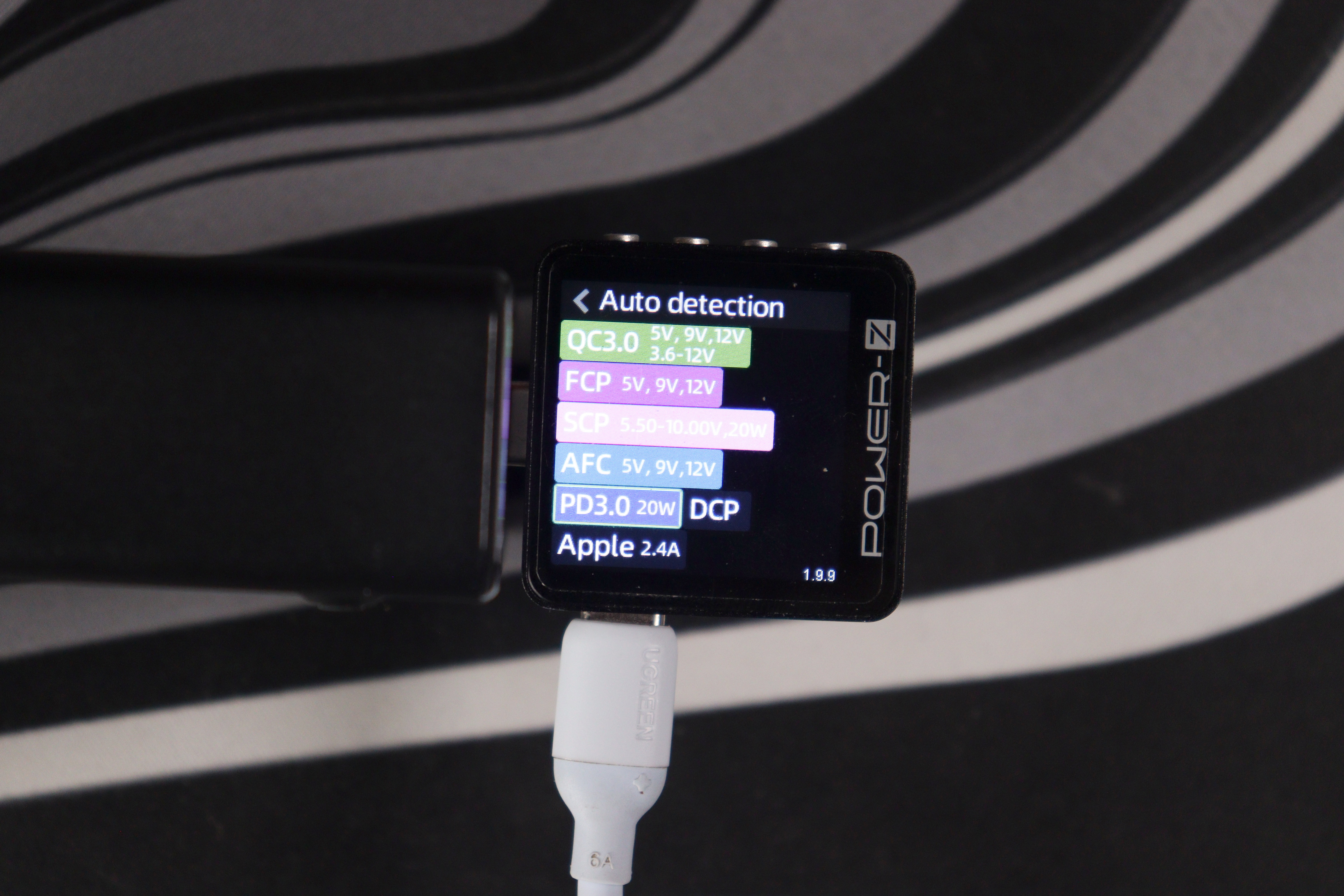 Проверил поддержку протоколов с помощью Power-Z тестера. USB-C порты понимают полный набор: QC3.0 (5V/9V/12V, 3.6-12V), FCP (5V/9V/12V), SCP (3.3-5.9V/11V/20V, 20W), AFC (5V/9V/12V), PD3.0 с фиксированными напряжениями 5V/9V/12V/15V/20V плюс PPS (5-11V при 4.5A) и DCP с Apple 2.4A. USB-A работает с QC3.0, AFC и FCP — тоже полный комплект для старых устройств.
