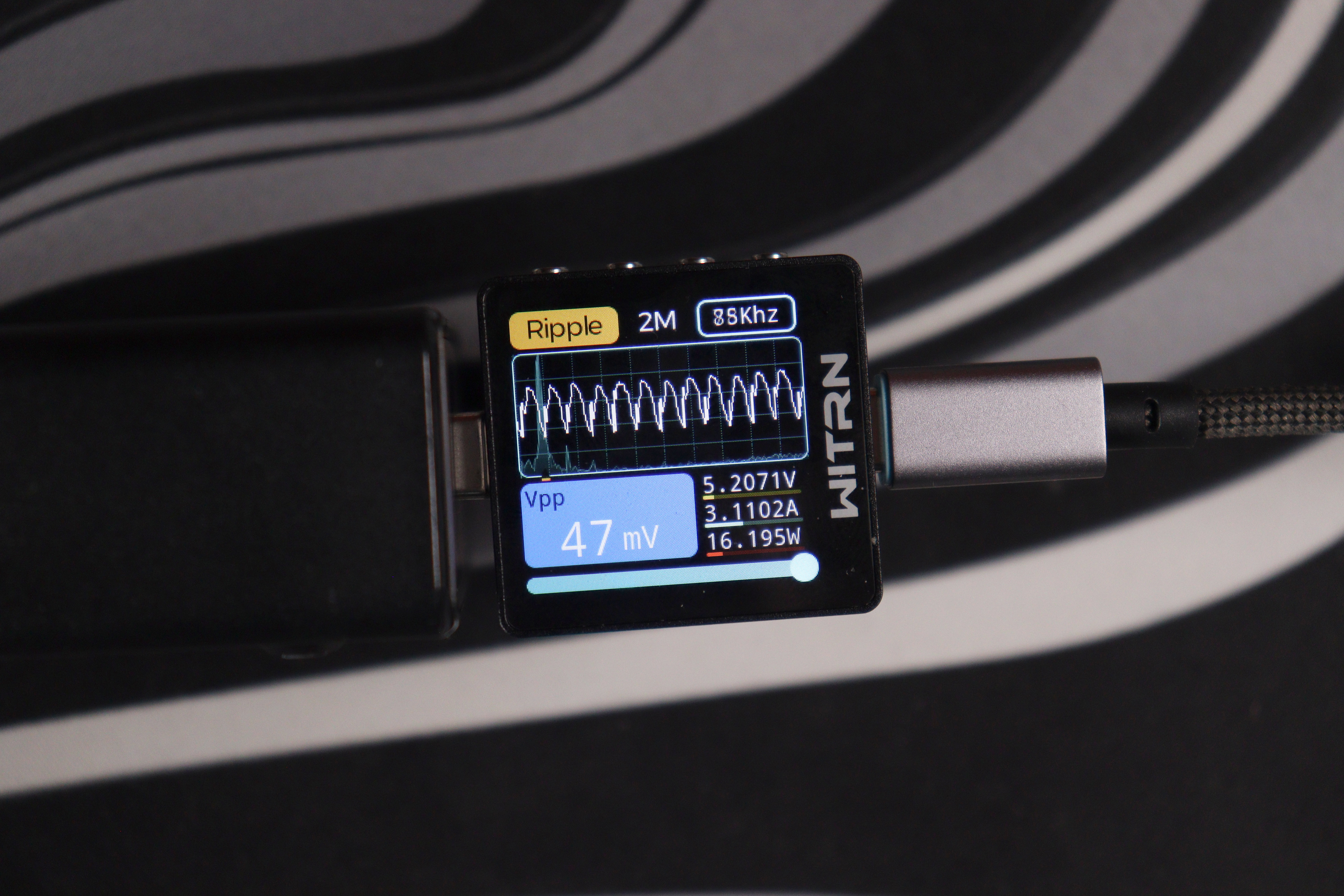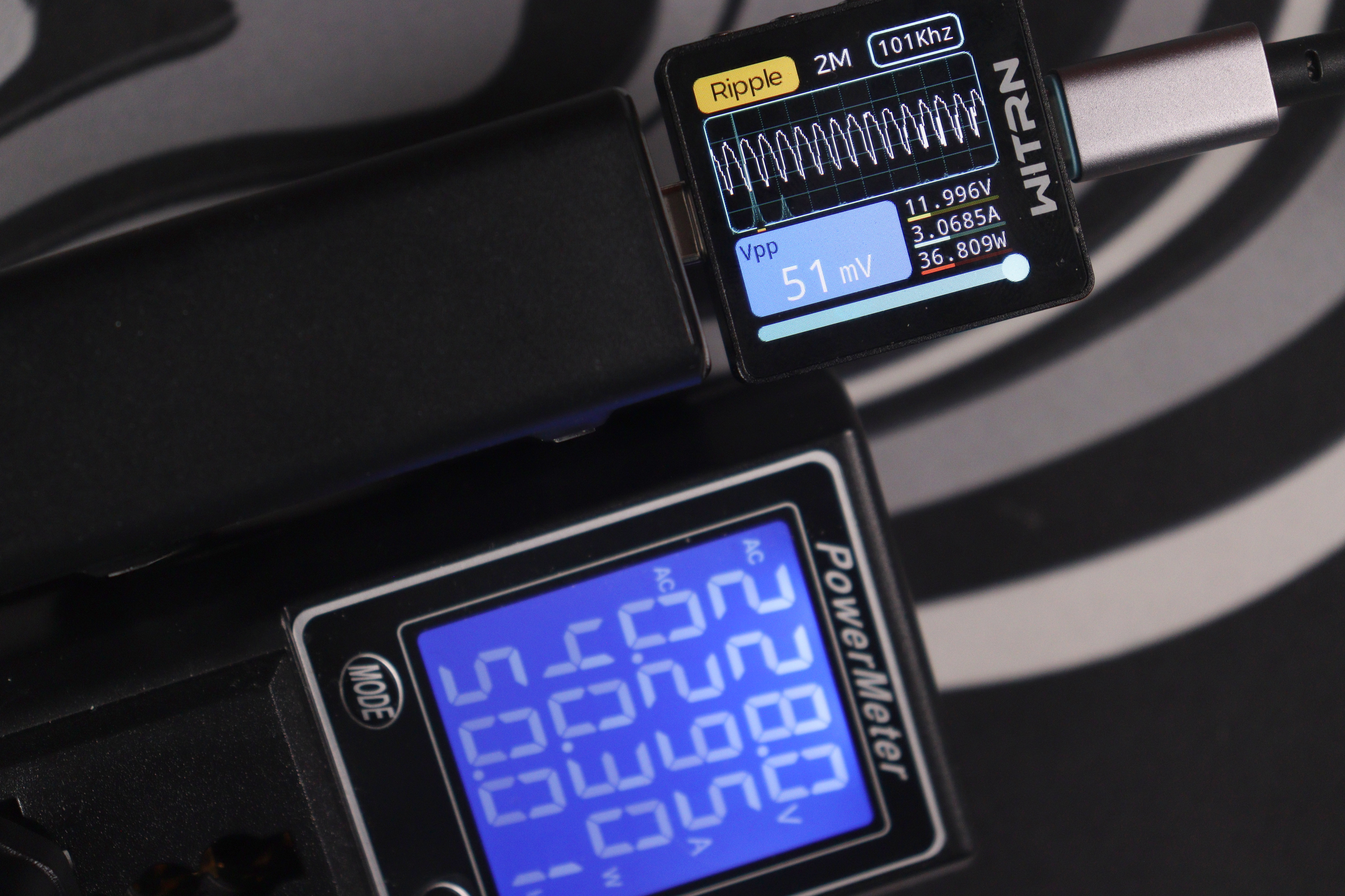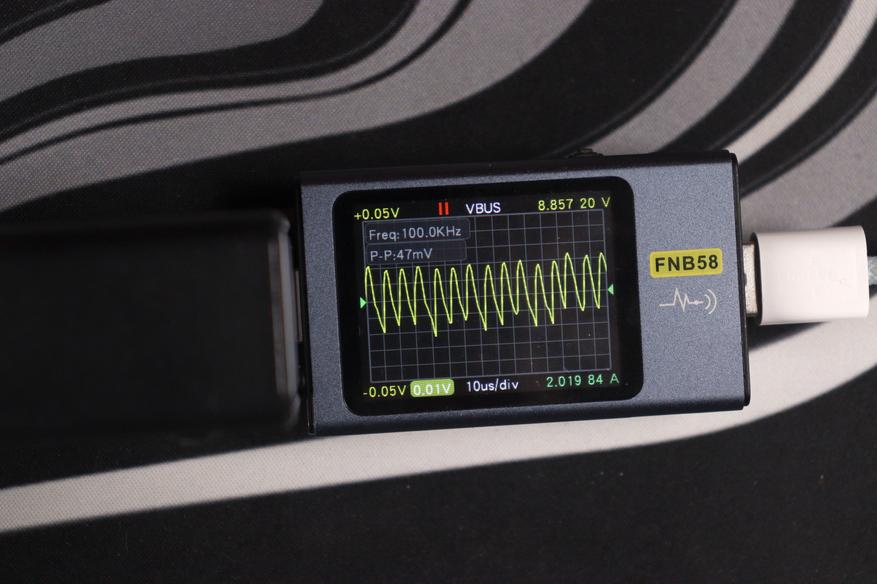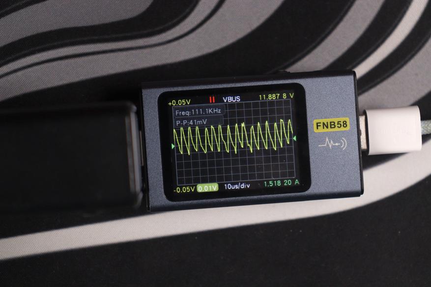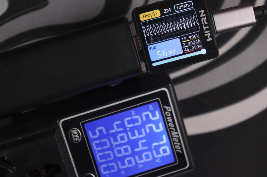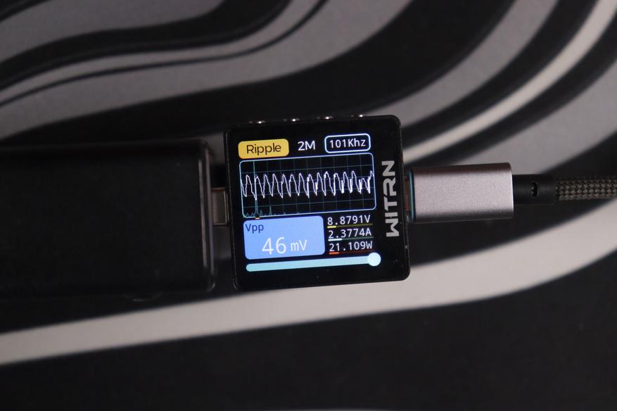 Главное преимущество перед более дорогой Nexode CD327 — отсутствие перезагрузки портов при подключении новых устройств и PPS до 5А. Это реально удобно в повседневном использовании: можно спокойно подключить ещё один гаджет, и зарядка мгновенно перераспределит мощность без разрыва питания на уже работающих портах. Nexode при всех своих достоинствах такой фичи не имеет — там при изменении конфигурации портов происходит кратковременная перезагрузка всех линий. Качество пластика, конечно, хуже — покрытие быстро пачкается и выглядит дешевле, но это скорее эстетический момент, который не влияет на работу. Замеры показали отличное качество выходного сигнала: низкие пульсации на всех режимах работы, стабильное напряжение даже при пиковой нагрузке, минимальный нагрев благодаря эффективным GaN-компонентам.