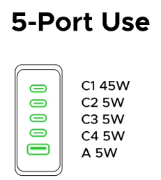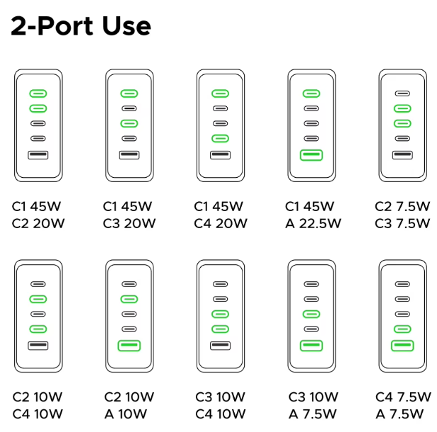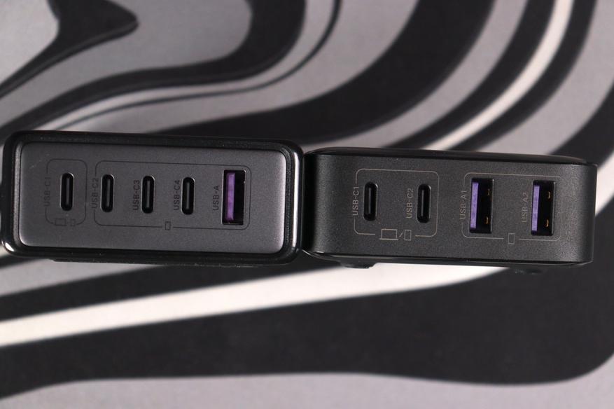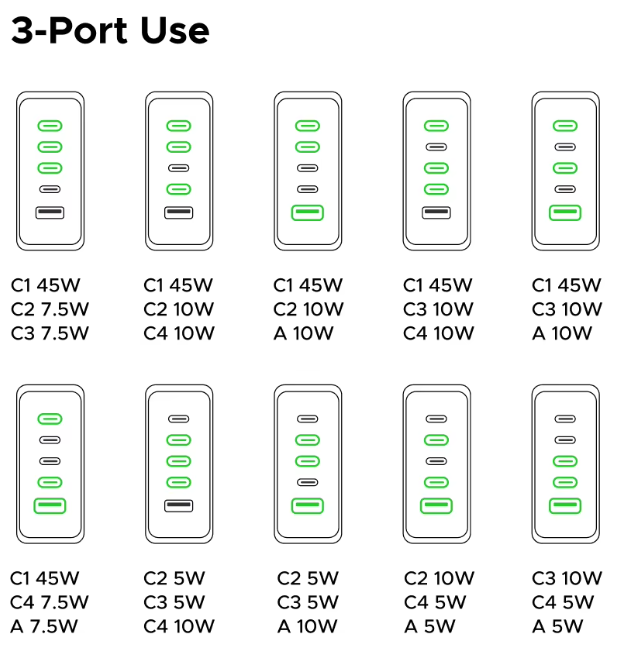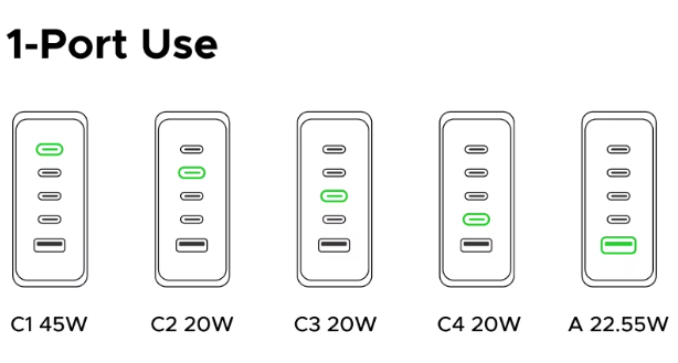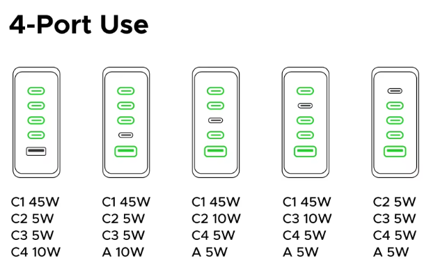 Логика распределения понятная: порт C1 — «король» и всегда получает свои 45W, если он используется. Остальные 20W делятся между оставшимися портами более-менее равномерно. Это разумный подход для настольной зарядки, где обычно один прожорливый ноутбук и несколько мелких гаджетов.