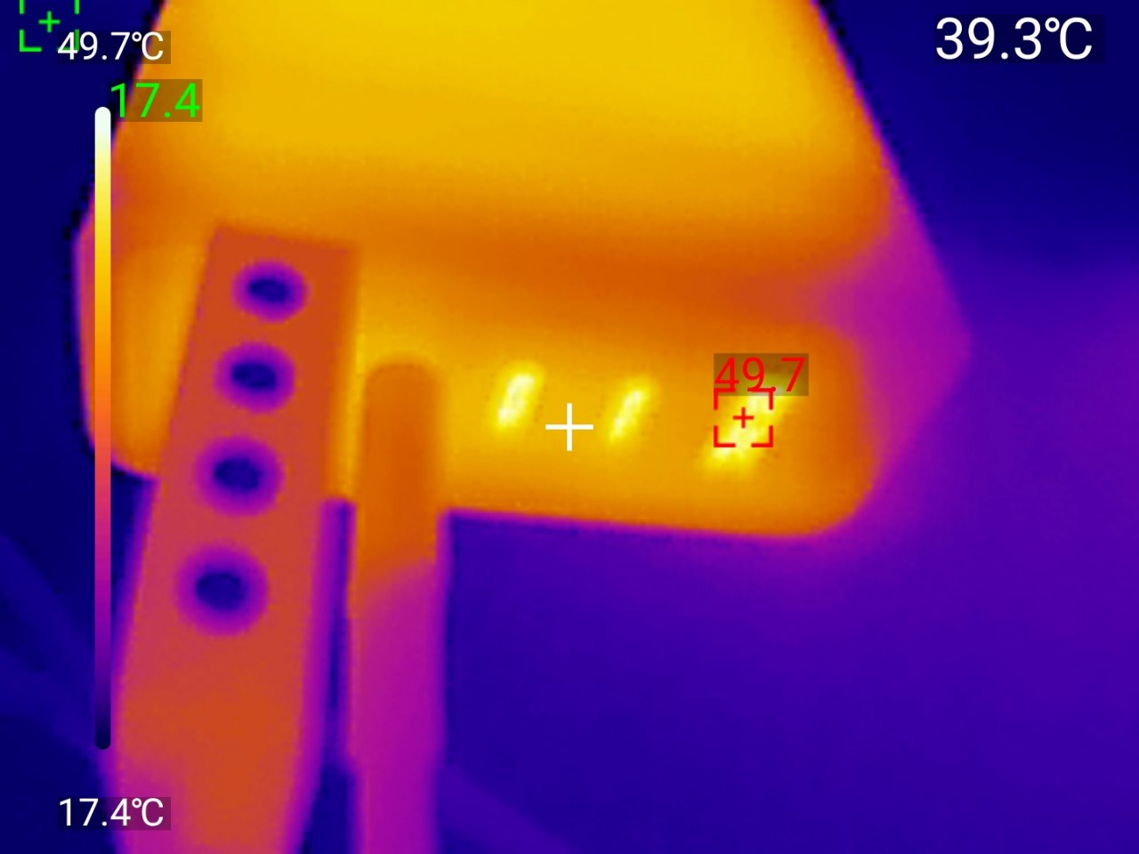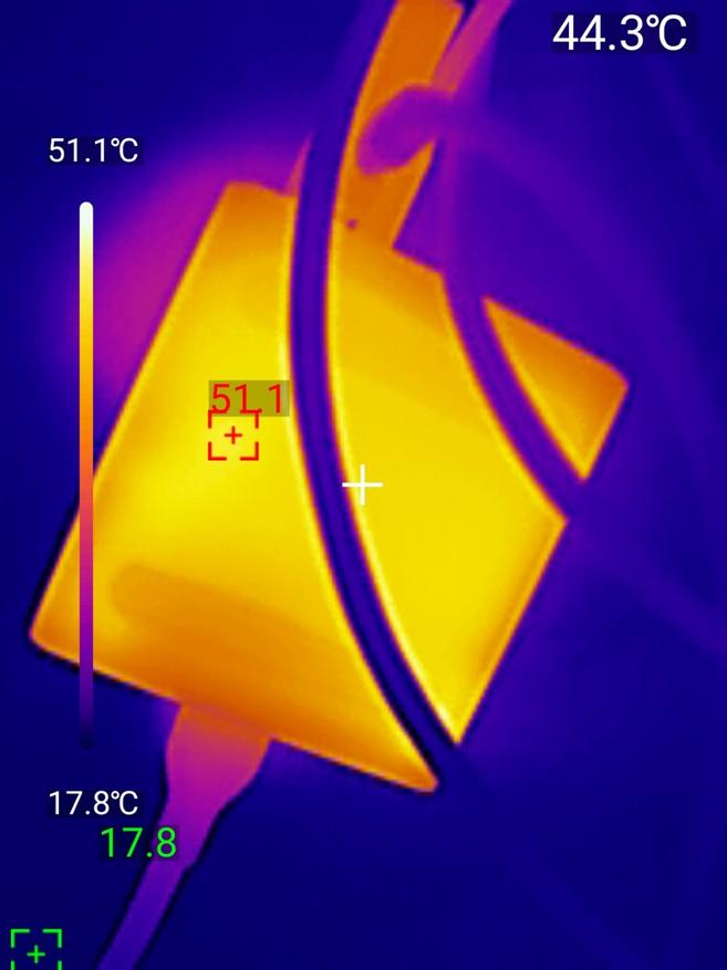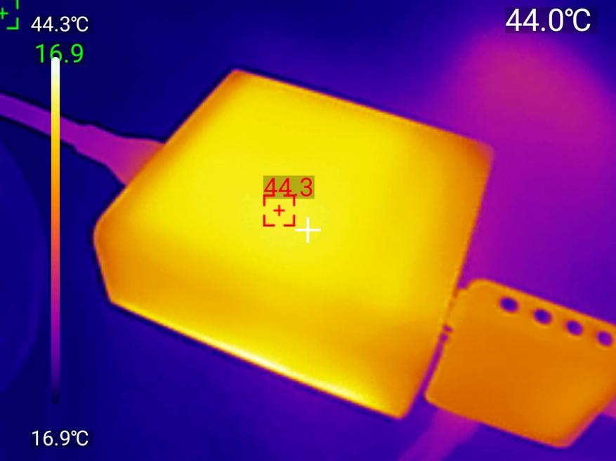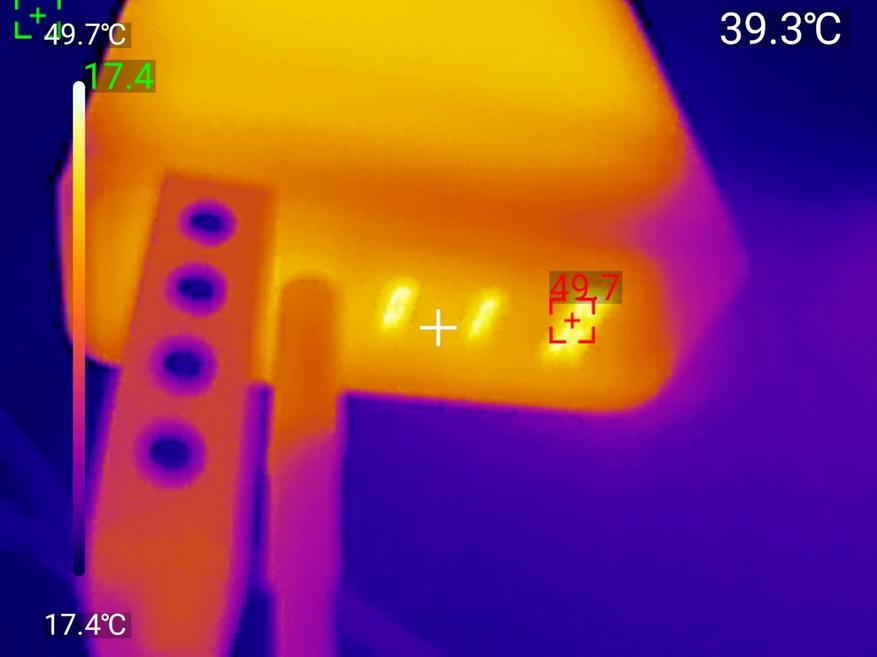 Результаты впечатляют, по показаниям тепловизора корпус нагрелся до 44.3°C и 51.1 на нижней стороне — это очень умеренный нагрев для полной нагрузки. Самая горячая точка в районе портов показала 49.7°C, что тоже безопасная температура.