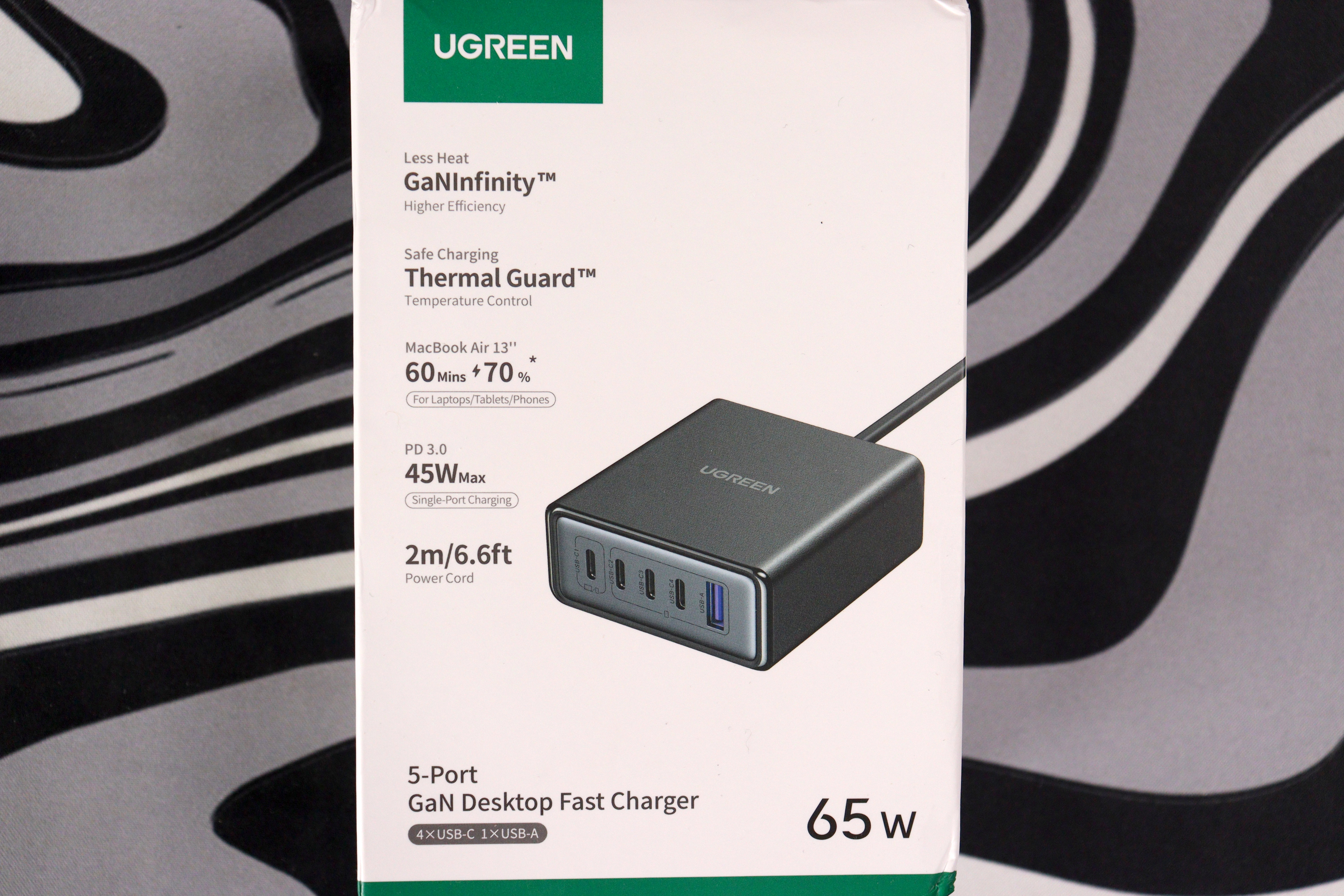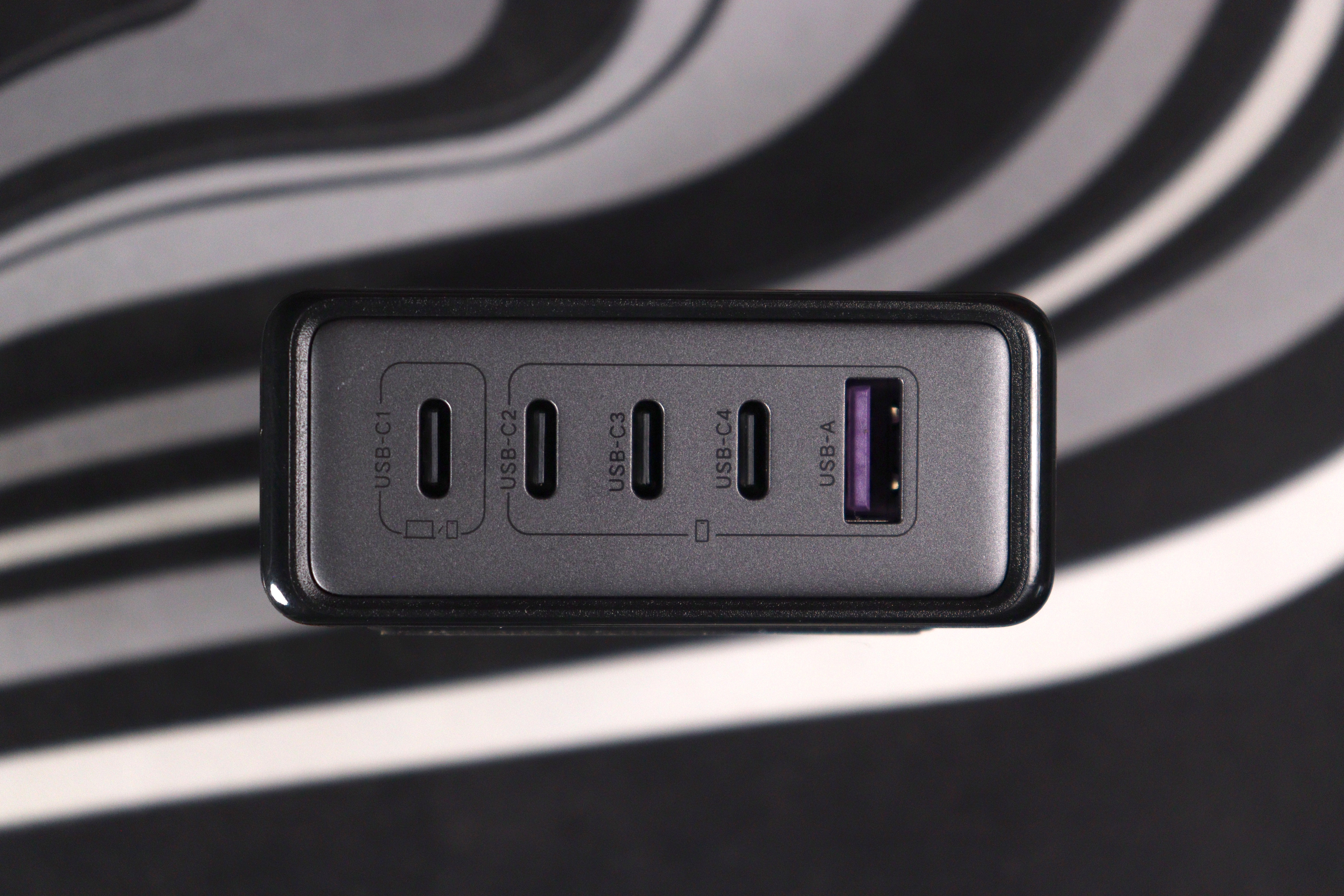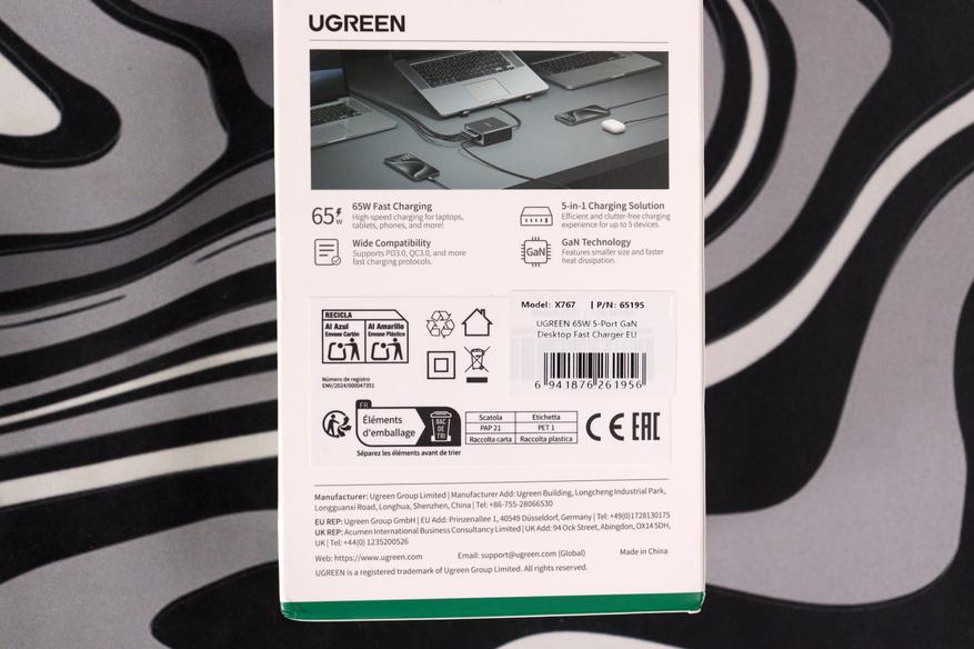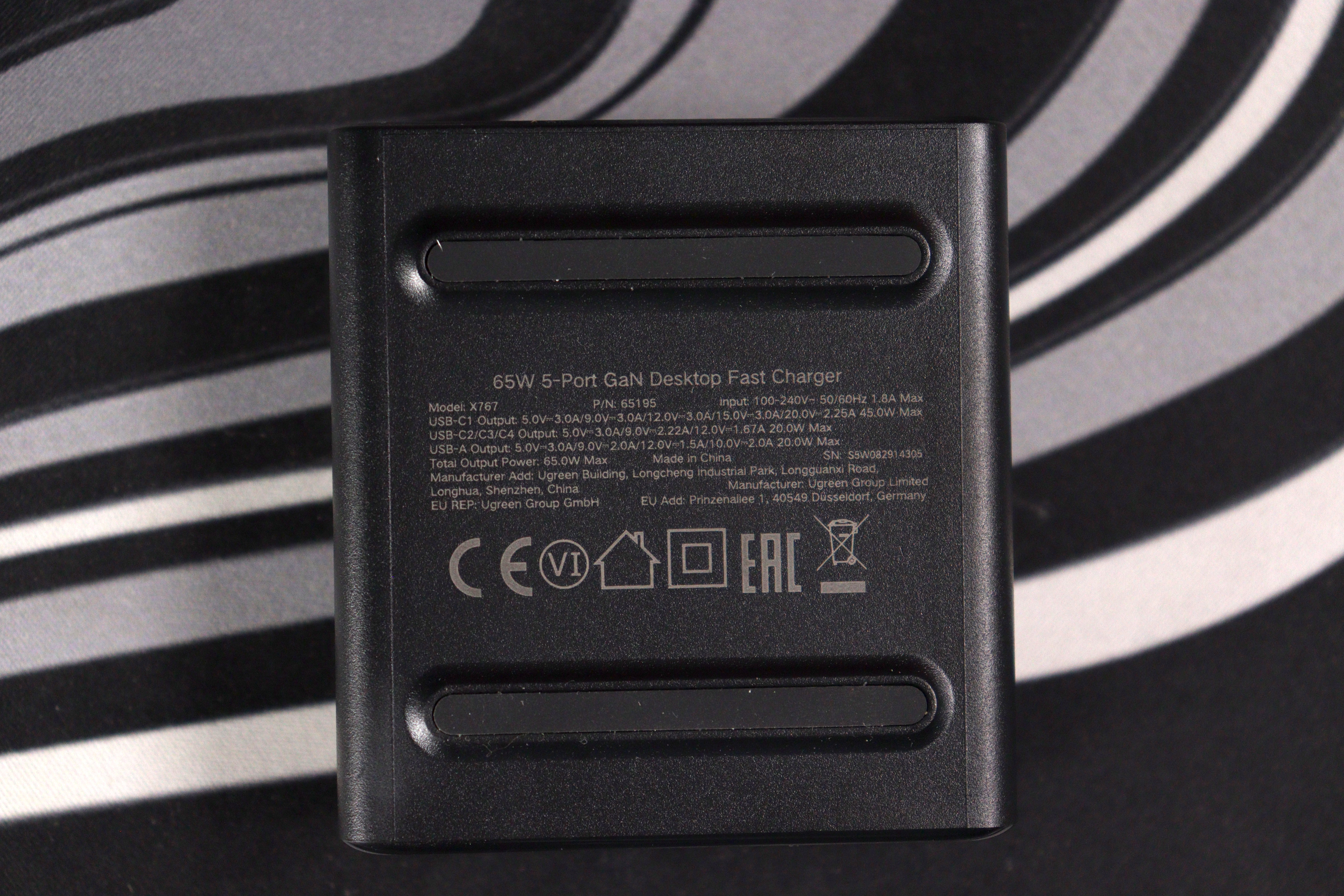 X767 выполнена в чёрном матовом пластике с лёгкой шагренью. Покрытие собирает отпечатки пальцев моментально — это первый намёк на удешевление конструкции. Логотип UGREEN нанесён сверху серым цветом, выглядит неброско. На лицевой панели расположены четыре USB-C порта и один USB-A с фиолетовым язычком (Quick Charge). Маркировка портов выполнена рельефом: C1, C2, C3, C4 и A. Под портами нанесена информация о максимальной мощности на каждый разъём.