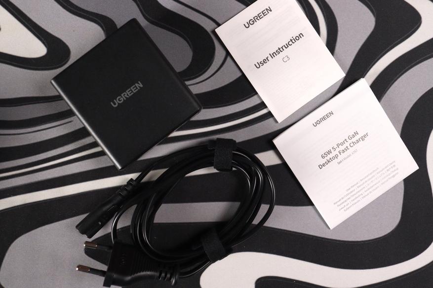 В коробке минимум: само зарядное устройство, двухметровый кабель питания с евровилкой и бумажная инструкция. Кабель достаточно толстый и гибкий, длина позволяет удобно разместить блок на столе. Никаких переходников или USB-кабелей в комплекте нет — только то, что нужно для подключения к розетке.