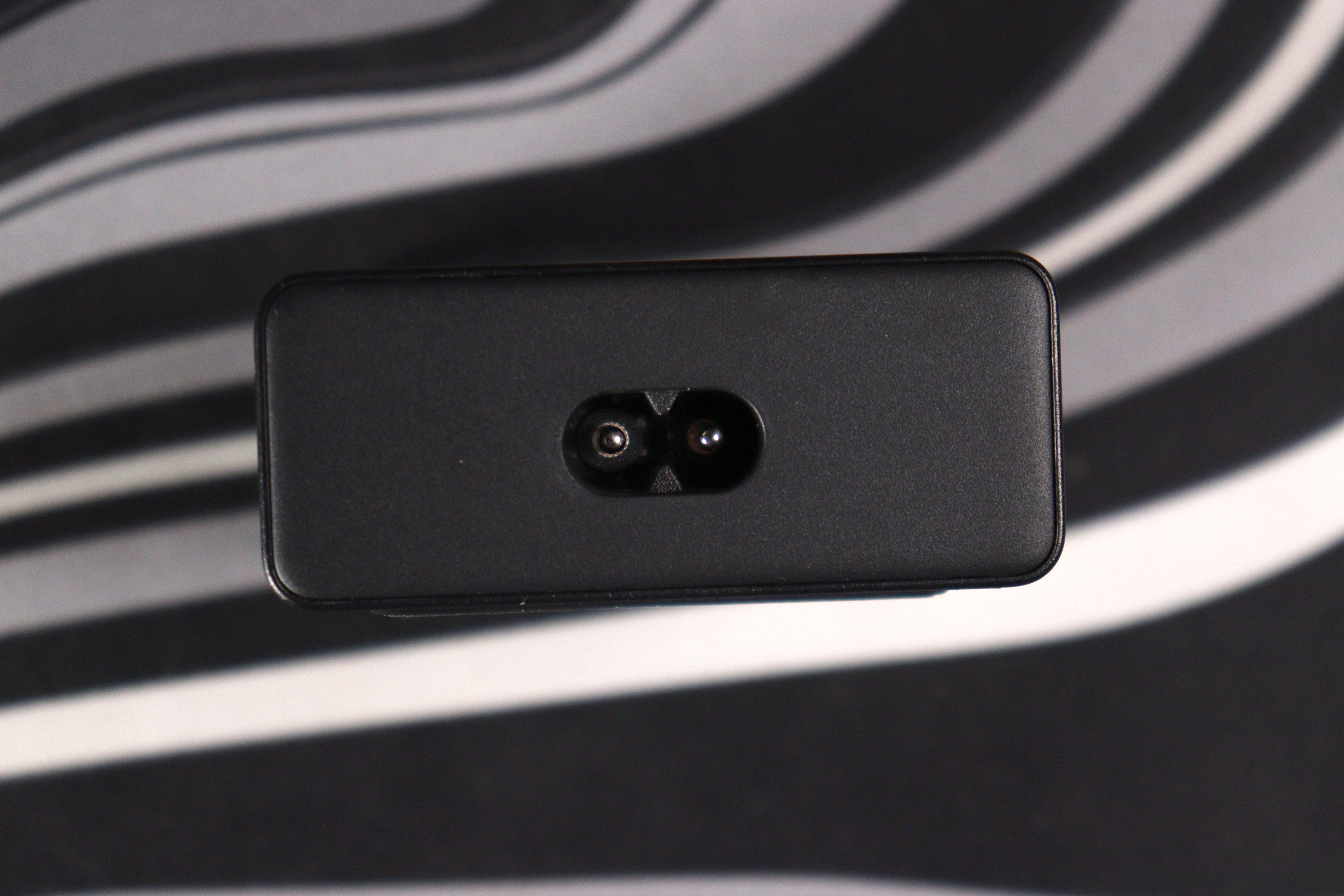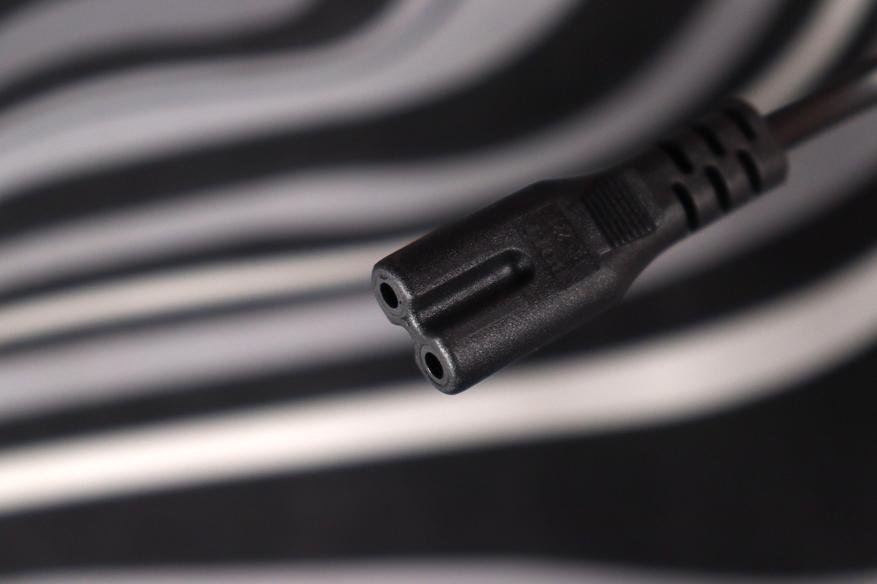 Снизу находятся технические характеристики и сертификационные значки. Есть два паза для настенного крепления, хотя с двухметровым кабелем это решение сомнительное. Вилка съёмная, подключается через стандартный разъём C8 (восьмёрка).