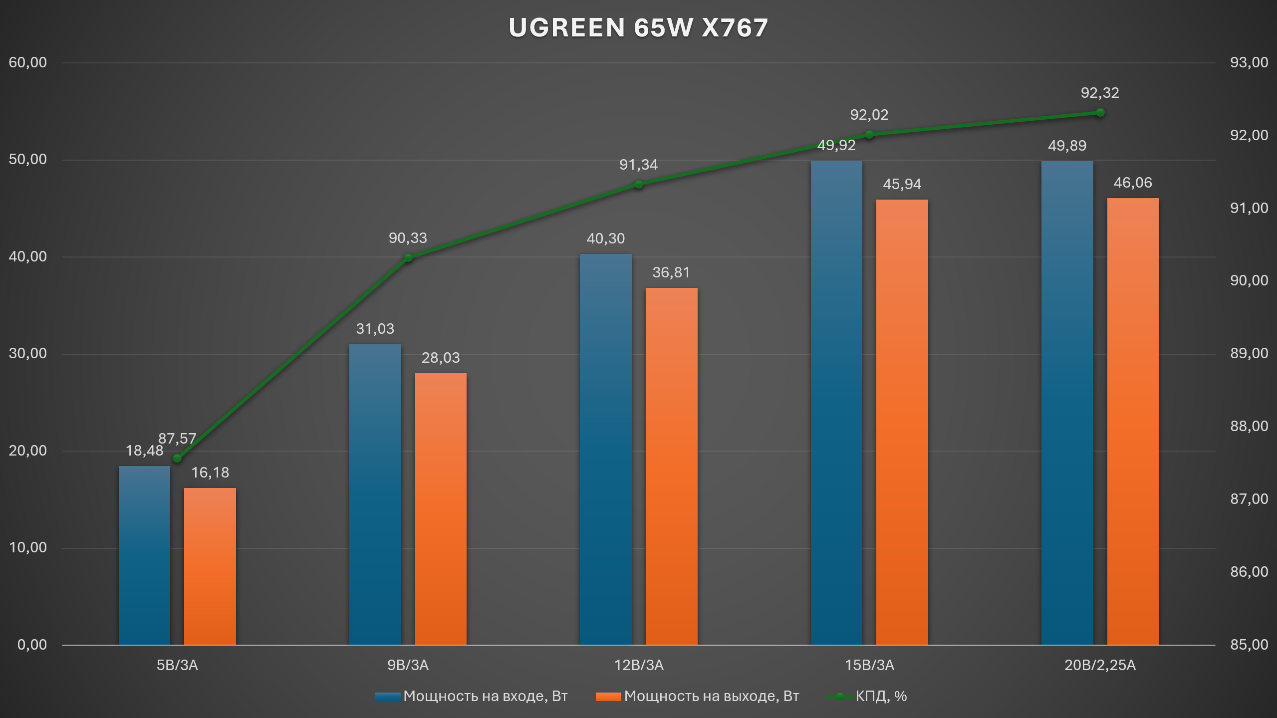 Зарядное устройство UGREEN 65W X767 демонстрирует отличную энергоэффективность: его КПД варьируется от 87,57% в базовом режиме (5В) до впечатляющих 92,32% при максимальном напряжении (20В). График наглядно подтверждает характерную для качественных GaN-адаптеров тенденцию — эффективность устройства растет вместе с выходным напряжением, достигая пика в «ноутбучных» режимах (15В-20В), где потери на преобразование минимальны. Это означает, что при зарядке мощной техники адаптер работает максимально эффективно и выделяет крайне мало избыточного тепла, что подтверждает высокий уровень схемотехники и использование качественных компонентов.