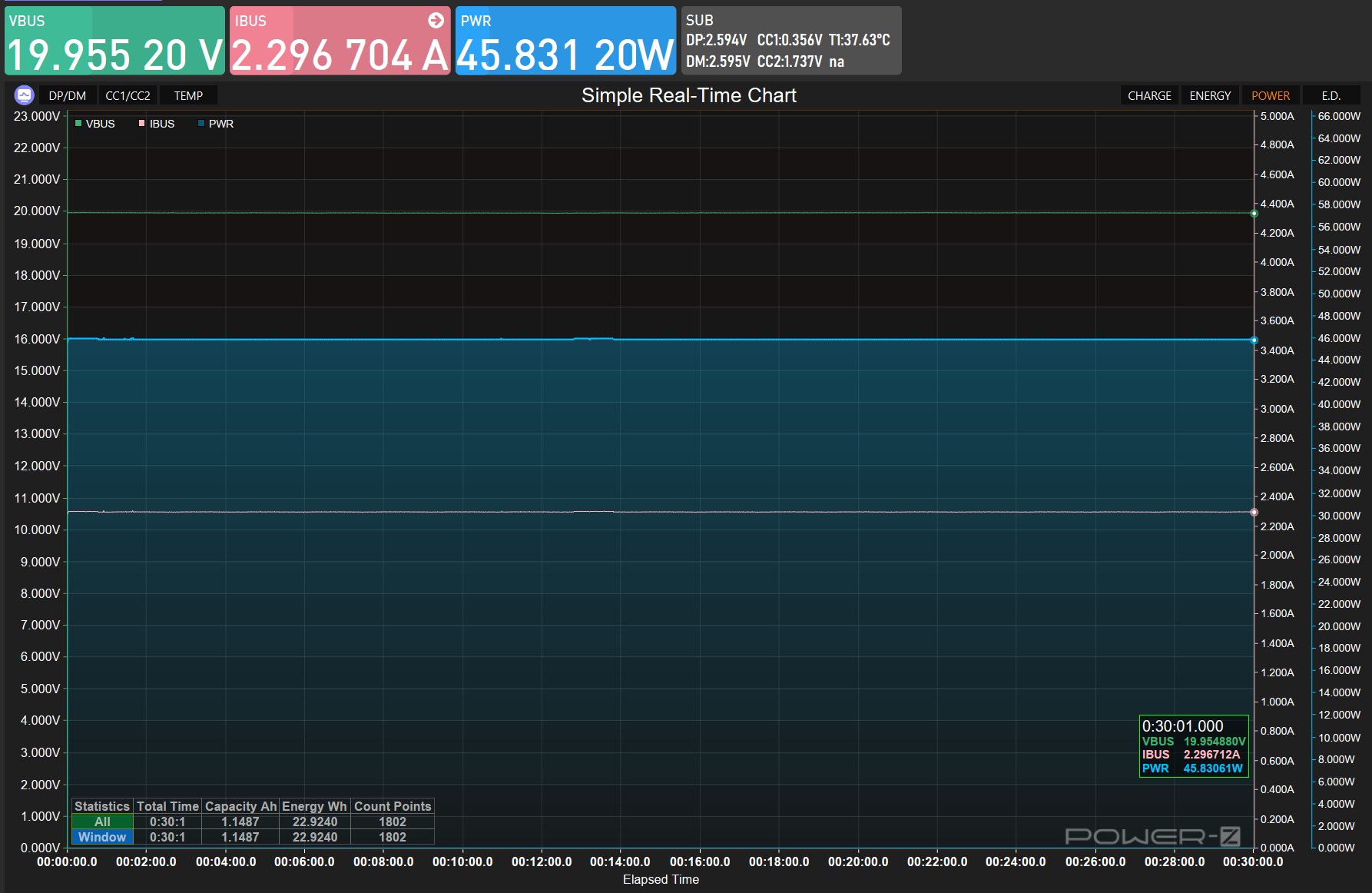 Провёл получасовой стресс-тест на максимальной мощности 65W (распределённой между портами). График с первого разъема показал идеальную стабильность: напряжение держалось ровно на 20V без просадок, ток 2.3A, мощность 45.8W на протяжении всего получасового теста. Никаких скачков, просадок или троттлинга — прямая горизонтальная линия на графике. Температура внутренних компонентов по данным тестера: DP (основной чип) — 37.63°C, что говорит об эффективной работе GaN-транзисторов и хорошем теплоотводе.