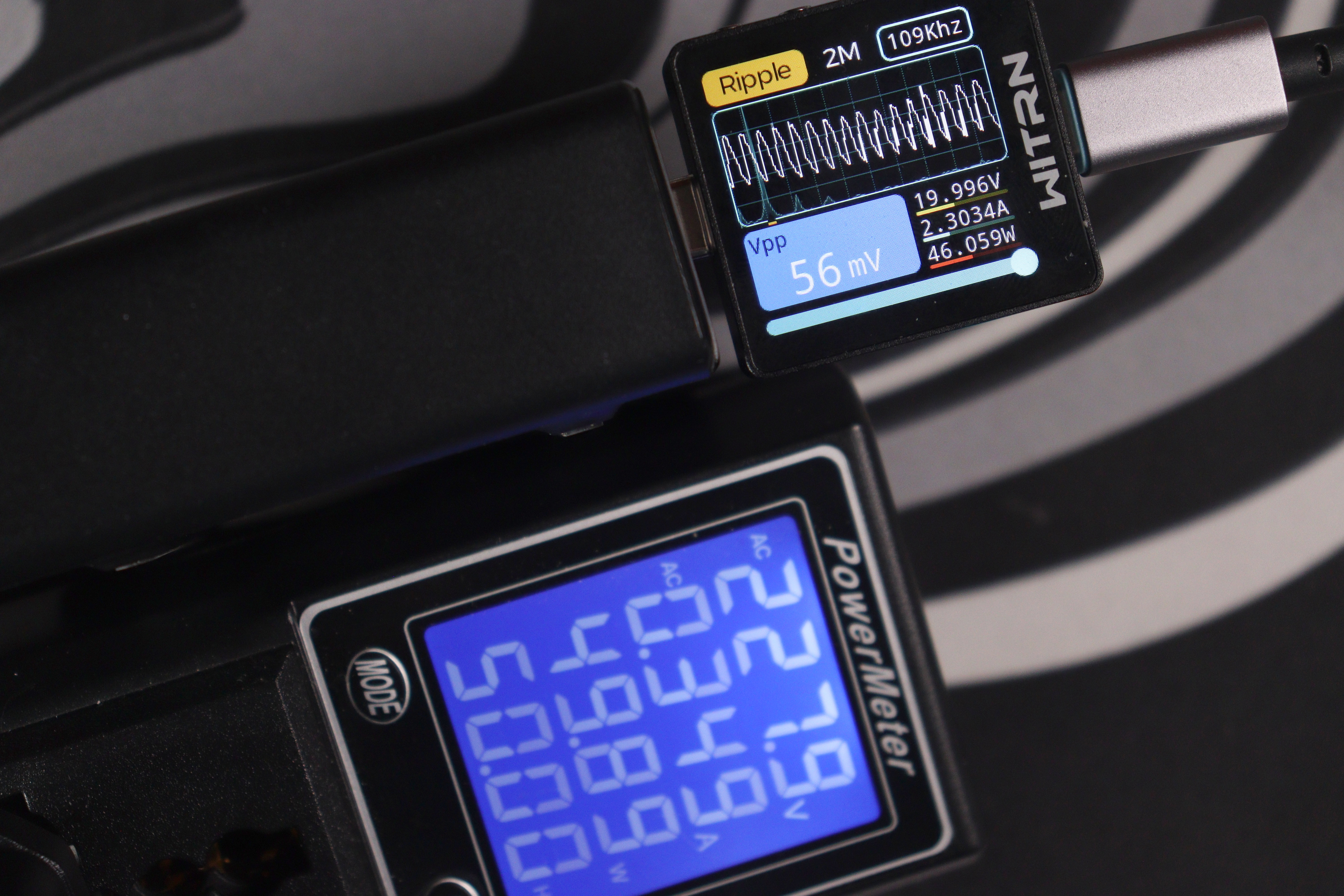 Все четыре USB-C порта и один USB-A показали стабильную работу во всех режимах с точным соблюдением стандартов PD3.0 и QC3.0. Порт C1 выдаёт фиксированные напряжения 5V/9V/12V/15V/20V с токами от 3A до 2.25A, максимум 45W, плюс PPS-режим 5-11V при 4.5A, причём на всех режимах пульсации не превышают 47-56mV. Порты C2, C3 и C4 работают на тех же напряжениях, но с ограничением тока до 20W максимум, а USB-A поддерживает классический 5V/3A и QC3.0 до 22.5W с аналогично низкими пульсациями. При тестировании на максимальной нагрузке зарядка показала небольшой запас по мощности — вместо заявленных 45W на порту C1 реально выдавала 45.8-46W без просадок напряжения, что говорит о консервативных паспортных характеристиках. Измеренные значения напряжения отклонялись от номинала не более чем на 0.1-0.2V даже под полной нагрузкой, что подтверждает качественную стабилизацию. Такая точность и низкие пульсации делают X767 безопасной для зарядки чувствительной электроники вроде беспроводных наушников и умных часов.