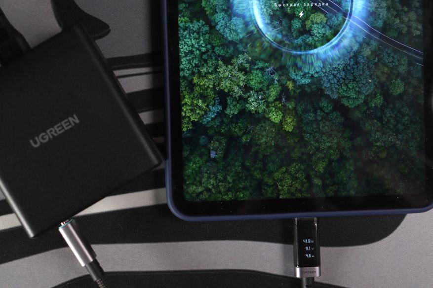 Роль тестового стенда досталась привередливому девайсу в лице планшета Xiaomi, где контроллер настроен на высокоскоростной прием энергии через PD PPS или собственный стандарт бренда. Чтобы исключить влияние периферии, соединение обеспечил проводом с лимитом 6 А, гарантирующим отсутствие потерь. Итоговые замеры подтвердили, что в любой конфигурации потребление ограничивается потолком самого источника питания в 5 А. В результате фактическая мощность 45 Вт, что четко фиксируется на представленных контрольных данных. Курьезный момент: вопреки более доступному позиционированию этой модели по сравнению с флагманской линейкой Nexode, её функционал PPS позволяет выдавать на планшет до 45 Вт. В то же время «старший» собрат имеет ограничение по силе тока в 3А, из-за чего его производительность в аналогичных условиях не поднимается выше 25 Вт.