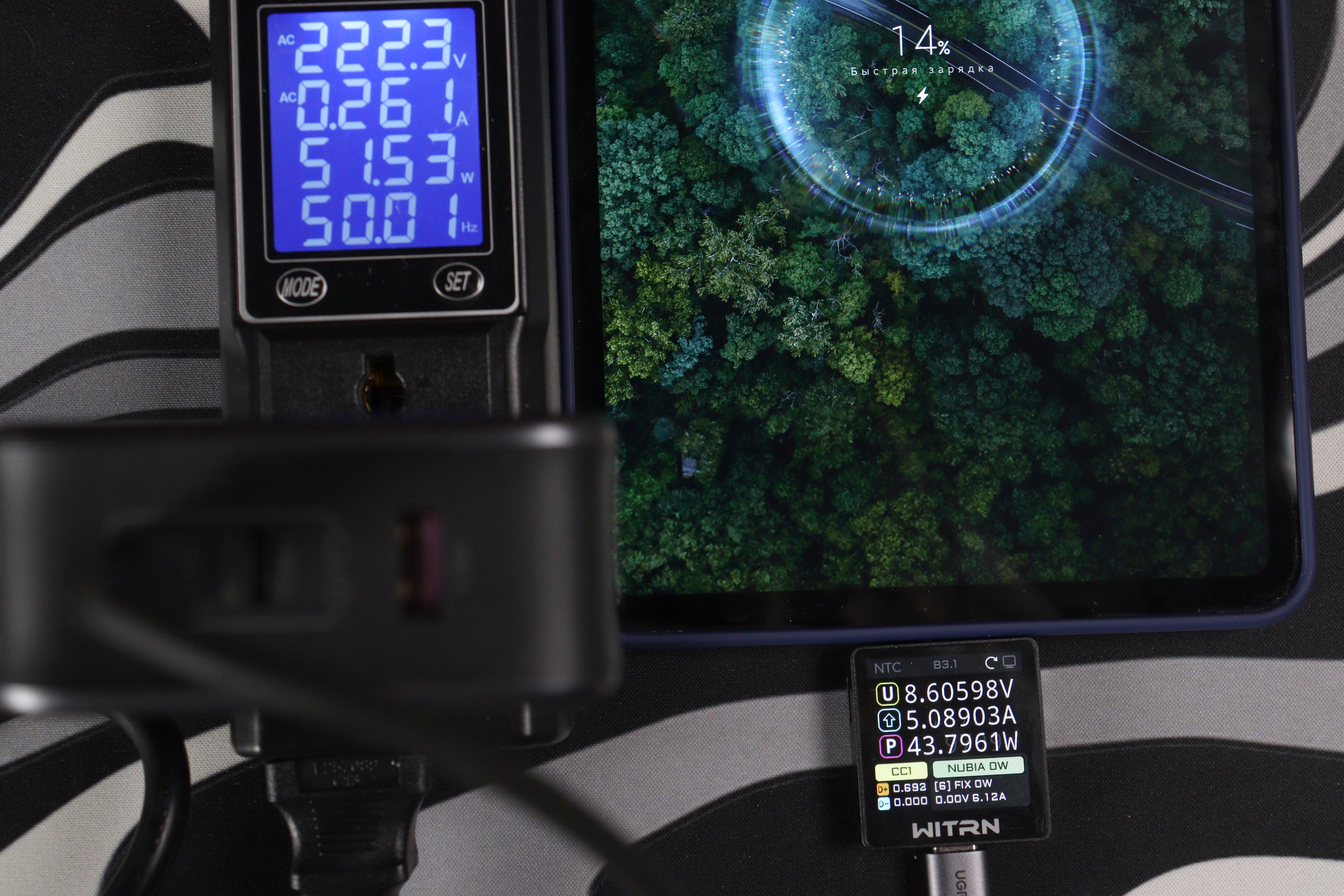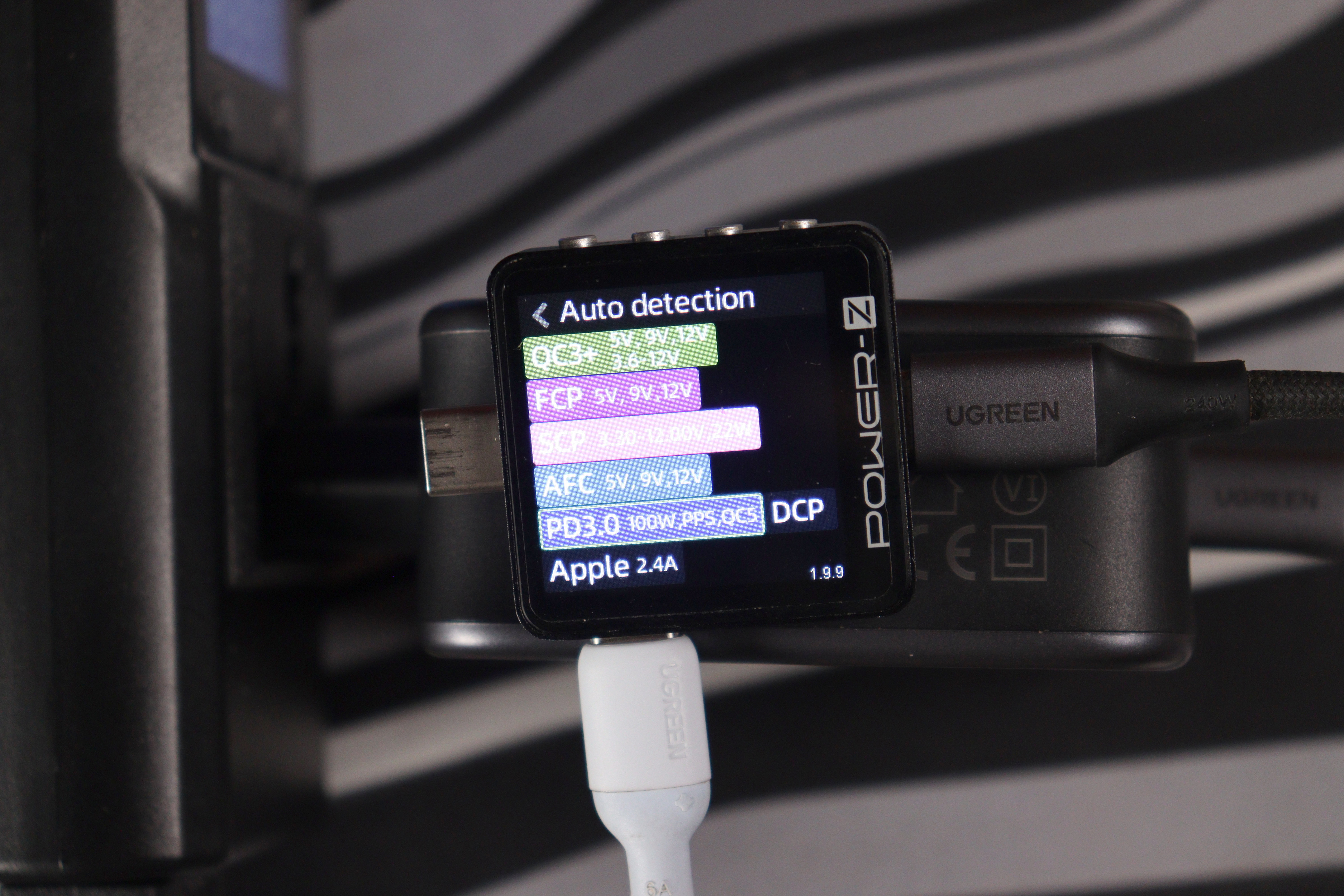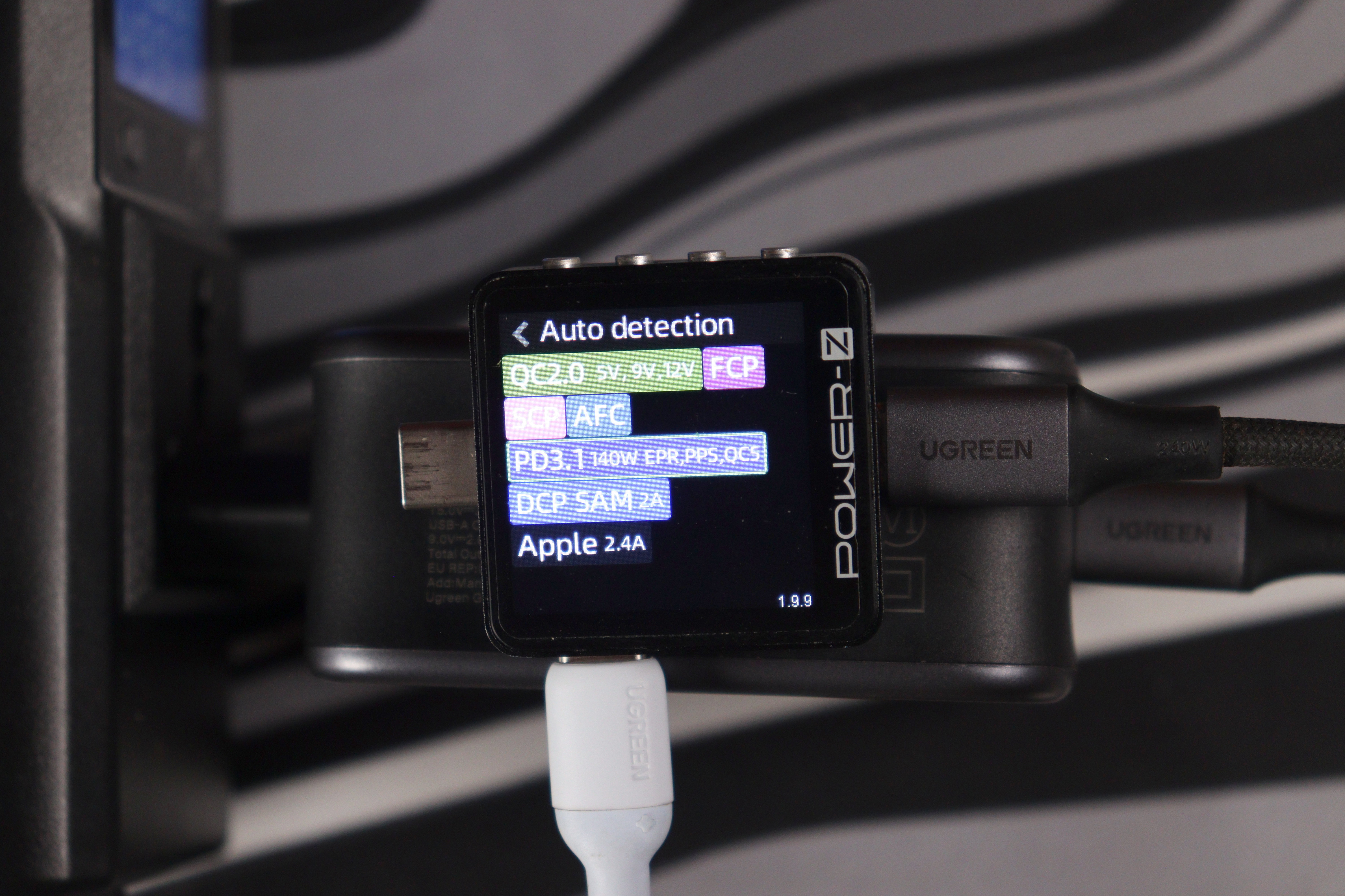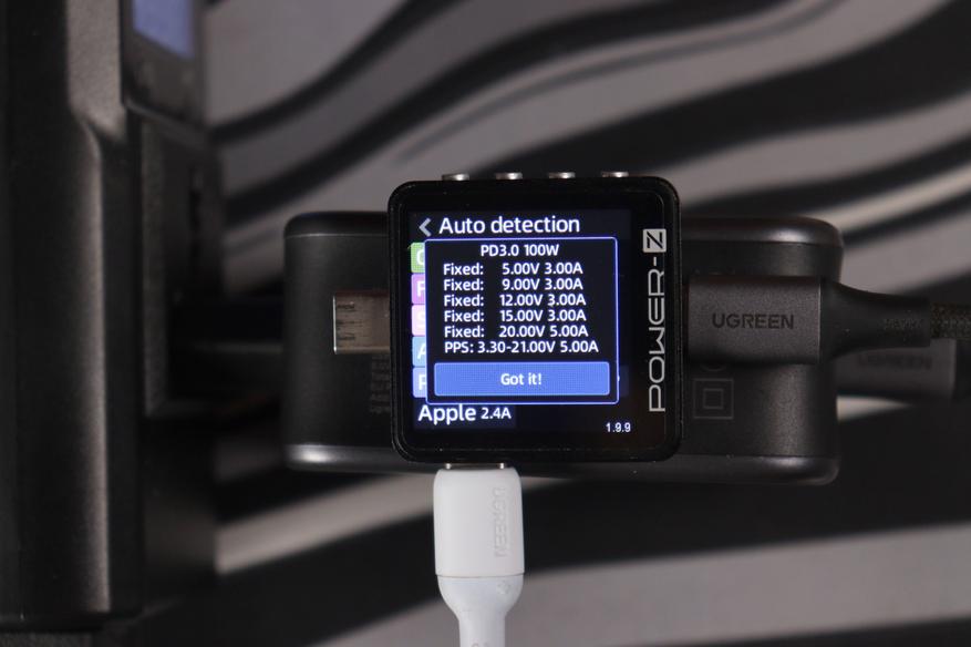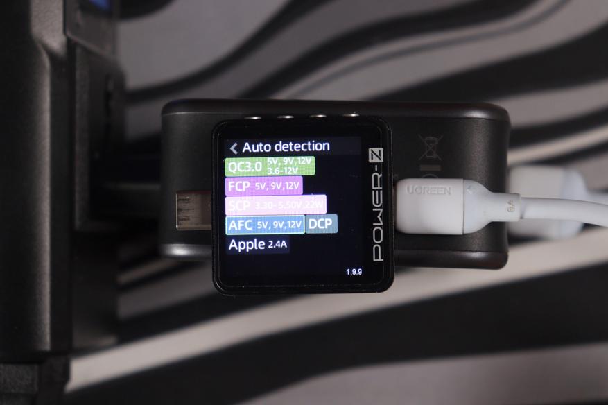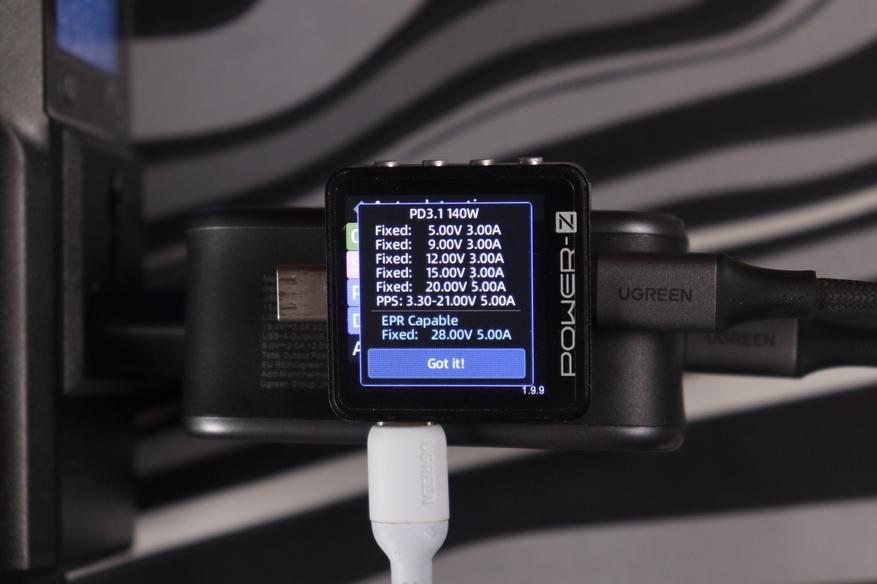 При использовании только порта C1 зарядка честно выдаёт заявленные 140 ватт. Протоколы быстрой зарядки поддерживаются все мыслимые: PD 3.1 с EPR до 28 вольт, PPS (программируемое питание от 3,3 до 21 вольт), QC 5, QC 3+, QC 2.0, AFC от Samsung, FCP от Huawei, Apple 2.4A и куча других. Тестер Power-Z показал полную совместимость со всеми протоколами — не придерёшься. Порт C2 сам по себе способен выдать до 100 ватт, но только если C1 не используется. Стоит подключить что-то в оба порта одновременно, и начинается динамическое распределение мощности.