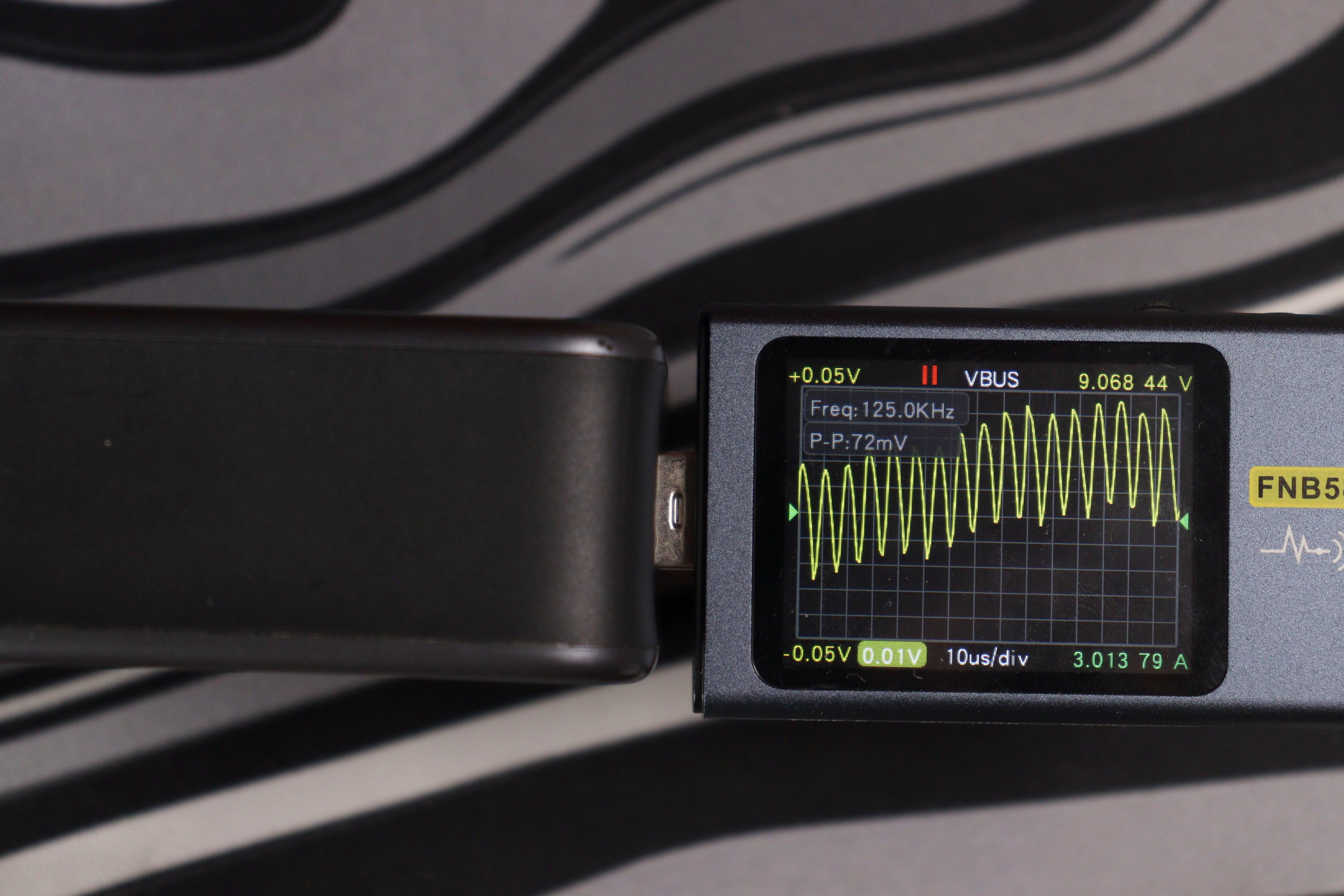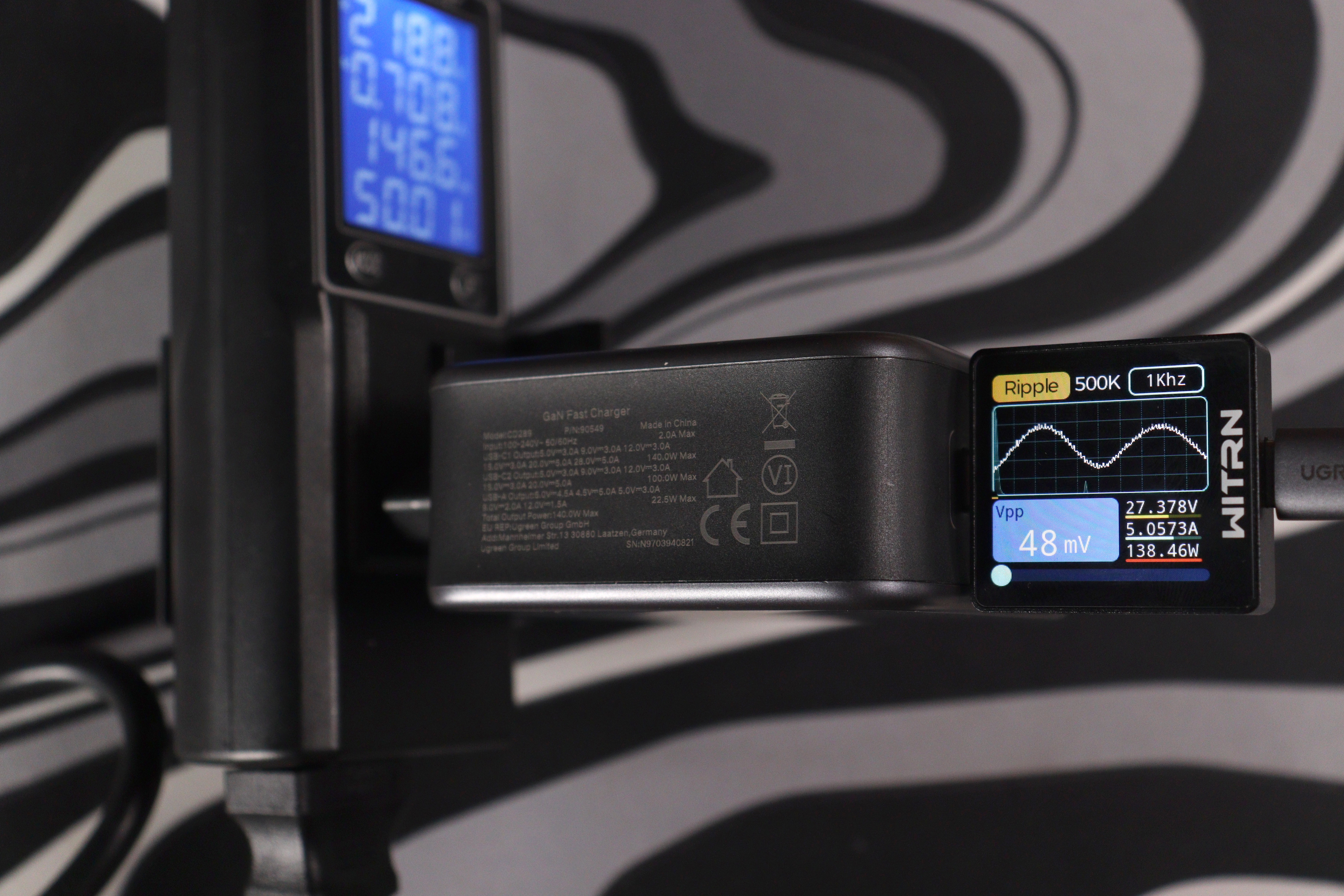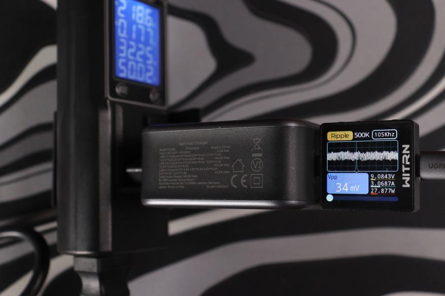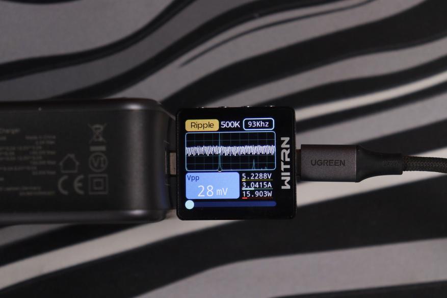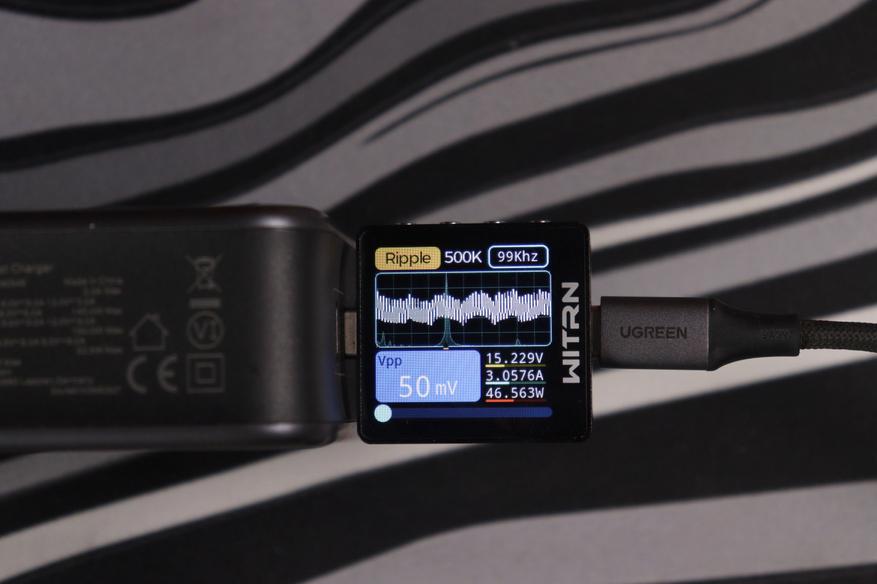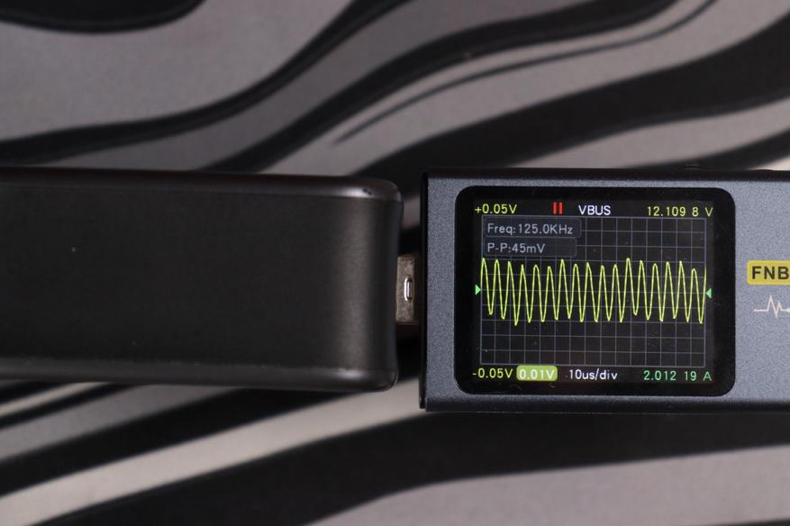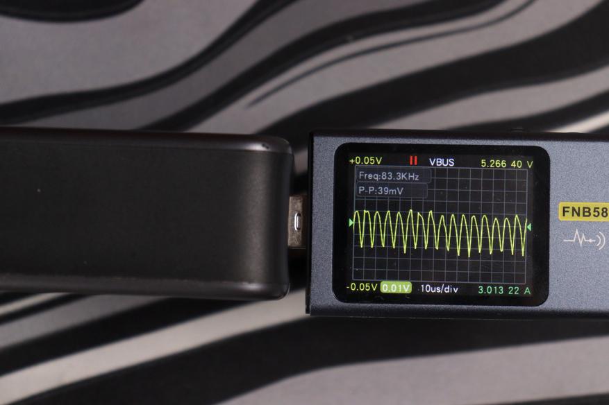 Отдельно проверил работу на максимуме в 140 ватт (около 28 вольт и 5 ампер по PD 3.1 EPR). Пульсации в этом режиме составили около 48 милливольт при частоте около 1 кГц — это уже низкочастотные пульсации, характерные для режима максимальной мощности, но по амплитуде всё равно в норме.