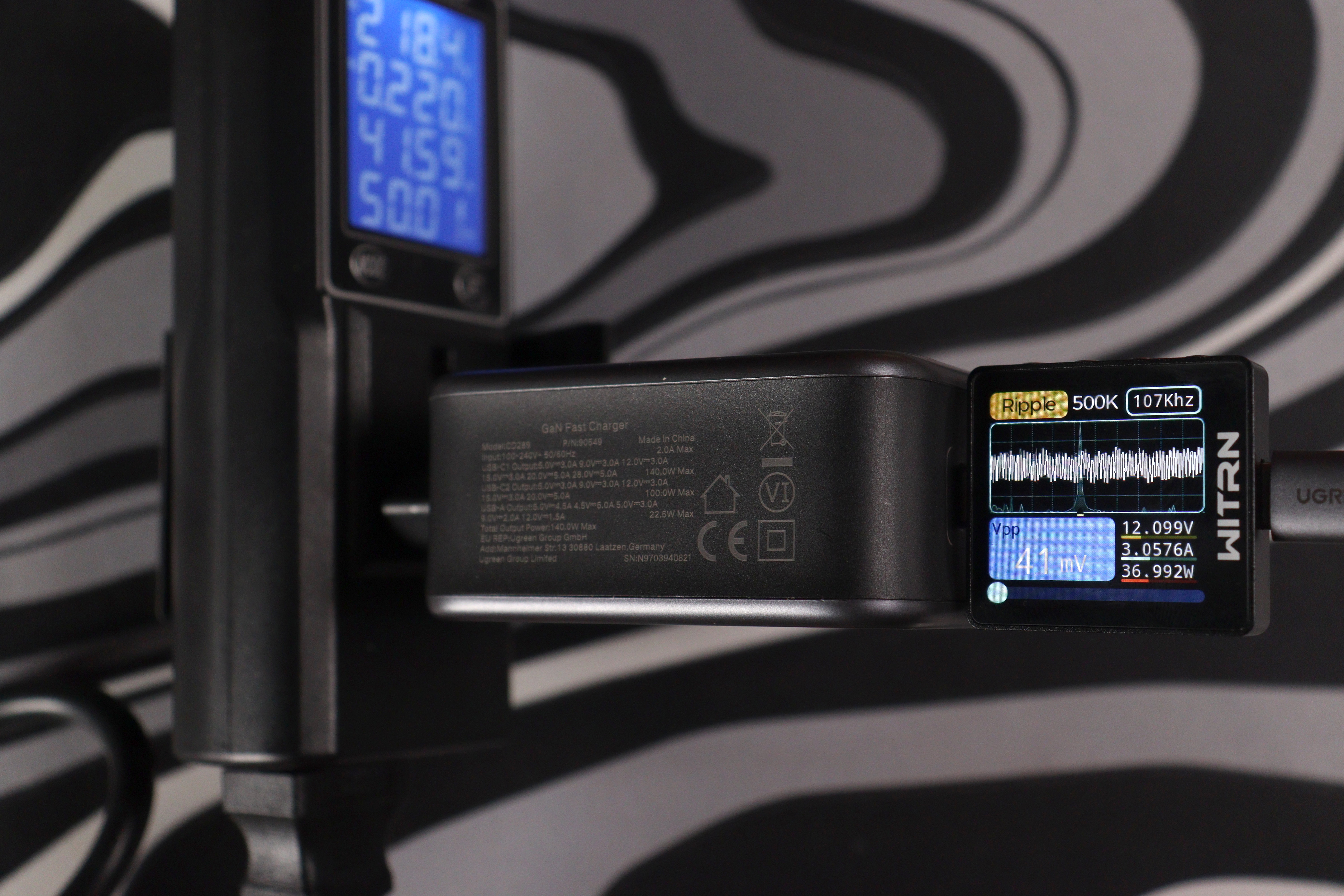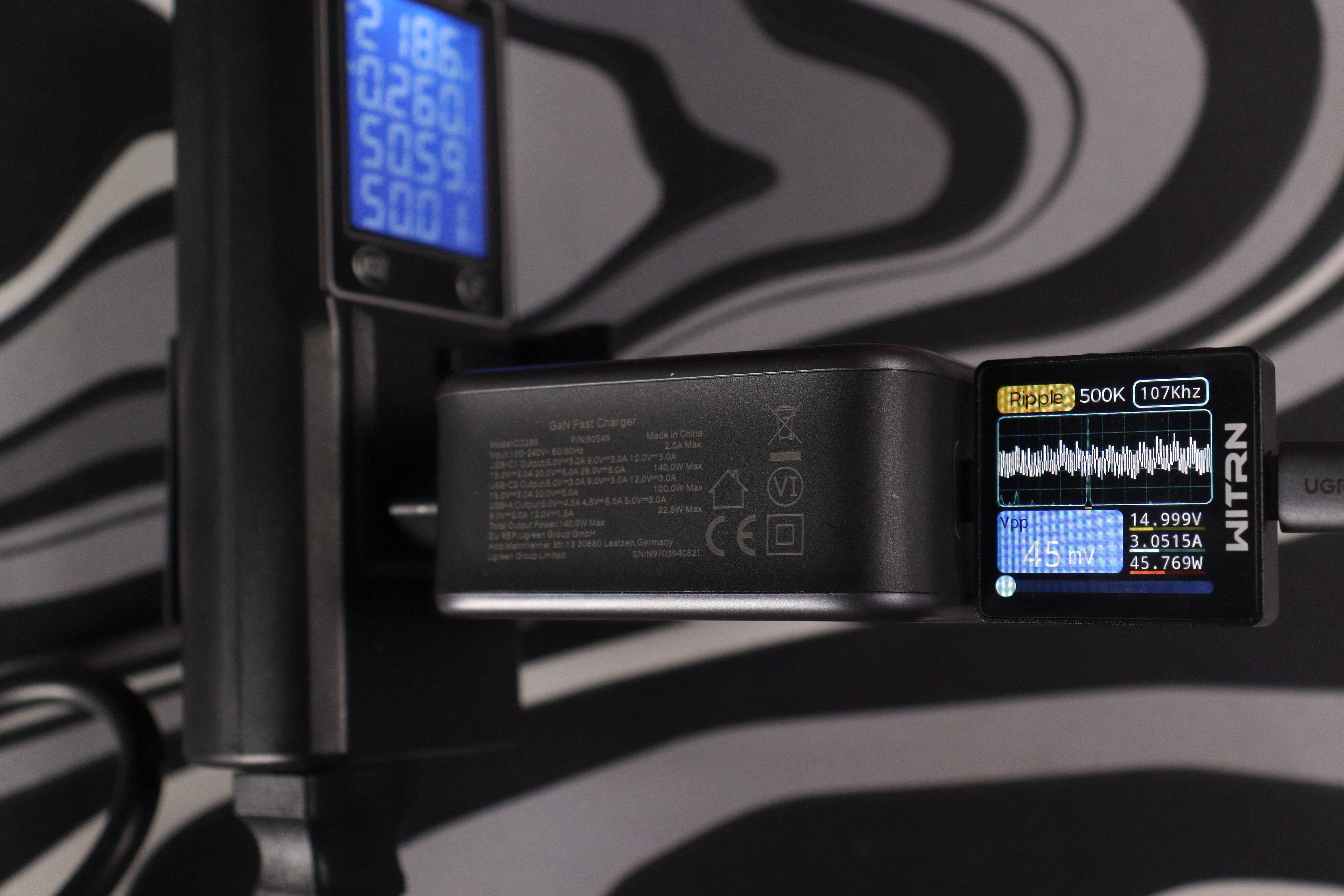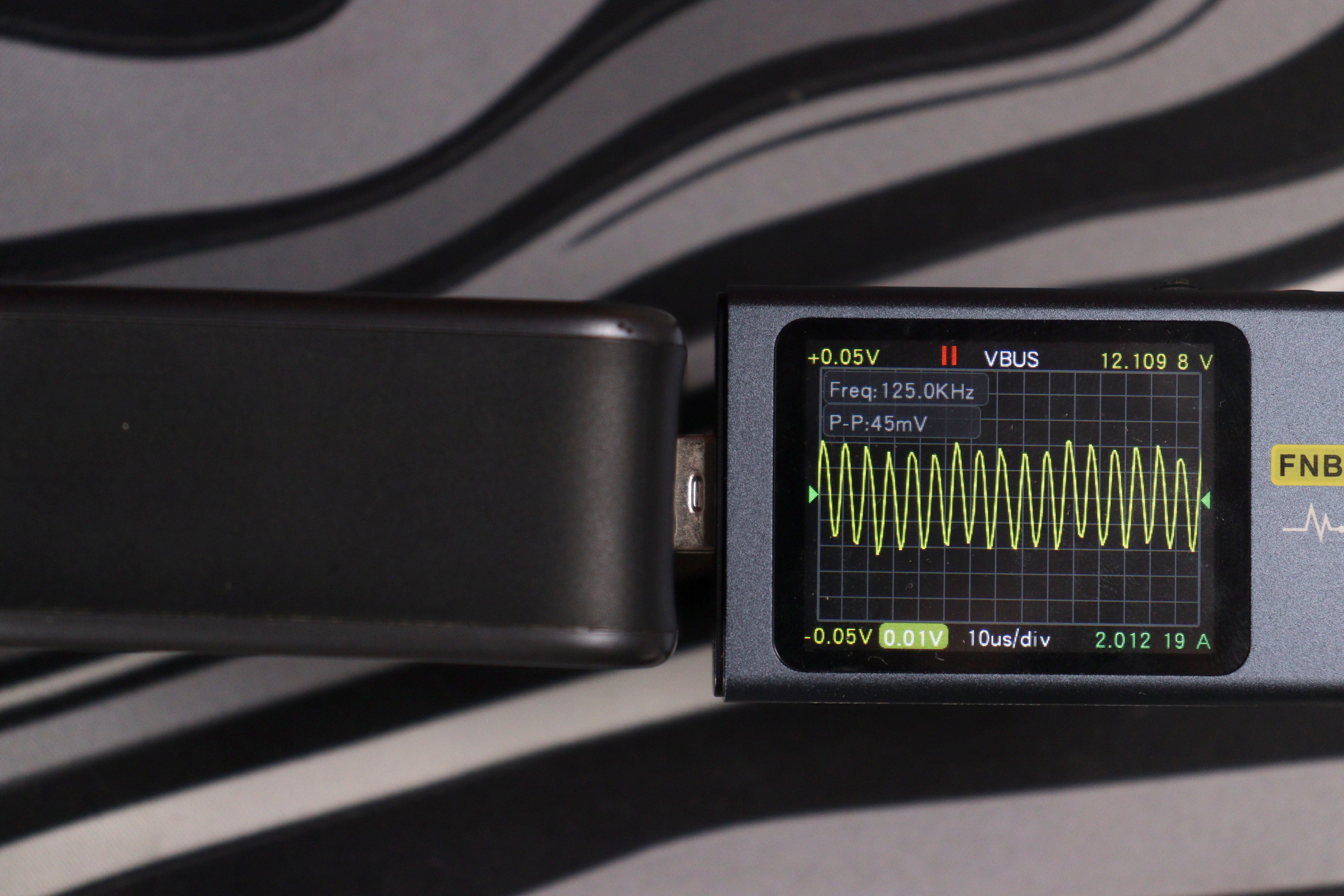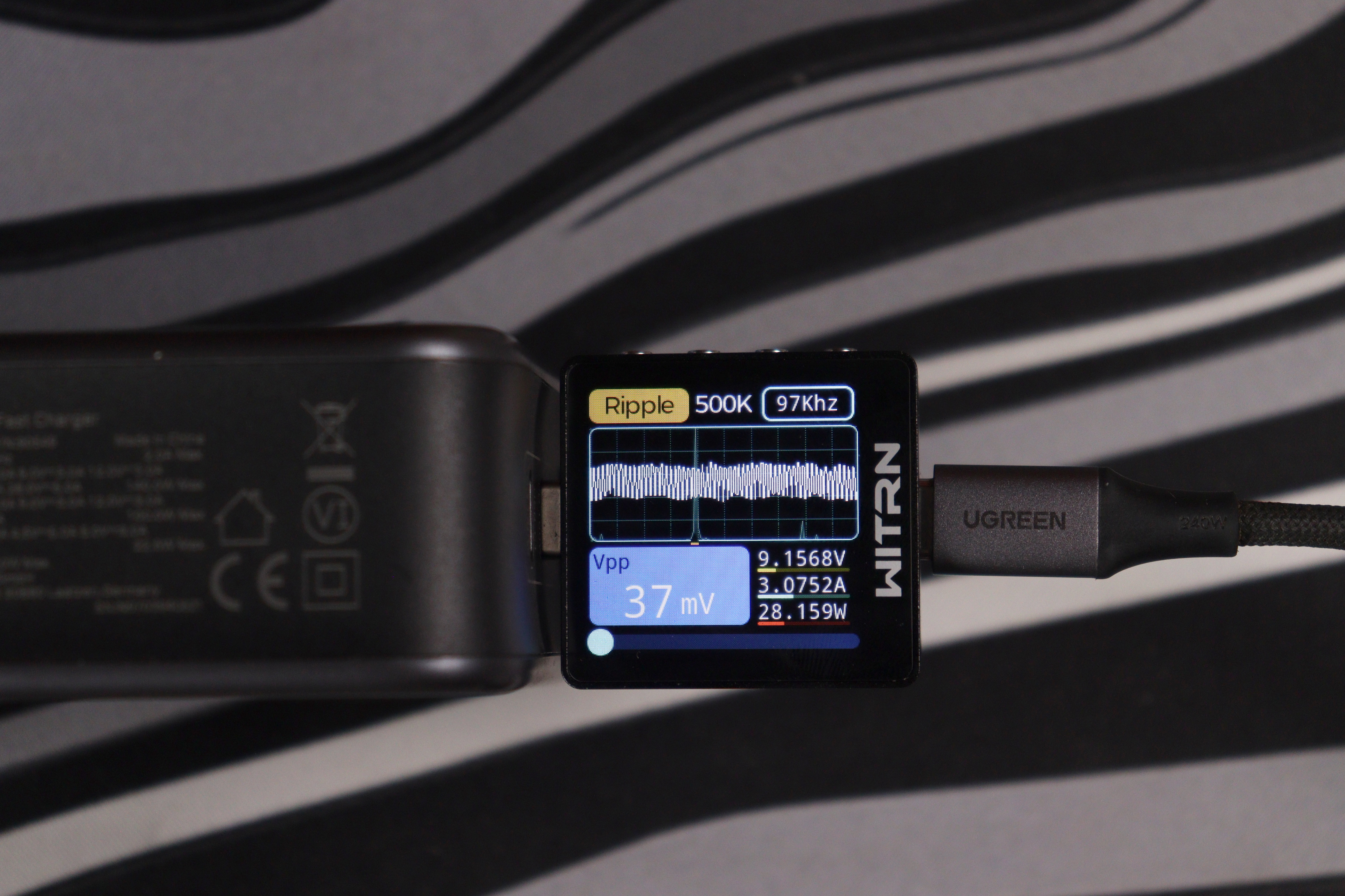 Отдельно проверил работу на максимуме в 140 ватт (около 28 вольт и 5 ампер по PD 3.1 EPR). Пульсации в этом режиме составили около 48 милливольт при частоте около 1 кГц — это уже низкочастотные пульсации, характерные для режима максимальной мощности, но по амплитуде всё равно в норме.