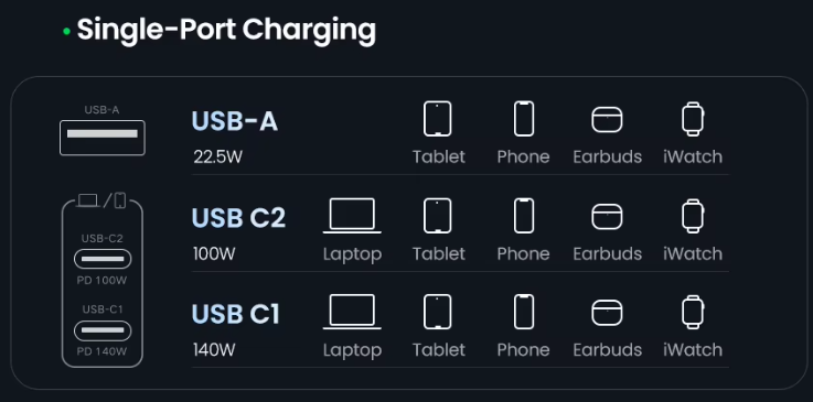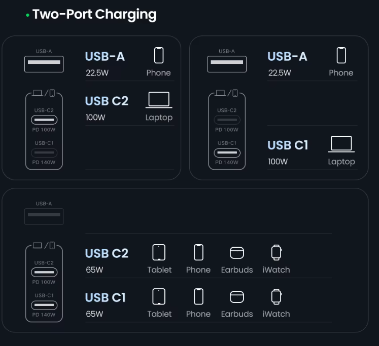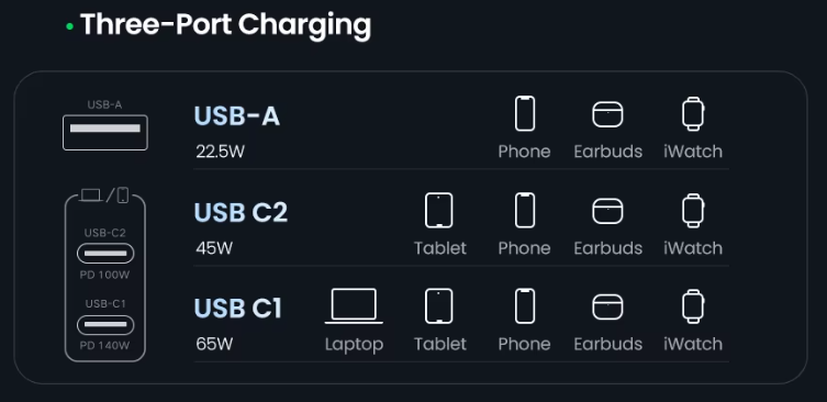 Распределение мощности в многопортовом зарядном устройстве осуществляется с помощью системы управления питанием, использует динамическую балансировку нагрузки, чтобы не превысить общую максимальную мощность устройства. Когда используется только один порт, он может обеспечить свою максимальную мощность, но при подключении двух или трех устройств зарядное устройство снижает мощность на каждом порту, отдавая приоритет портам USB-C для ноутбуков, в то время как менее мощный порт USB-A обычно сохраняет свою мощность, что подойдет. одновременную безопасную и эффективную зарядку всех подключенных гаджетов, включая ноутбуки, планшеты и телефоны. Порты не независимые, потому перезагружаются при подключении гаджета