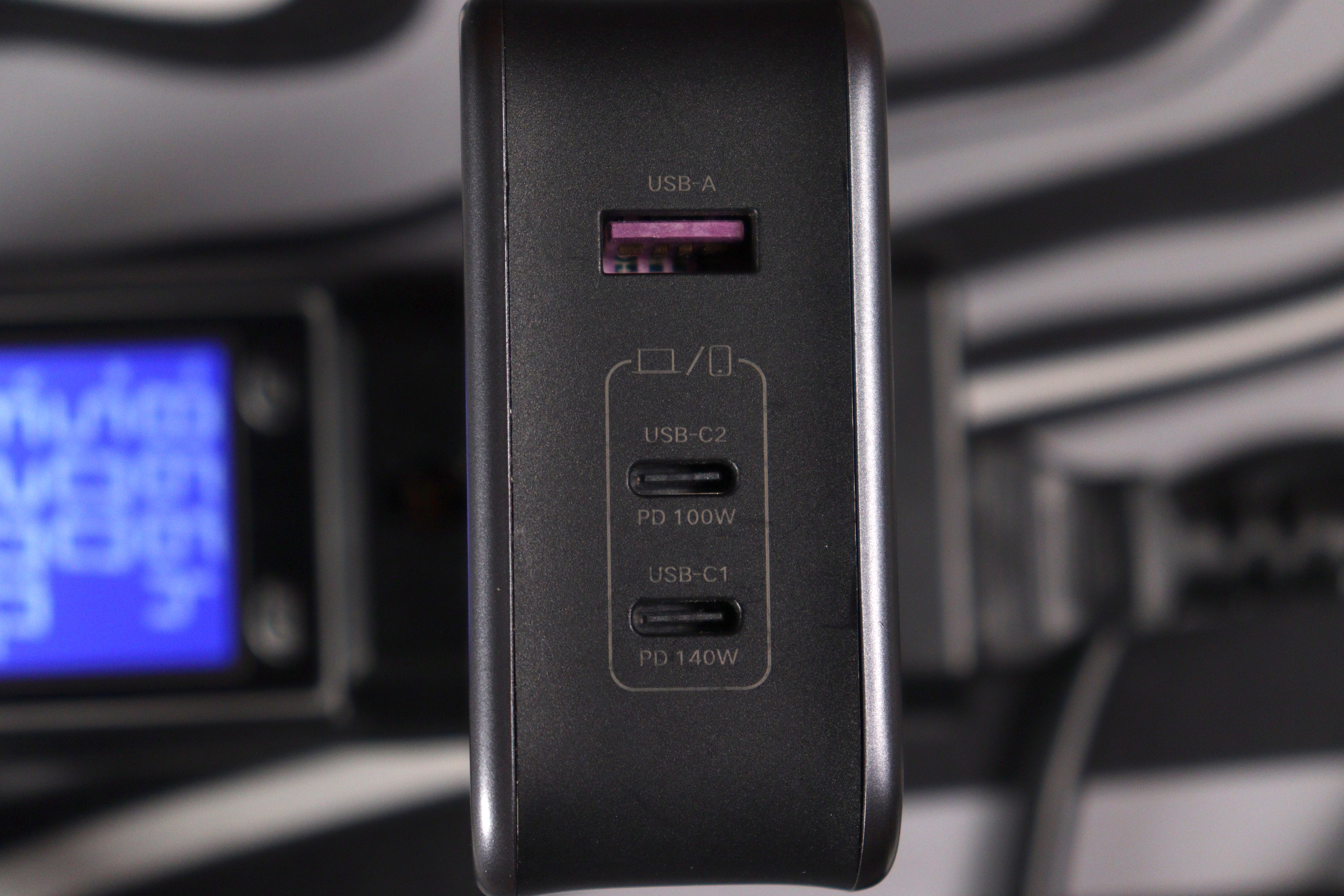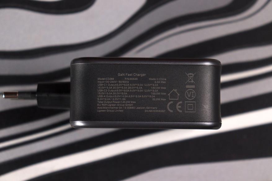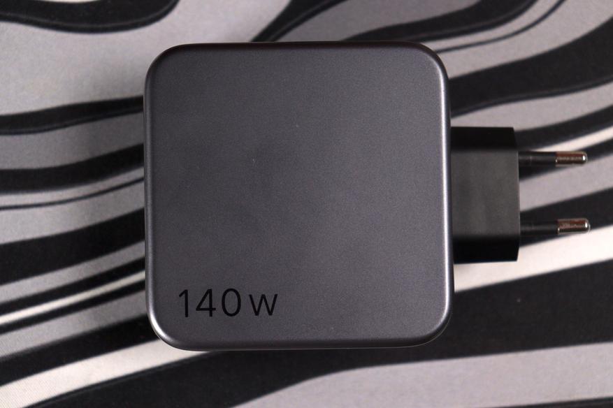 Корпус квадратный, матовый пластик тёмно-серого цвета. Никаких изысков в дизайне — просто функциональная коробочка. На лицевой панели три порта: два USB-C и один USB-A. Маркировка подсказывает, что C1 тянет до 140 ватт, C2 до 100 ватт, а USB-A выдаёт до 22,5 ватт. Евровилка несъёмная, что для путешествий не очень удобно, но для домашнего использования нормально.